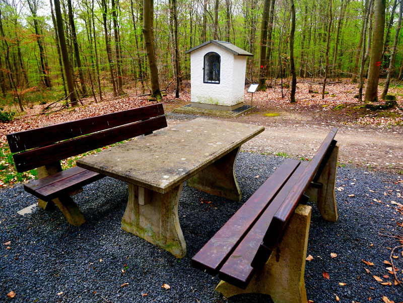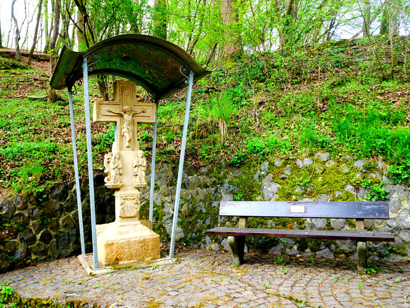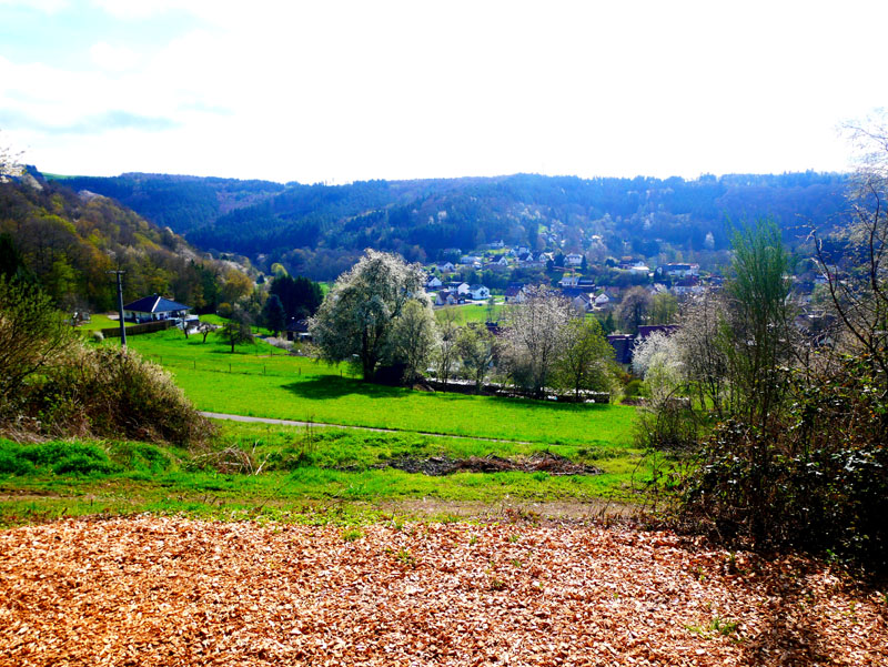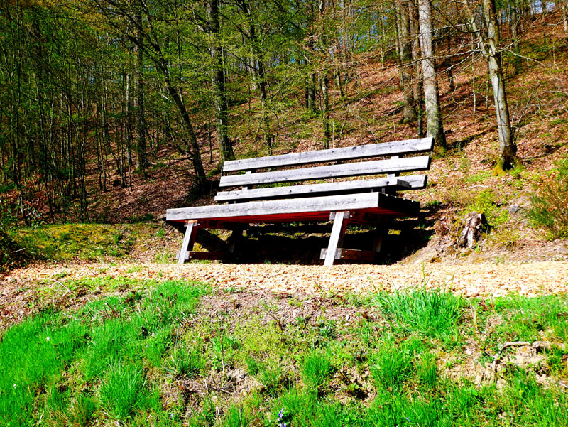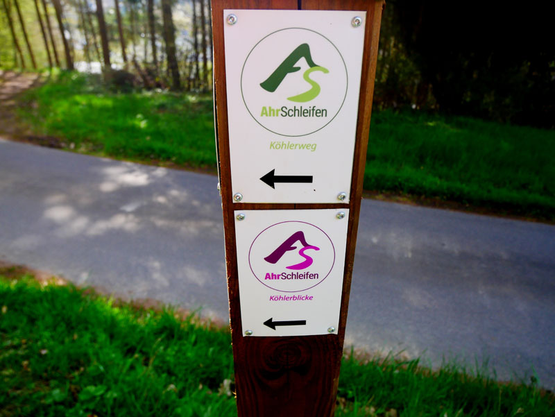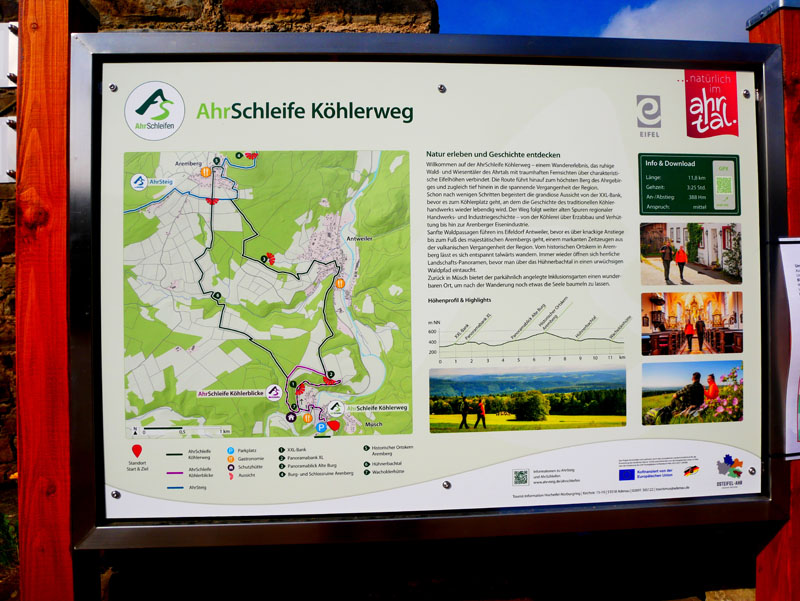 Wir beginnen die Wanderung mit der Überschreitung der Ahr über die Straßenbrücke der B258 und wandern mit der L73 an der Lachsräucherei Sion’s Räucherkammer vorbei. Zweimal linksschwenkend, erst durch die Sonnenstraße und dann durch den Heideweg, verlassen wir die Bebauung von Müsch. Am Waldrand treffen die Wanderer auf die Routenführung der AhrSchleife, der wir rechts abzweigend über asphaltierten Grund entgegen dem Uhrzeigersinn folgen. Wenig später zweigt zur linken Seite hin ein breiter Waldweg ab. Er führt zur XXL-Bank hinauf. Für eine Wanderrast ist es natürlich noch viel zu früh, trotzdem nehmen wir auf der Riesenruhebank Platz und genießen die schönen Talblicke auf den Start- und Zielort Müsch. Wenige Meter weiter wird der historische Köhlerplatz angelaufen. Eine hier anzutreffende Hinweistafel weiß zu berichten, wie ein Holzkohlenmeiler betrieben wurde. Noch heute sind im Wald rund um Müsch weitere Meilerplätze anzutreffen, auf denen Köhler im Mittelalter Holzkohle herstellten, die man damals zur florierenden Eisenverhüttung im Herzogtum Arenberg benötigte.