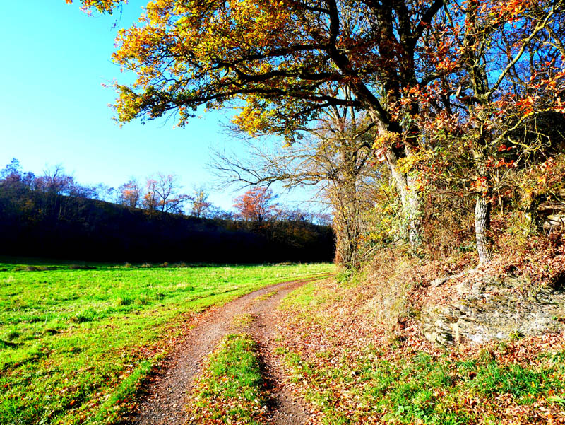An heißen Sommertagen sollte man das Traumpfädchen Polcher Paradiesweg besser nicht begehen. Denn Schatten spendende Passagen sind auf dem Spazierwanderweg nur in wenigen Teilabschnitten anzutreffen. Im sonnigbunten Herbst zeigt die kleine Route aber durchaus ihren Charme.