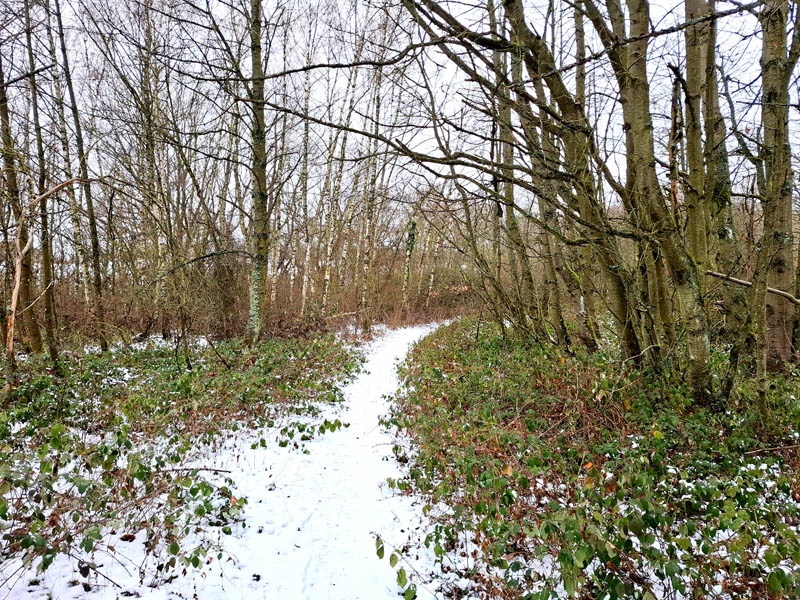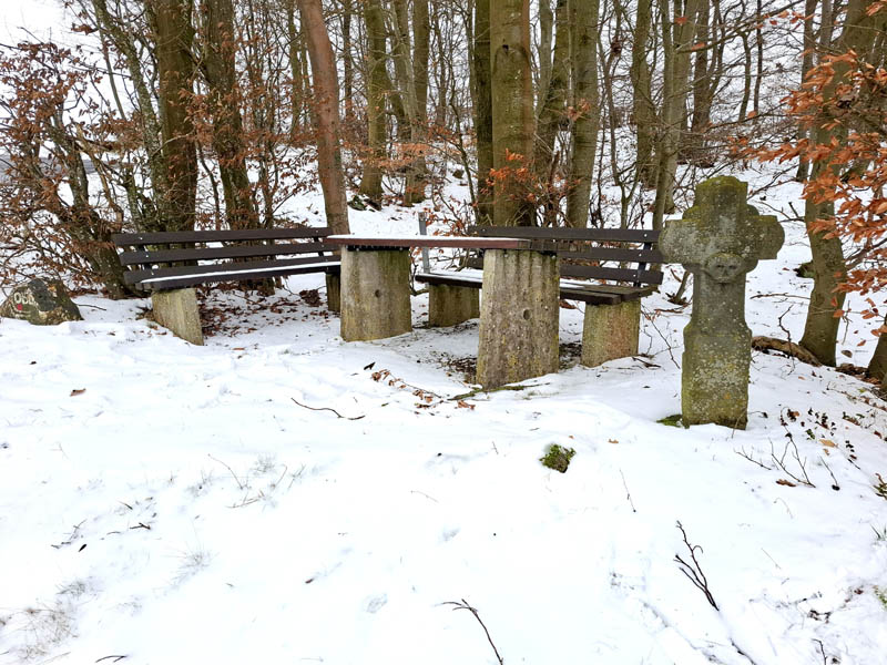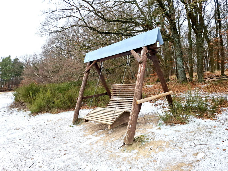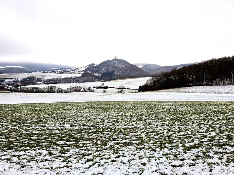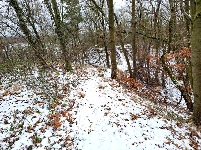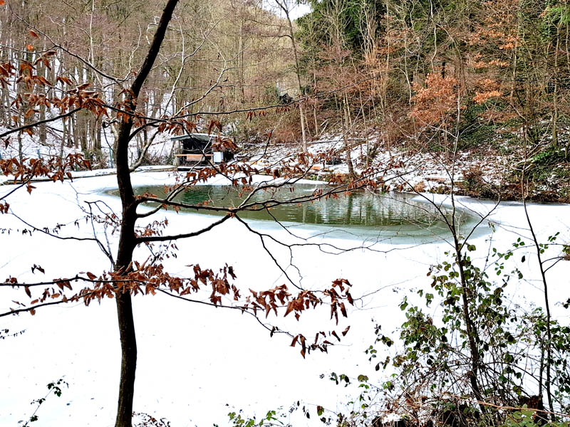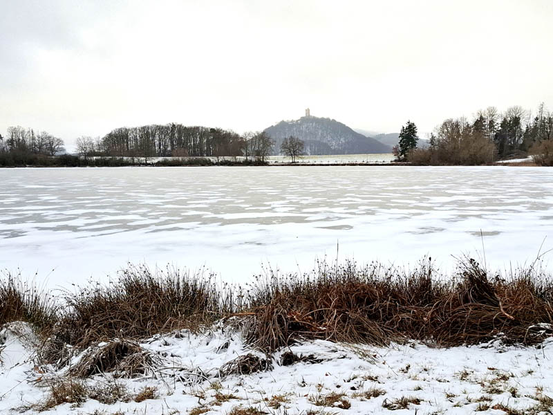 Wir beginnen die Rundwanderung auf dem Wanderparkplatz der Schutzhütte Brohltalblick, die über einen asphaltierten Wirtschaftsweg von Oberzissen, vorbei am Margarethenhof, gut zu erreichen ist. Hier steht kostenloser Parkraum zur Verfügung. Breite Feldwege über landwirtschaftliche Nutzflächen führen uns alsbald ebenen Fußen hinüber zum Rodder Maar. Eingebettet in die winterliche Maarheide verfügt der idyllische kleine See über eine Wasserfläche von ca. fünf Hektar, die jetzt im Januar mit einer Eisdecke versehen ist. Das Rodder Maar ist nicht vulkanischen Ursprungs. Es handelt sich also nicht um ein Maar. Ein Meteoriteneinschlag hingegen wird von einigen Wissenschaftlern als Entstehungsgrund für möglich gehalten. Im Mittelalter diente das Gewässer als Fischteich der adligen Geschlechter auf Burg Olbrück. Im Laufe der Jahrhunderte wurde es mehrmals trocken gelegt um landwirtschaftliche Nutzflächen zu gewinnen. Der heutige Zustand wurde 1998 herbeigeführt. Sämtliche Drainagerohre hat man geschlossen damit sich die mit Tonerde angereicherte Vertiefung durch Regeneintrag wieder mit Wasser füllen konnte.