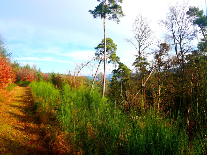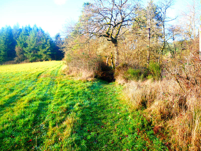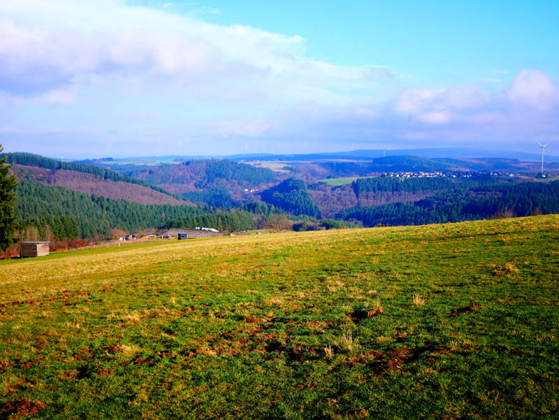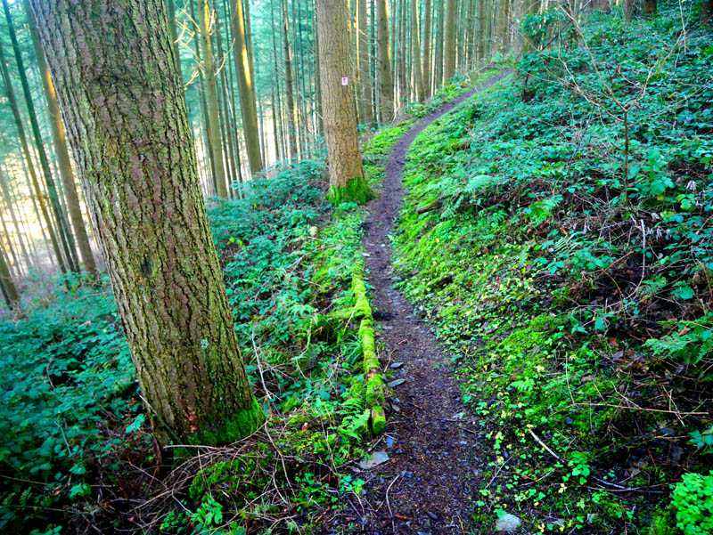 Wir starten in die Traumschleife vom Wanderparkplatz an der L148 gegenüber von Rüssels Landhaus, in dem nach der Wanderung abschließende Einkehr gehalten werden kann. Eine 300 Meter lange Zuwegung mit einem kurzen Anstieg führt hinauf zum eigentlichen Startpunkt der Tour. Entgegen des Uhrzeigersinns geht es sogleich nach rechts in das Spiesbachtal. Schon nach wenigen Metern ist im Wald der Spiesbach zu queren, um danach auf eine ausgedehnte Waldwiese hinaus zu treten. Am Waldrand passieren die Wanderer ein imposantes Insektenhotel und tauchen erneut in den lichten Forst ein. Im weiteren Verlauf zeigt sich die Traumschleife ausgesprochen pfadig. In halber Hanglage wird, nach dem Überschreiten der K87, bachaufwärts und überaus windungsreich durch das Schastebachtal gewandert. Mächtige Douglasien säumen hier den Weg, die man im Volksmund als die "12 Apostel" bezeichnet. Schließlich treffen wir im Oberlauf des Gewässers auf eine Wanderhütte, die zur Rast einlädt. Gleich neben der Hütte befindet sich ein vergitterter Stollen, den man seinerzeit zur Erzgewinnung in den Berg getrieben hat und der heute Fledermäusen als Unterschlupf und Winterquartier dient.