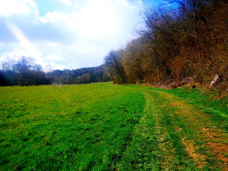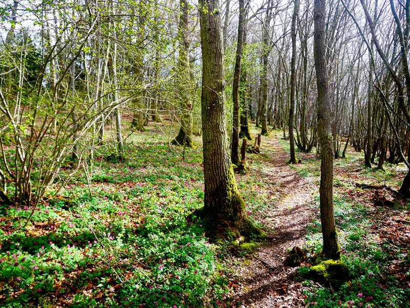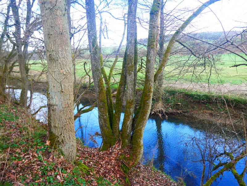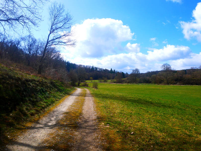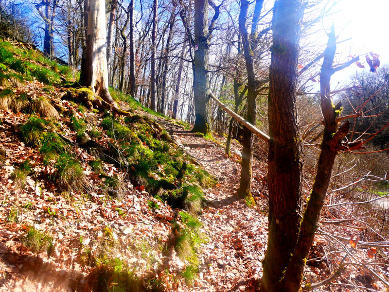 Wir beginnen die Wanderung am vorgesehenen Startpunkt der Traumschleife Domblick an der Simmerbachbrücke in der Hauptstraße des Hunsrückortes Ohlweiler. Ausreichende Parkmöglichkeiten befinden sich auf dem in der Dorfstraße „Im Farrich“ befindlichen Wanderparkplatz am Friedhof. Vom Traumschleifenportal an der Simmerbachbrücke führt uns ein breiter, fein geschotterter Weg mit der Routenführung des Schinderhannespfades unterhalb des Wochenendgebietes in das idyllische und schon frühlingshaft anmutende Simmerbachtal. Schon bald verlässt die Traumschleifenroute den breiten Weg und steigt mit einem schmalen Pfad links abzweigend in die Flanke des Eselsberges. Durch einen Buchbestand geht es bei ständigem Auf und Ab in halber Hanglage schlussendlich zu einem Aussichtspunkt hinauf, der herrliche Tiefblicke ins Simmerbachtal ermöglicht. Schließlich fällt die Route wieder zum Talgrund hinab und tritt unmittelbar an den Simmerbach heran. Erneut folgen die Wanderer dem breiten Weg entlang des Gewässers in Fließrichtung.