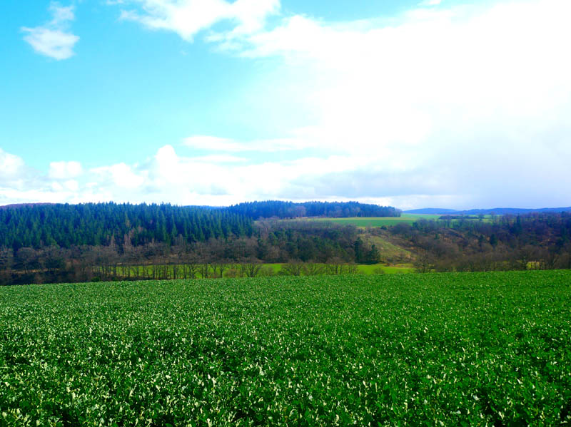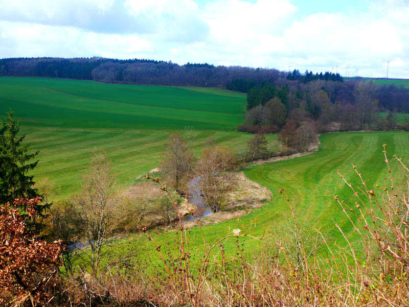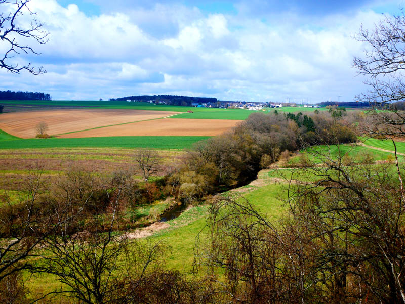 Vom Eselsberg fällt ein erregender Tiefblick ins windungsreiche Simmerbachtal