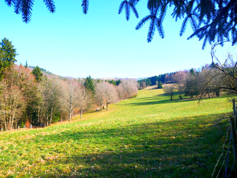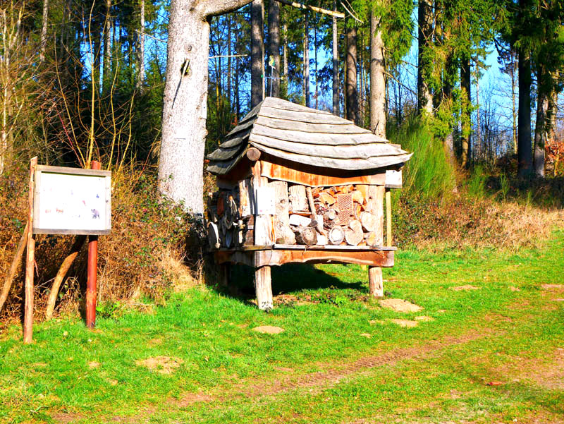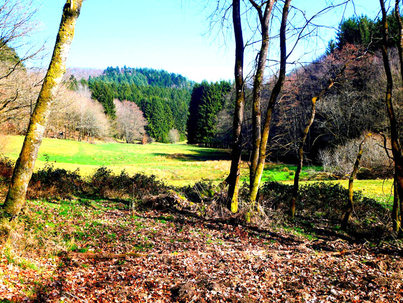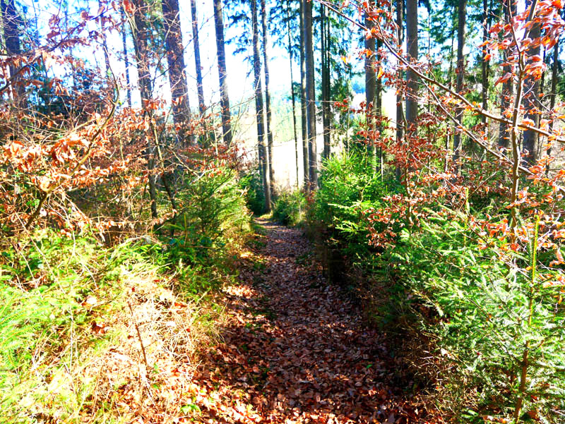 Wir beginnen die Wanderung an der Fischerhütte von Beuren. Direkt am Angelweiher wird kostenloser Parkraum zur Verfügung gestellt. Auf einem breiten Forstweg und wenig später auf einem mit Laub bedeckten Waldpfad geht es durch einen Buchen- und Eichenhallenwald. Ein kleines Gewässer, das dem Krennerichbach zustrebt, wird überschritten. Durch junge Fichtenbestände gelangen die Wanderer zuerst auf eine idyllische Waldschneise und wenig später zu einem rustikalen hölzernen Unterstand. Da es für eine Rast noch viel zu früh ist, folgen wir der Beschilderung ausgesprochen pfadig und windungsreich durch ein Gehölz. Die Wanderer passieren ein Biotopgewässer und folgen den Wegezeichen der Traumschleife auf einem breiten Forstweg in halber Hanglage hoch über dem Krennerichbach. Während das Gelände zur Rechten ziemlich steil ins Bachtal abbricht, zeigen sich links der Route am Wegrand und mitten im Wald immer wieder bizarre, von Moosen und Flechten bewachsene Gesteinsformationen, die jeden Naturfreund begeistern.