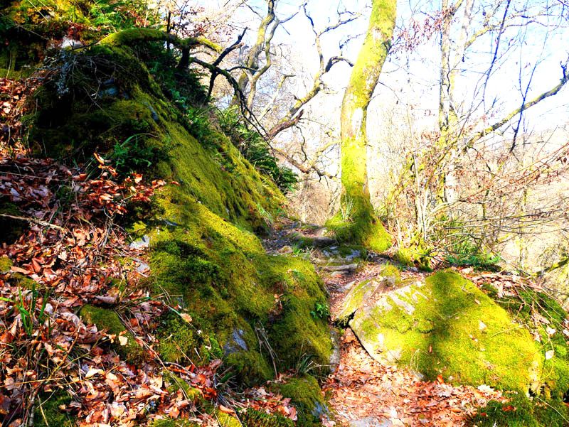Hoch über dem Tal des Krennerichbaches führt die Traumschleife an bemoosten Gesteinsformationen vorbei