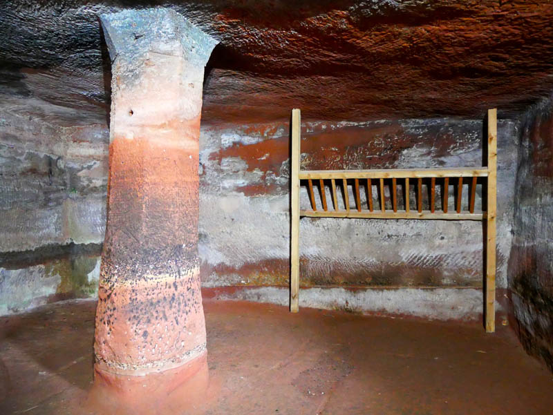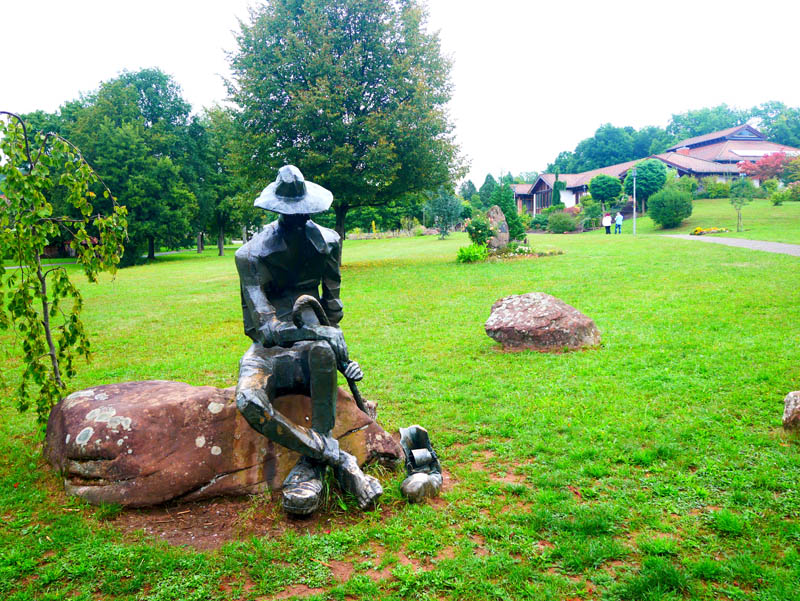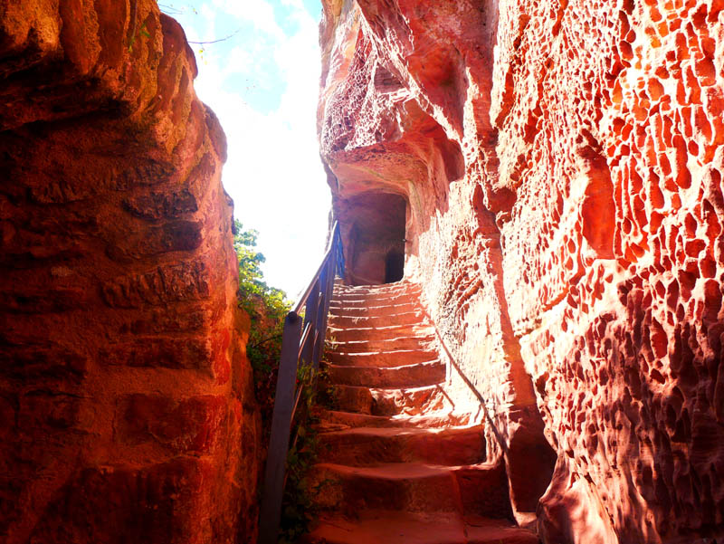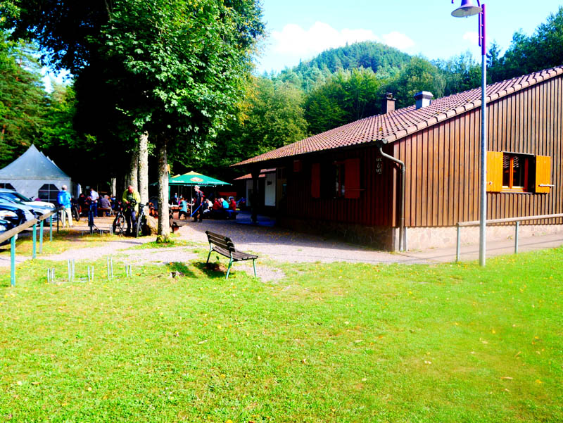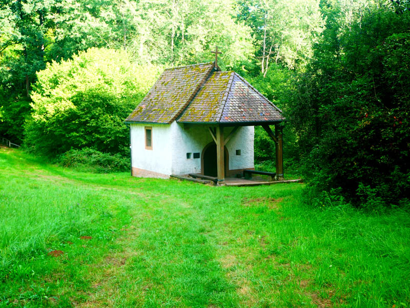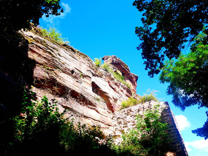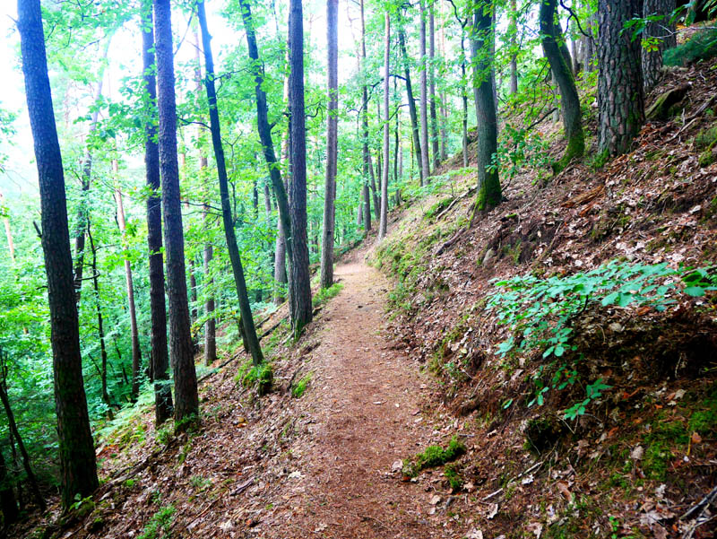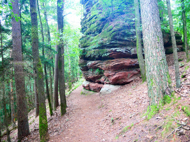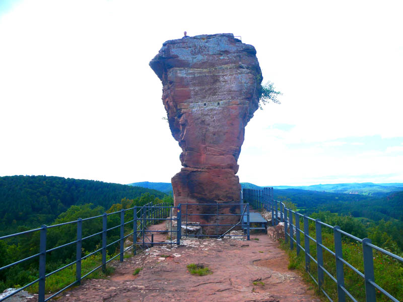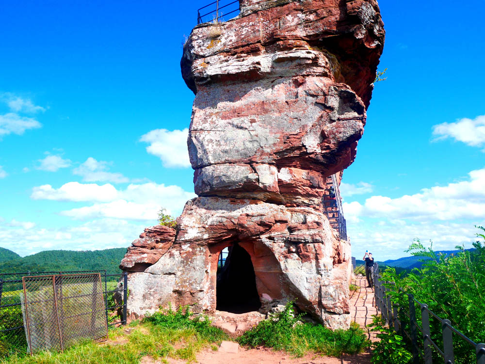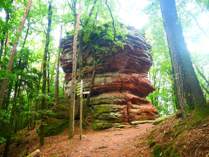 Am Haus des Gastes in Dahn steigen wir in die 8. Etappe des Pfälzer Waldpfades ein. Auf dem großen Parkplatz des parkähnlichen Geländes wird kostenloser Parkraum in genügender Zahl zur Verfügung gestellt. Mit dem Elwetritscheweg führt der Fernwanderweg am Elwetritsche-Denkmal vorbei. Im weiteren Verlauf beschreiben mehrere Schautafeln das Leben und die positiven Charaktereigenschaften dieser pfälzischen Fabeltiere. Auf weichen Wiesenpfaden geht es an sommerlichen Waldsäumen entlang, zum Ehrenfriedhof und zur Michaelskapelle hinauf. Nach weiterem Bergaufstieg treffen die Wanderer mitten im Wald auf eine gigantische Buntsandsteinformation. Hier besteht die Möglichkeit scharf rechtsschwenkend einen Abstecher zum Hochsteinmassiv zu unternehmen. Schmale Waldpfade führen zu diesem aussichtsreichen Felsenhorst hinüber, der traumhafte Ausblicke ins Dahner Felsenland möglich macht. Jenseits des Tales zeigen sich dicht bewaldete Höhenzüge auf denen Buntsandsteinfelsen über den Baumwipfeln emporragen.