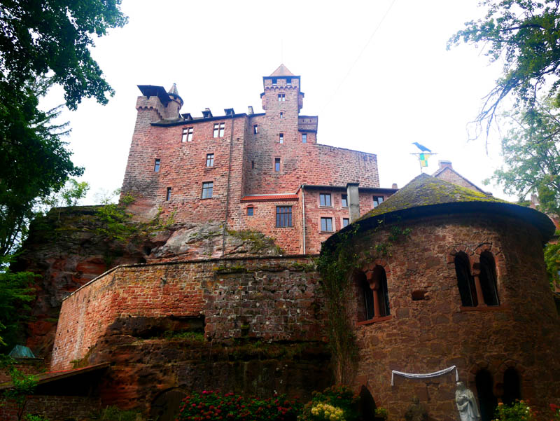 Wir beginnen die Wanderung in der Dorfmitte von Erlenbach. An der dort anzutreffenden Bushaltestelle wird kostenloser Parkraum bereit gehalten. Gleich zu Beginn zeigt sich der Fernwanderweg recht pfadig und steigt mit dem Felsenland-Sagenweg zur Burg Berwartstein hinauf. Das sehenswerte mittelalterliche Gemäuer ist die einzige noch bewohnte Burg im Wasgau. Erstmals urkundlich erwähnt im Jahre 1152 als Reichsburg der salischen und staufischen Herrscher, gilt sie auch als Raubritternest des Marschalls Hans Trapp, der eigentlich Hans von Trotha hieß und sich zu einer Dauerfehde mit dem benachbarten Kloster Weißenburg hinreißen ließ. Ihr heutiges Aussehen erhielt Burg Berwartstein ausgangs des 19. Jahrhunderts. Der Besitzer Theodor von Baginski ließ sie in der sichtbaren Form ausbauen. Heute kann man im Burghof der Burg Berwartstein Einkehr halten und in dem historischen Gemäuer sogar übernachten.