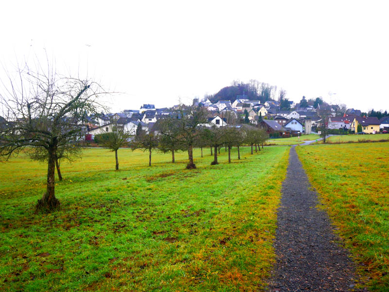 Mehrere Möglichkeiten bieten sich an, um in die GeoRoute Watzenhahner Riesen zu starten. Neben dem Wanderparkplatz Kranstein an der K95 stehen die Westerwaldorte Weltersburg, Berzhahn und Girkenroth als Startpunkte zur Verfügung. Wir entscheiden uns für die letztere Variante und beginnen die Tour vom Friedhofsparkplatz in Girkenroth. Gleich zu Beginn überqueren wir die K97 und treffen jenseits der Asphaltpiste auf die Wegführung der GeoRoute, die vom Ruhberg kommend rechtsseitig einmündet. Wir durchwandern ein lichtes Gehölz, streifen den Ortsrand von Girkenroth und wandern sodann ebenen Fußes über weiche Wiesenwege nach Weltersburg. Der kleine Westerwaldort gruppiert sich um die steil abfallenden Flanken des 436 Meter hohen Burgbergs, auch Weltersburger Kopf genannt.