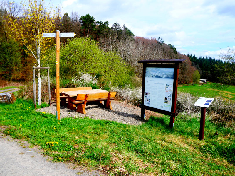 Wir beginnen die Wanderung mit der Überschreitung der Ahr über die Straßenbrücke der B258 und wandern mit der L73 an der Lachsräucherei Sion’s Räucherkammer vorbei. Zweimal linksschwenkend, erst durch die Sonnenstraße und dann durch den Heideweg, verlassen wir die Bebauung von Müsch. Am Waldrand treffen die Wanderer auf die Routenführung der AhrSchleife, der wir rechts abzweigend über asphaltierten Grund entgegen dem Uhrzeigersinn folgen. Wenig später zweigt zur linken Seite hin ein breiter Waldweg ab. Er führt zur XXL-Bank hinauf. Für eine Wanderrast ist es natürlich noch viel zu früh, trotzdem nehmen wir auf der Riesenruhebank Platz und genießen die schönen Talblicke auf den Start- und Zielort Müsch. Wenige Meter weiter wird der historische Köhlerplatz angelaufen. Eine hier anzutreffende Hinweistafel weiß zu berichten, wie ein Holzkohlenmeiler betrieben wurde. Noch heute sind im Wald rund um Müsch weitere Meilerplätze anzutreffen, auf denen Köhler im Mittelalter Holzkohle herstellten, die man damals zur florierenden Eisenverhüttung im Herzogtum Arenberg benötigte.