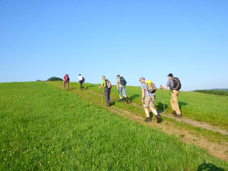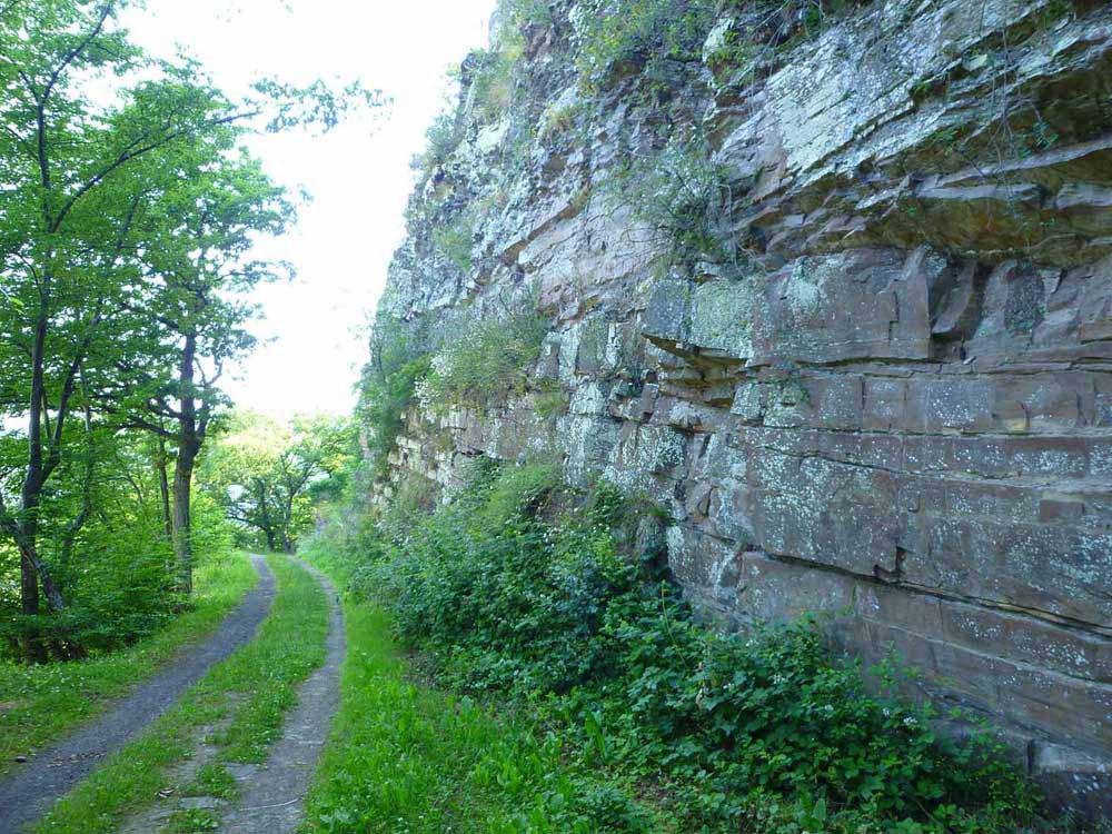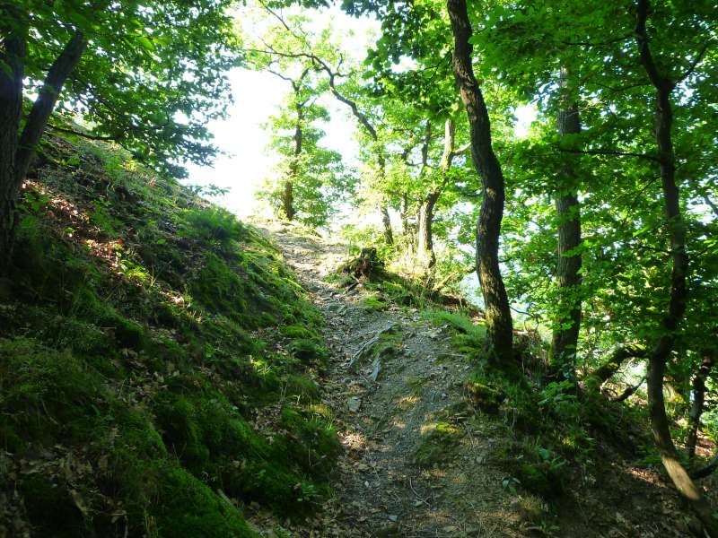 Über eine holprige Pflasterstraße geht es zum höchsten Punkt des Ahrsteigs dem 623 Meter hohen Aremberg hinauf