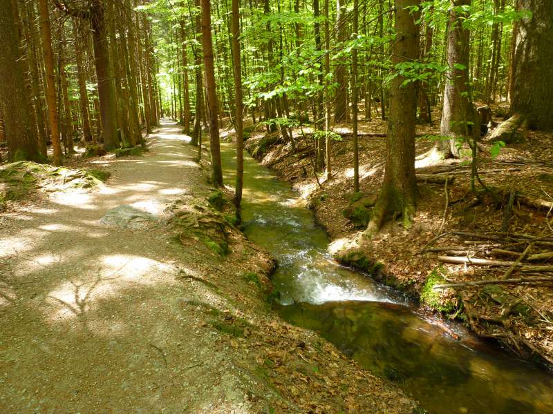 Durch Sturmbruch und Borkenkäferbefall entstandene urwaldartige Gebiete werden auf dem zwölf Kilometer langen Urwaldsteig durchwandert, der bei Bayerisch Eisenstein durch den Nationalpark Bayerischer Wald führt. In den Urwaldparzellen findet eine Waldbewirtschaftung nicht mehr statt. So ragen abgestorbene Baumstümpfe gewaltiger Fichten am Wegrand auf und vermoderndes Totholz uralter Baumriesen liegt im Wald herum. Auf schmalen, geheimnisvollen Wurzelpfaden windet sich der Goldsteig durch diese urwüchsige Waldlandschaft.