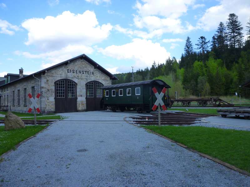 Vom Localbahnmuseum am Ortsrand von Bayerisch-Eisenstein wandern wir zum Hochbergsattel hinauf. Immer wieder quert der urige Steig dabei die breite Forststraße, bevor wir auf dem Bergsattel eine Wanderhütte erreichen. Nach kurzer Rast folgt die Gruppe dem Goldsteig sanft bergab. Kleine, murmelnde Bäche werden gequert. Dann erreichen die Wanderer den Watzlik-Hain.