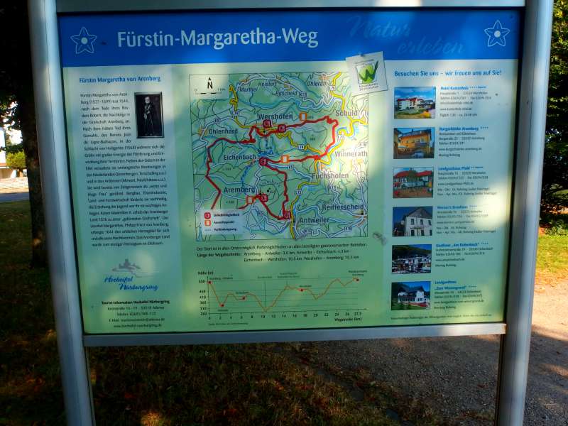Auf den Spuren der Fürstin Margaretha von Marck-Arenberg, die im 16. Jahrhundert auf Burg Arenberg residierte, führt diese schöne, rund 30 Kilometer lange Rundwanderung durch das ehemalige Herzogtum Arenberg im Adenauer Land. Die Ortschaften Wershofen, Eichenbach, Antweiler und Aremberg sind in die abwechslungsreiche Streckenführung eingebunden, die fast vollständig auf breiten Wald- und Wiesenwegen in ständigem Auf- und Ab durch das hügelige Ahrgebire läuft und in verträumte Tallagen hinein fällt. Schmale Pfade sind leider recht selten anzutreffen. Trotzdem weiß die Runde mit ihren herrlichen Weitsichten trefflich zu punkten.