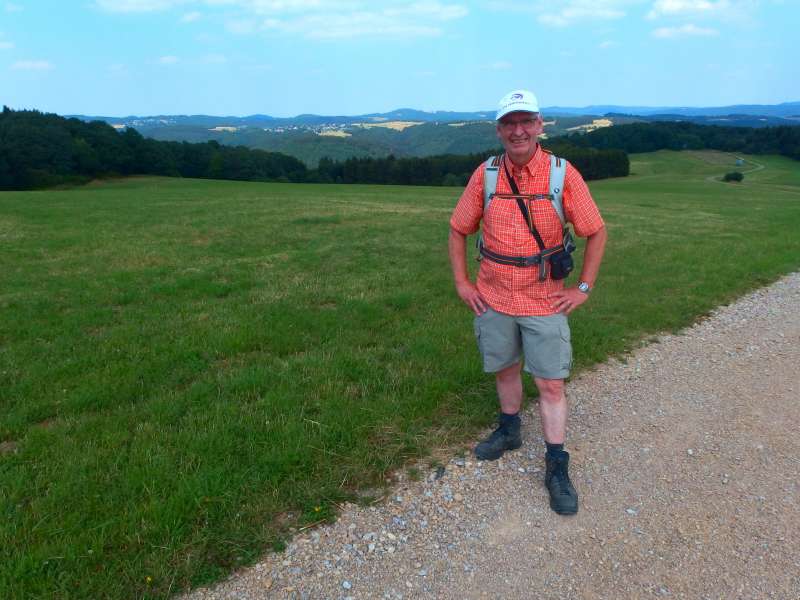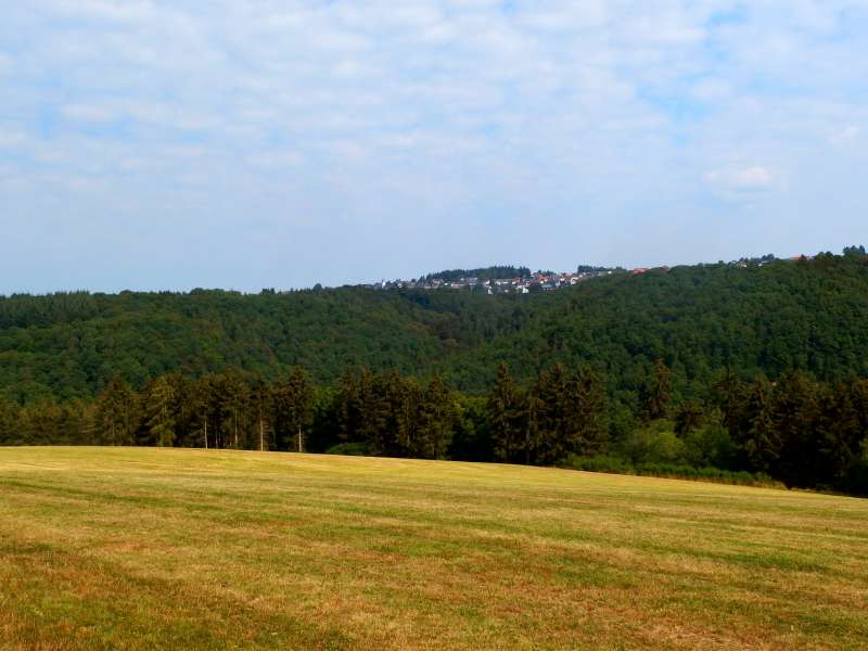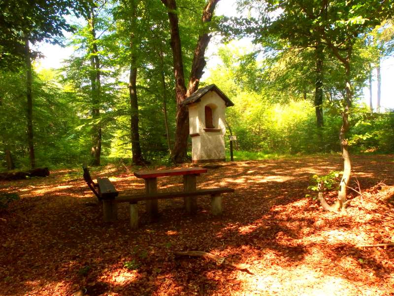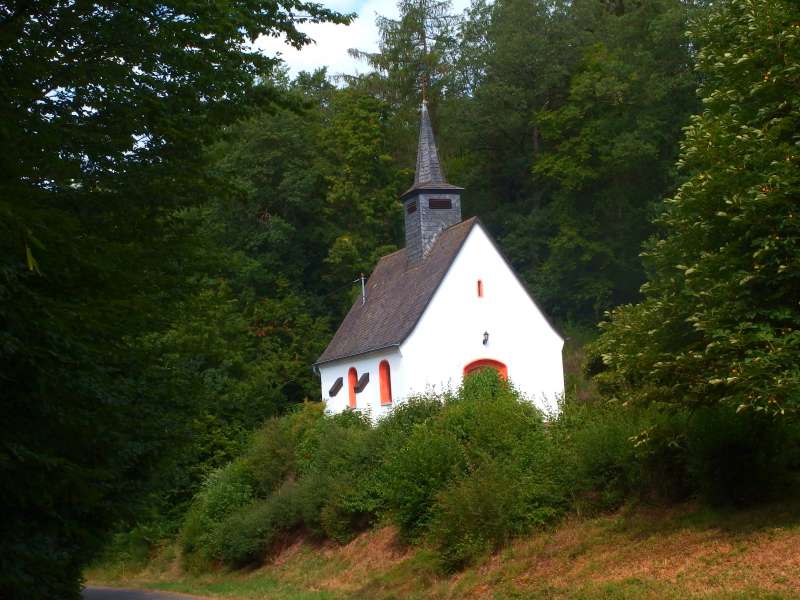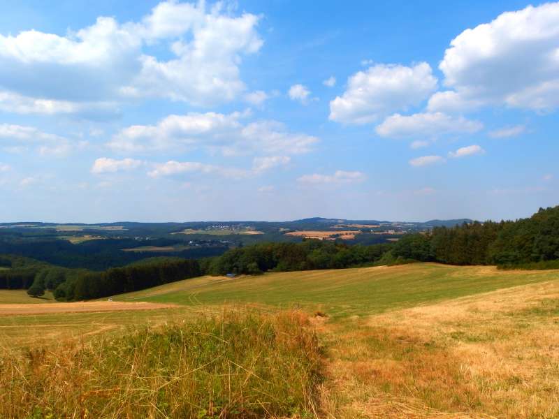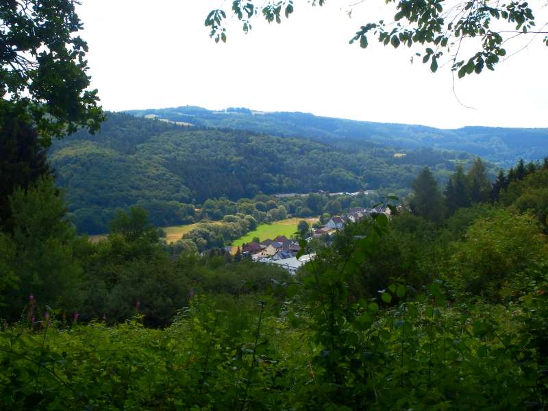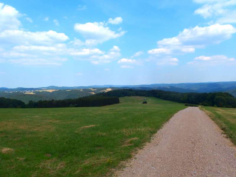 In der Ortsmitte von Wershofen steigen wir in die Rundwanderung ein und informieren uns anhand der dort installierten Info-Tafel über den Streckenverlauf. An einem kleinen Dorfteich vorbei verlassen wir die Ortschaft und folgen ausgangs der Bebauung der Beschilderung auf einem geschotterten Fahrweg hinauf zu einer kleinen Kapelle, die uns direkt neben dem schlicht gehaltenen Kottenborner Kreuz erwartet. Von der Anhöhe, die genau 500 Meter über dem Meeresspiegel liegt, genießen wir die phantastischen Fernsichten über das hügelige Ahrgebirge. Im Norden, also jenseits des Armuthsbachtales, zeigen sich zwischen Weideflächen und Waldparzellen die Ortschaften Olerath, Hilterscheid und Sasserath, während nach Südsüdosten hin die Nürburg am Horizont gerade noch auszumachen ist.