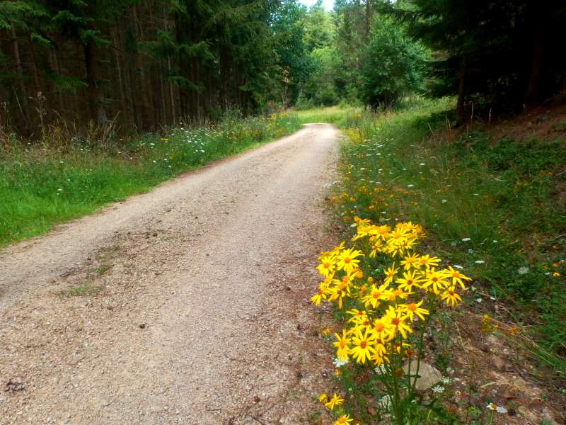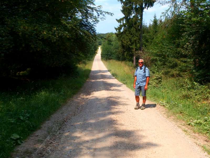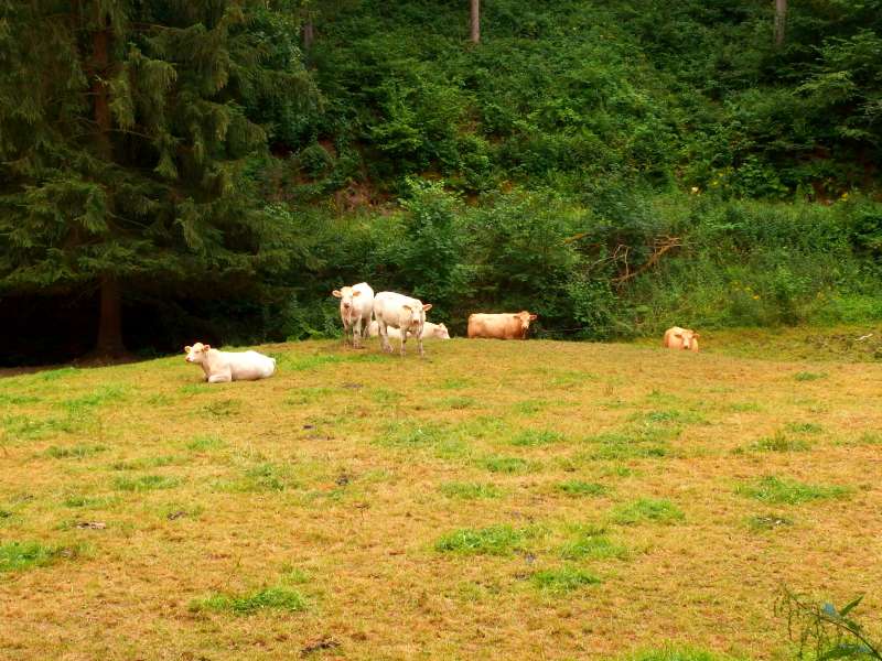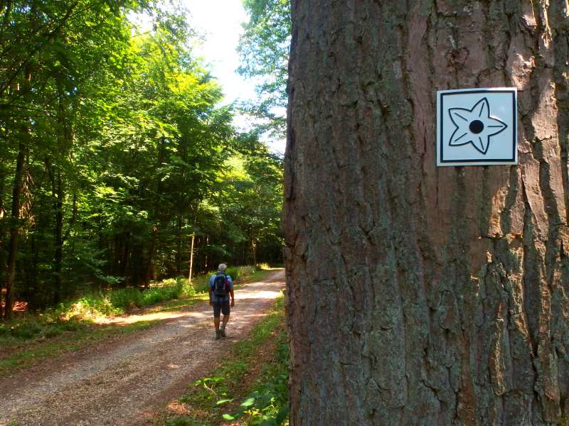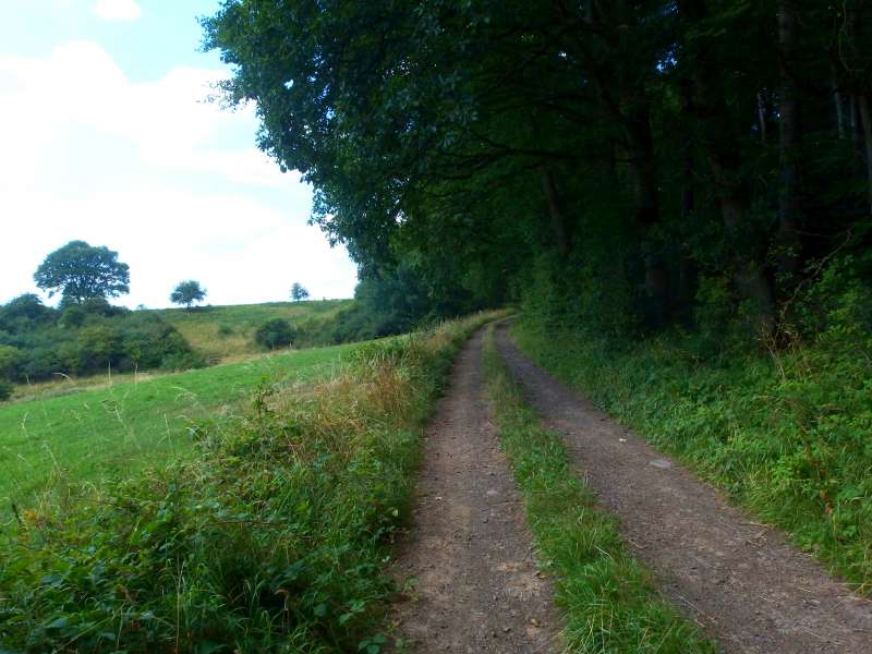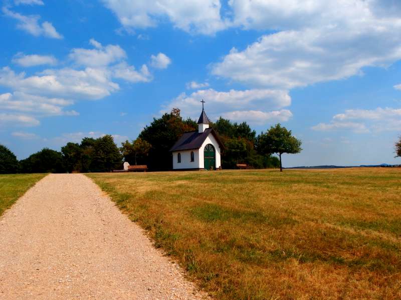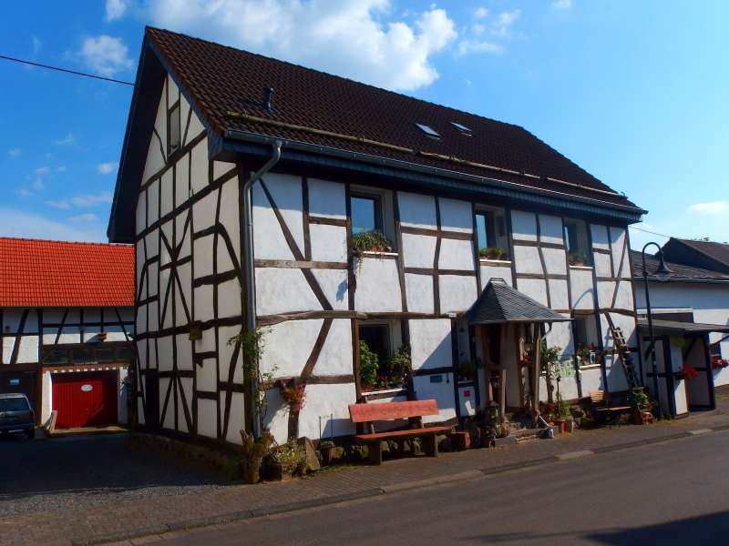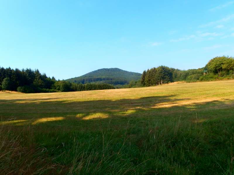 In der Ortsmitte von Wershofen steigen wir in die Rundwanderung ein und informieren uns anhand der dort installierten Info-Tafel über den Streckenverlauf. An einem kleinen Dorfteich vorbei verlassen wir die Ortschaft und folgen ausgangs der Bebauung der Beschilderung auf einem geschotterten Fahrweg hinauf zu einer kleinen Kapelle, die uns direkt neben dem schlicht gehaltenen Kottenborner Kreuz erwartet. Von der Anhöhe, die genau 500 Meter über dem Meeresspiegel liegt, genießen wir die phantastischen Fernsichten über das hügelige Ahrgebirge. Im Norden, also jenseits des Armuthsbachtales, zeigen sich zwischen Weideflächen und Waldparzellen die Ortschaften Olerath, Hilterscheid und Sasserath, während nach Südsüdosten hin die Nürburg am Horizont gerade noch auszumachen ist.