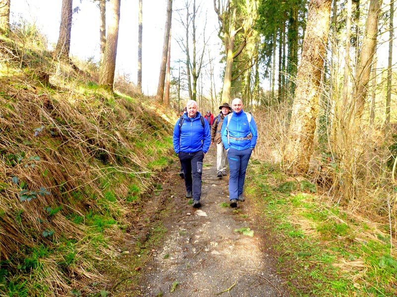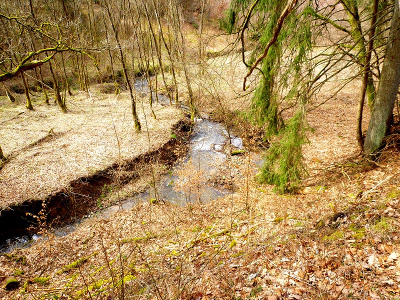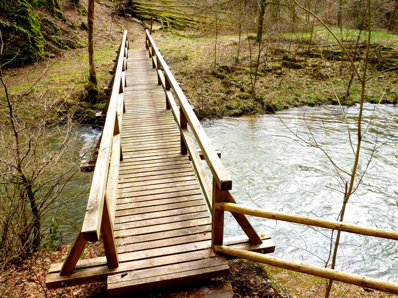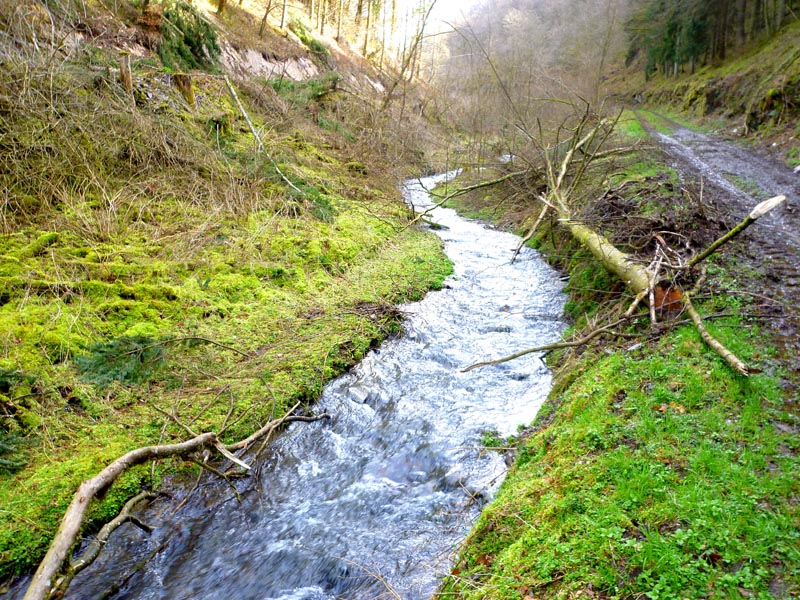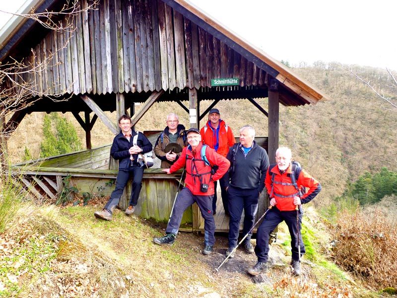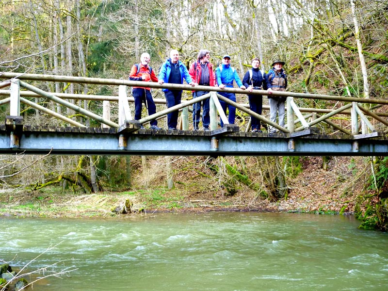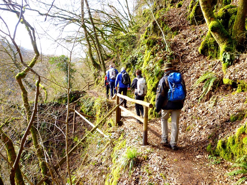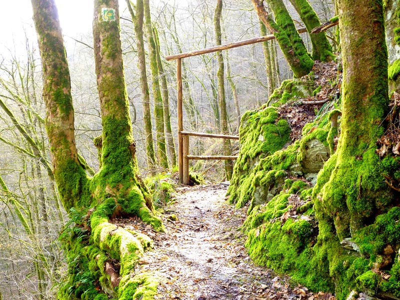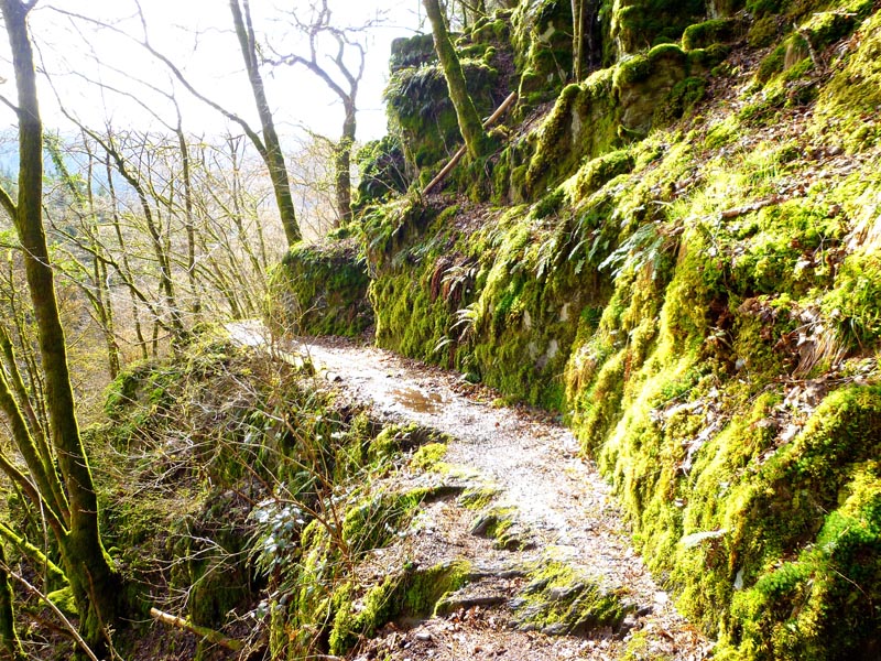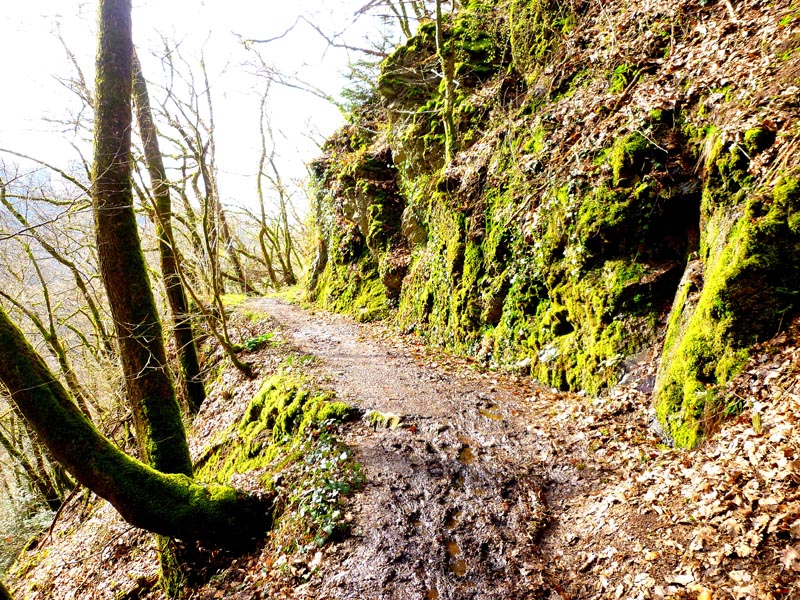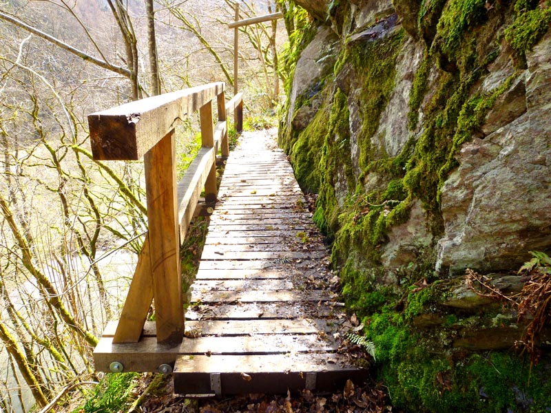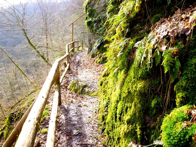 Vom Burgenblick folgen wir dem Lieserpfad des Eifelvereins und dem Eifelsteig in das Liesertal hinein. Im nun folgenden Teilabschnitt ist überaus bedachtsames Wandern erforderlich, fällt doch das Gelände nach links ins Bodenlose, während zur Rechten bemooste Felsenklippen aufragen. Oftmals mit einem nicht sonderlich vertrauensvoll aussehenden Holzgeländer versehen, geht es auf felsigen Steigen durch die fast lotrecht abfallende Hangflanke. An besonders ausgesetzten Stellen hat man noch zusätzlich Bohlenstiege angebracht, um für die notwendige Sicherheit zu sorgen. Mehrmals queren sprudelnde Bäche den Grafschaft-Pfad und streben wild schäumend der Lieser zu, die in der Hocheifel in der Nähe der Ortschaft Boxberg entspringt und nach 73 Kilometern bei der Gemeinde Lieser in die Mosel mündet. Hölzerne Aussichtsbalkone, wie die Robertskanzel und die Weifelsjunk-Hütte gestatten traumhafte Blicke in das noch winterliche, sonnenüberflutete Flusstal und laden zur Rast ein.