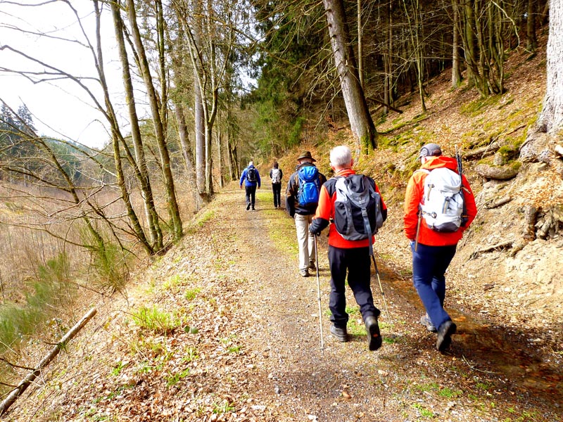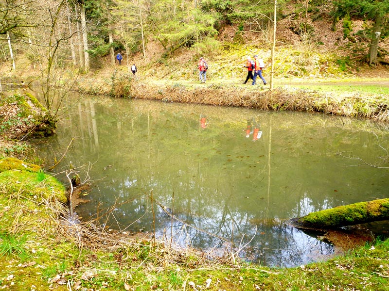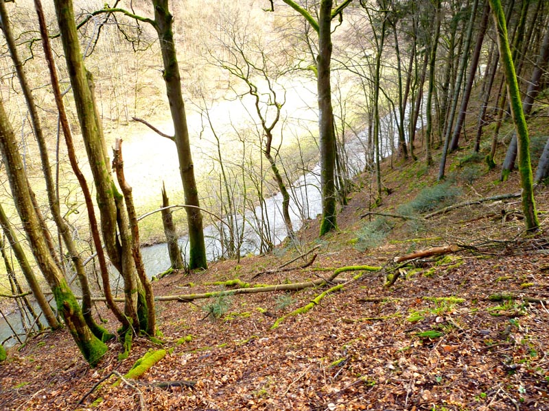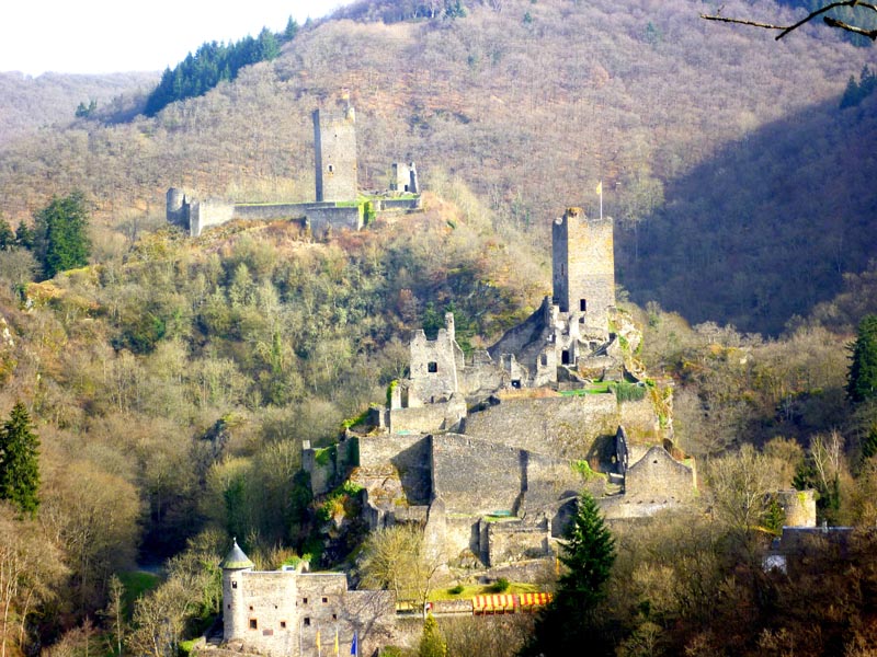 Vom Wanderparkplatz in Manderscheid folgen wir bei strahlendem Sonnenschein der Beschilderung des Grafschaft-Pfades in den Steilhang des Liesertales hinein. Stets auf Höhe bleibend folgt die Routenführung flussabwärts dem windungsreichen Lauf der Lieser. Schon bald sind linker Hand die Manderscheider Burgen, Ober- und Niederburg, aus der Vogelperspektive zu bewundern. Die Oberburg findet erstmalige Erwähnung im Jahre 973. Von ihrem fünfstöckigen Bergfried hat man einen herausragenden Blick auf die Niederburg, die Stadt Manderscheid und hinab ins Liesertal. Unterhalb der Oberburg ragt in Steinwurfweite die Ruine der Niederburg auf. Erstmals erwähnt im Jahre 1173, wird das verfallene mittelalterliche Gemäuer gleich auf drei Seiten von der Lieser umflossen und dadurch von der Oberburg getrennt. Beide Burgen wurden 1794 von den Franzosen zerstört und sind heute im Besitz des Eifelvereins.
