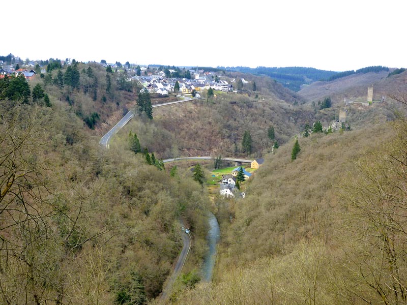 Der Grafschaft-Pfad beginnt sogleich mit einem Highlight, dem Blick auf Ober- und Niederburg tief unten im Liesertal
