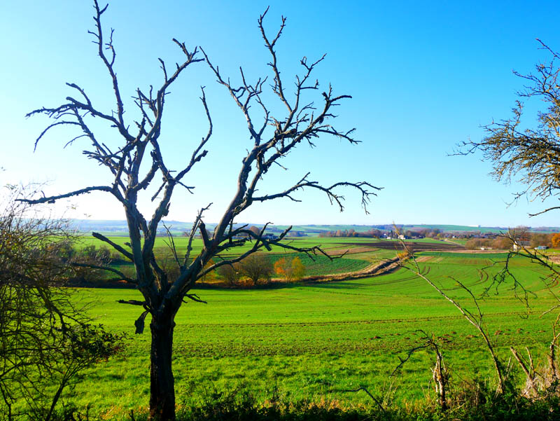 Wir beginnen die Wanderung am Parkplatz vor dem Schützenhaus der St. Sebastianus Schützenbruderschaft Polch. Hier steht kostenloser Parkraum in ausreichender Zahl zur Verfügung. Ein breiter Waldweg führt anfangs durch einen Buchenhain und läuft sodann geradewegs in die freie Feldflur hinaus. Nach einem scharfen Rechtsschwenk auf dem Plateau des kaum wahrnehmbaren Blumenberges wird die Asphaltpiste der K46 überschritten und an einem Gehölz entlang marschiert. Links des Weges zeigt sich dabei in nicht allzu weiter Ferne der Polcher Ortsteil Kaan, während kurz darauf zur Rechten ein erster bemerkenswerter Blick über das Maifeld schweift und auf den Start- und Zielort Polch fällt. Wir befinden uns jetzt in den Umgebungen des Uhlen- und Kuckertsberges. Beide Erhebungen bieten traumhafte, fast unbegrenzte Fernblicke über das Maifeld. Die markante Stiftskirche von Münstermaifeld ist zu sehen und die Vulkankegel der Osteifel zeigen sich am Horizont. Nach einem weiteren ebenen Verlauf führt die Route sanft ansteigend zum Bildstock am Wingert hinauf. Auch von dieser kleinen Erhebung zeigt sich ein grandioses Osteifelpanorama.