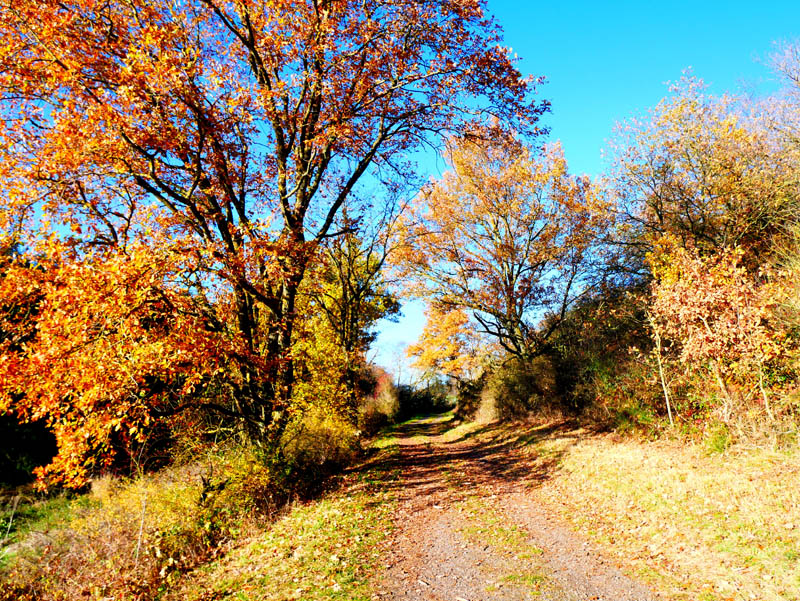 An heißen Sommertagen sollte man das Traumpfädchen Polcher Paradiesweg besser nicht begehen. Denn Schatten spendende Passagen sind auf dem Spazierwanderweg nur in wenigen Teilabschnitten anzutreffen. Im sonnigbunten Herbst zeigt die kleine Route aber durchaus ihren Charme.