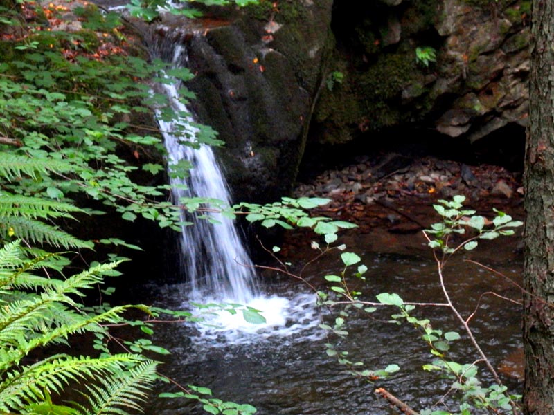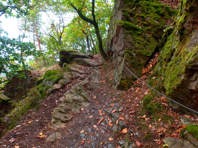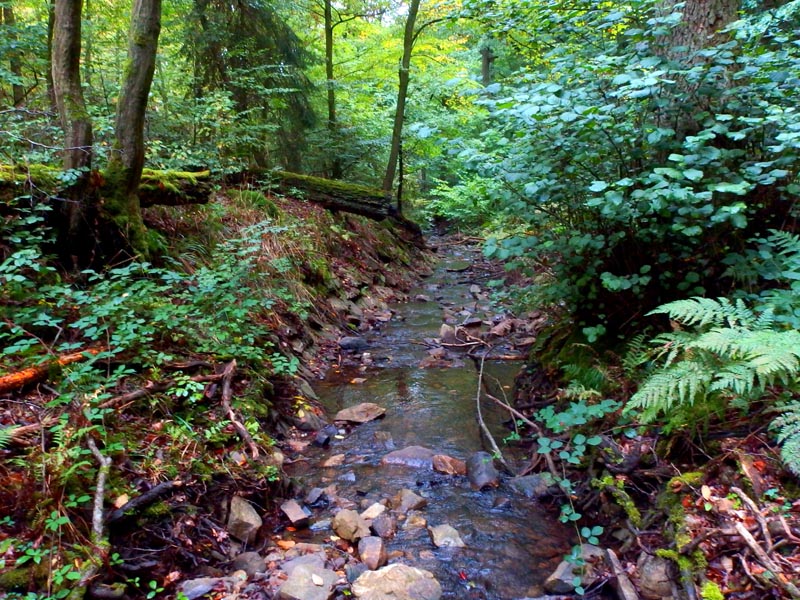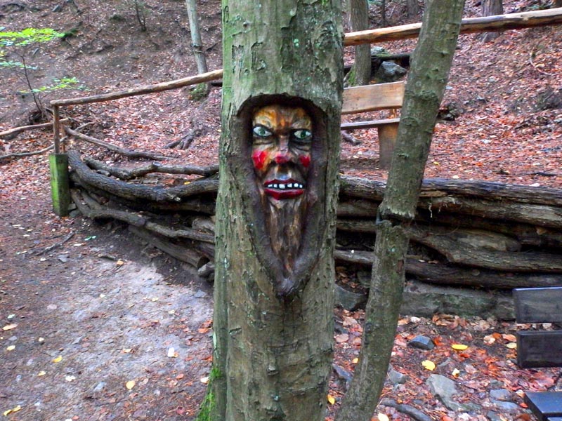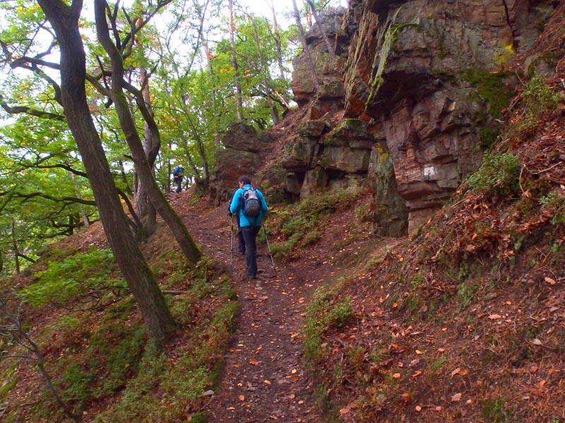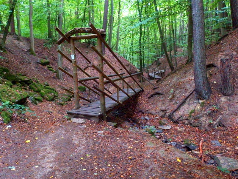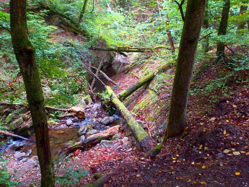 Gleich nach dem Start am Forsthaus Jägerhaus wartet der Soonwaldsteig mit einem ersten Highlight auf. Aus dem Morgenbachtal, in das der Fernwanderweg hinein fällt, unternehmen wir einen kurzen, etwa 200 Meter langen Abstecher durch die Steckenschlääferklamm. Neben mehreren hölzernen Stegen, die jeweils ein winziges Nebengewässer des Morgenbaches überbrücken, begeistern zahlreiche Schnitzereien an den Bäumen, so genannte Baumgeister, nicht nur die kleinen Mitwanderer. Wieder zurück im Morgenbachtal folgt der Soonwaldsteig dem quirligen Gewässer bachabwärts und immer tiefer in die enge Schlucht hinein. Ein verheerendes Unwetter hat im Jahre 2016 die Region heimgesucht. Erhebliche Sturmschäden durch Windbruch und erdrutschartige Abgänge haben das tief eingeschnittene Kerbtal damals unpassierbar gemacht. Noch heute sind die Spuren des schlimmen Naturereignisses sichtbar. Inzwischen kann man aber die rauschenden Wasserfälle und quirligen Wassersprünge des Morgenbaches wieder uneingeschränkt bewundern.