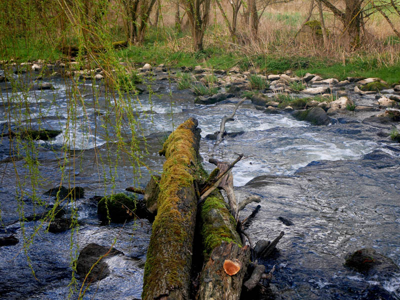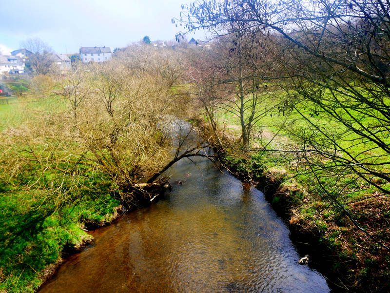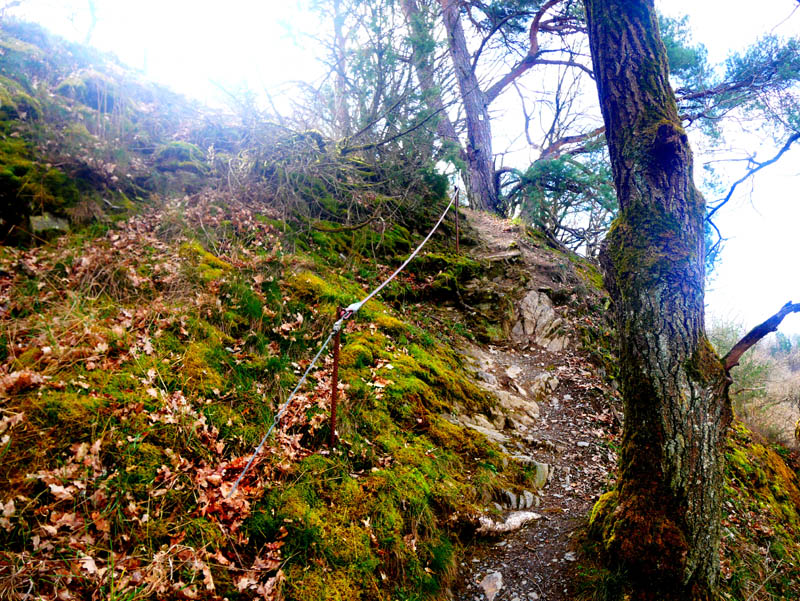 Wir beginnen die Wanderung am vorgesehenen Startpunkt der Traumschleife Domblick an der Simmerbachbrücke in der Hauptstraße des Hunsrückortes Ohlweiler. Ausreichende Parkmöglichkeiten befinden sich auf dem in der Dorfstraße „Im Farrich“ befindlichen Wanderparkplatz am Friedhof. Vom Traumschleifenportal an der Simmerbachbrücke führt uns ein breiter, fein geschotterter Weg mit der Routenführung des Schinderhannespfades unterhalb des Wochenendgebietes in das idyllische und schon frühlingshaft anmutende Simmerbachtal. Schon bald verlässt die Traumschleifenroute den breiten Weg und steigt mit einem schmalen Pfad links abzweigend in die Flanke des Eselsberges. Durch einen Buchbestand geht es bei ständigem Auf und Ab in halber Hanglage schlussendlich zu einem Aussichtspunkt hinauf, der herrliche Tiefblicke ins Simmerbachtal ermöglicht. Schließlich fällt die Route wieder zum Talgrund hinab und tritt unmittelbar an den Simmerbach heran. Erneut folgen die Wanderer dem breiten Weg entlang des Gewässers in Fließrichtung.