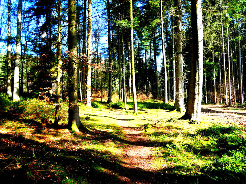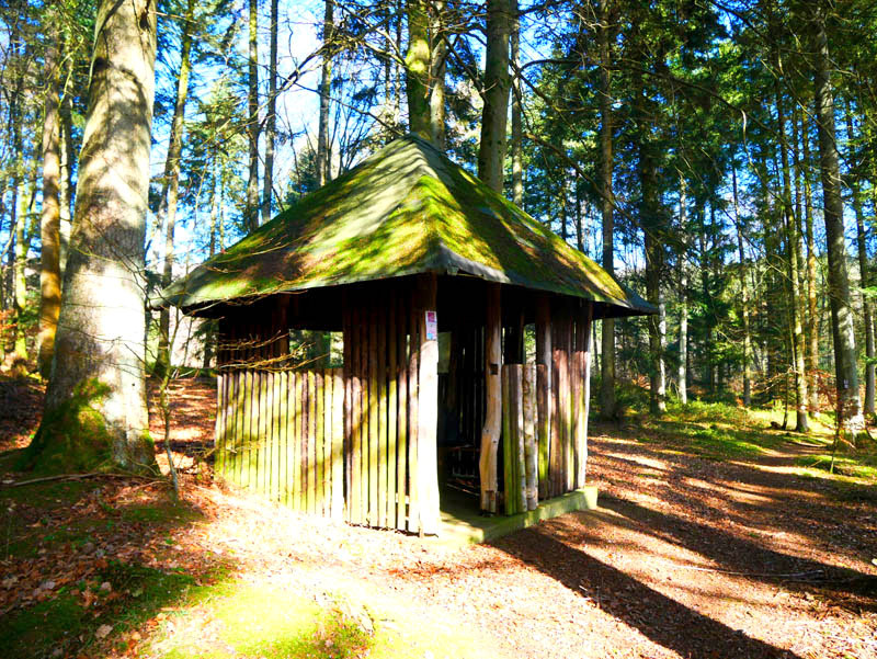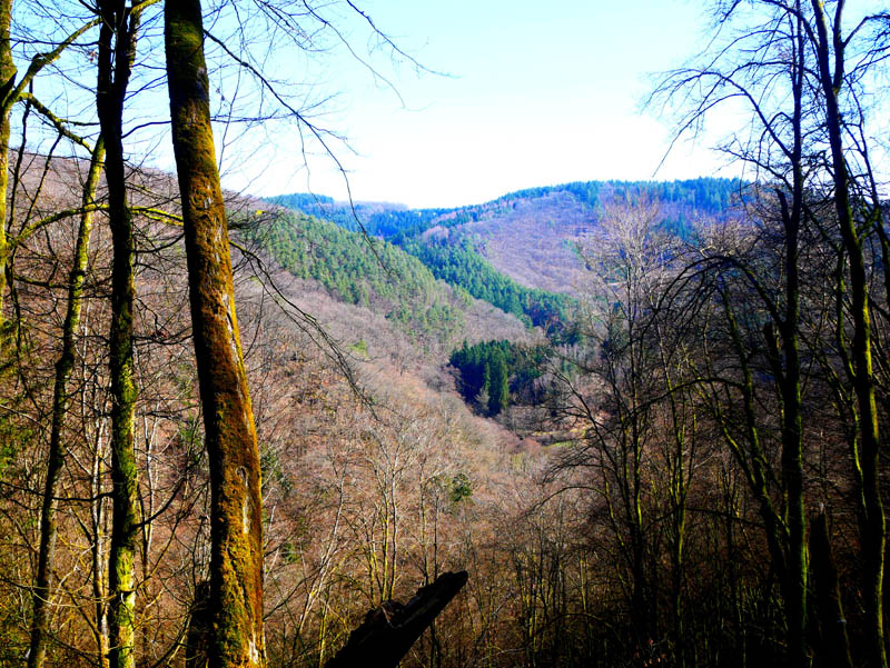 Wir beginnen die Wanderung an der Fischerhütte von Beuren. Direkt am Angelweiher wird kostenloser Parkraum zur Verfügung gestellt. Auf einem breiten Forstweg und wenig später auf einem mit Laub bedeckten Waldpfad geht es durch einen Buchen- und Eichenhallenwald. Ein kleines Gewässer, das dem Krennerichbach zustrebt, wird überschritten. Durch junge Fichtenbestände gelangen die Wanderer zuerst auf eine idyllische Waldschneise und wenig später zu einem rustikalen hölzernen Unterstand. Da es für eine Rast noch viel zu früh ist, folgen wir der Beschilderung ausgesprochen pfadig und windungsreich durch ein Gehölz. Die Wanderer passieren ein Biotopgewässer und folgen den Wegezeichen der Traumschleife auf einem breiten Forstweg in halber Hanglage hoch über dem Krennerichbach. Während das Gelände zur Rechten ziemlich steil ins Bachtal abbricht, zeigen sich links der Route am Wegrand und mitten im Wald immer wieder bizarre, von Moosen und Flechten bewachsene Gesteinsformationen, die jeden Naturfreund begeistern.