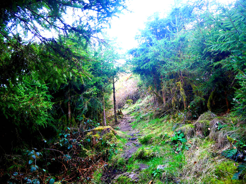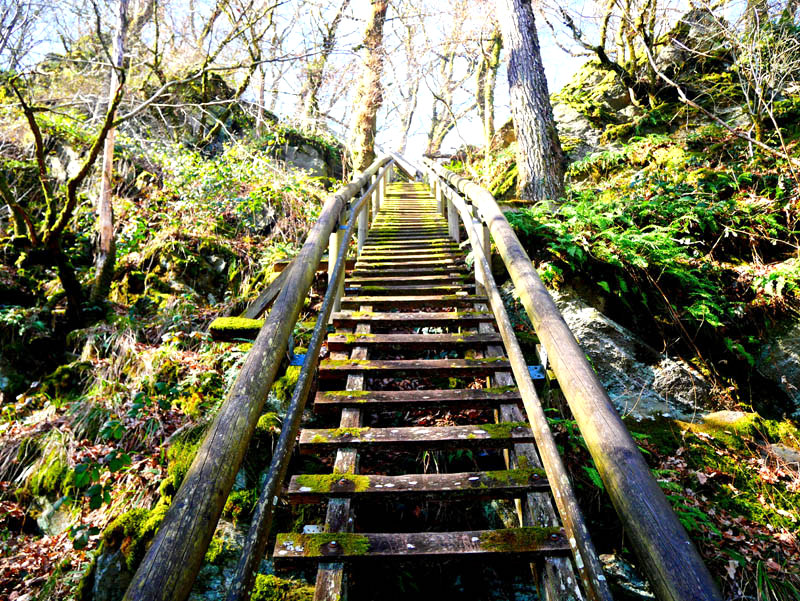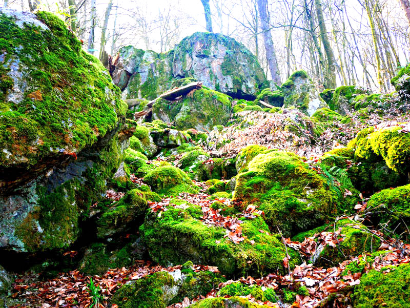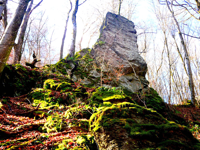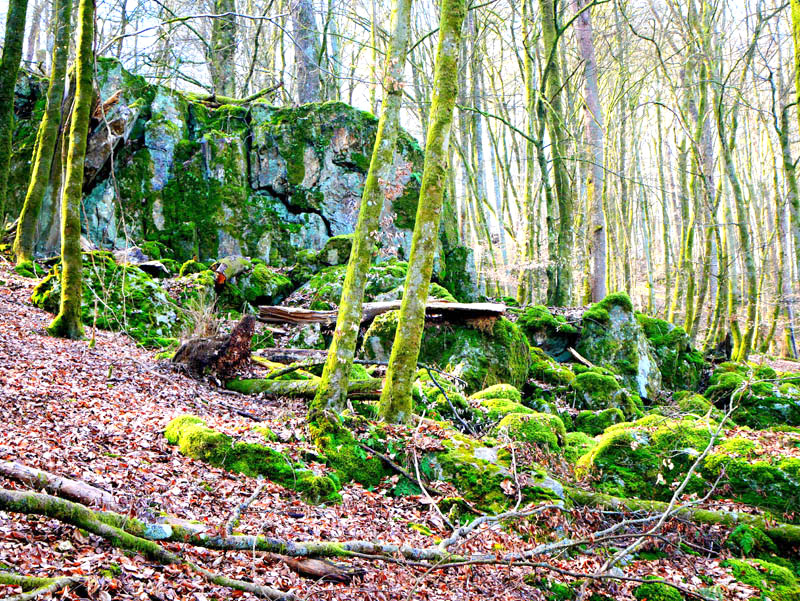 Hoch über dem Tal des Krennerichbaches führt die Traumschleife an bemoosten Gesteinsformationen vorbei