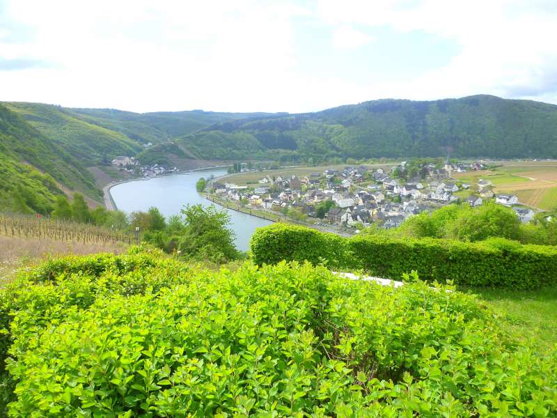 Traumhafte Blicke ins Moseltal und auf die Ortschaft Ellenz-Poltersdorf begleiten uns auf dem erstenTeilabschnitt, bevor die Route über den Aussichtspunkt Plaatskopf nach Bruttig-Fankel abfällt. In der Ortslage unterschreiten wir das Viadukt einer zu Kriegszwecken konzipierten, jedoch nie in Betrieb genommenen Bahnlinie und wandern eine Weile über den alten Bahndamm. Scharf nach rechts schwenkend klettert der Moselsteig sodann in das Kabainer Bachtal hinein. Überaus steil geht es im Wald bergan. Wilder Buchsbaum rechts und links des Weges und der munter plätschernde Bachlauf begleiten uns über mehrere Brücken und Stege hinauf zu den Moselhöhen.