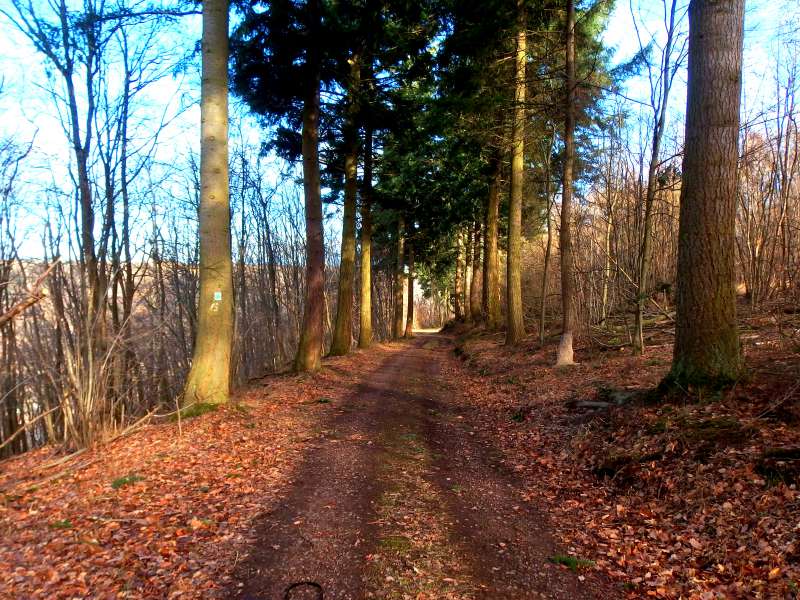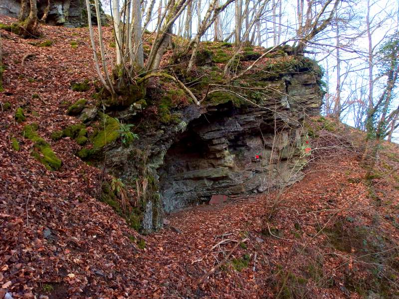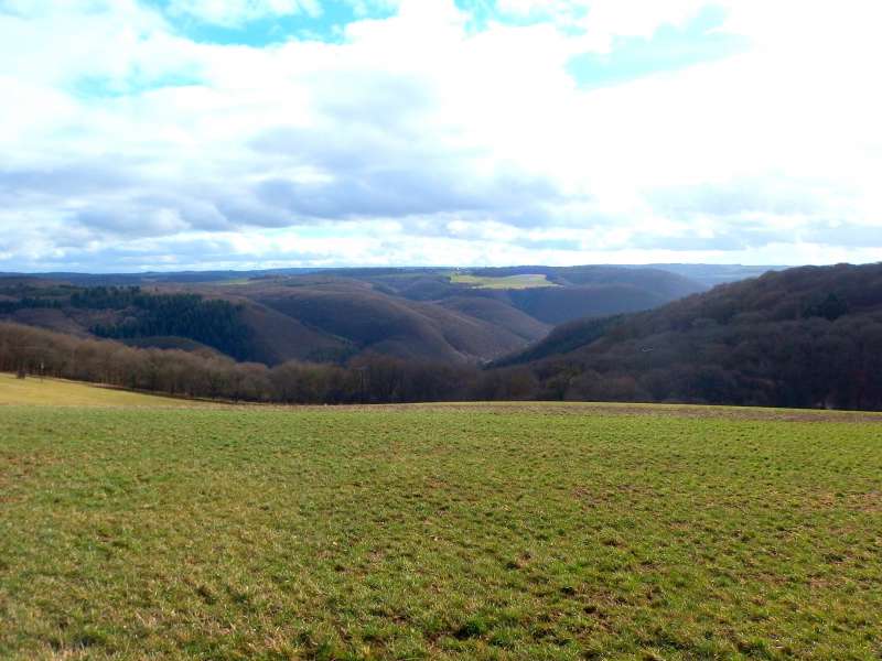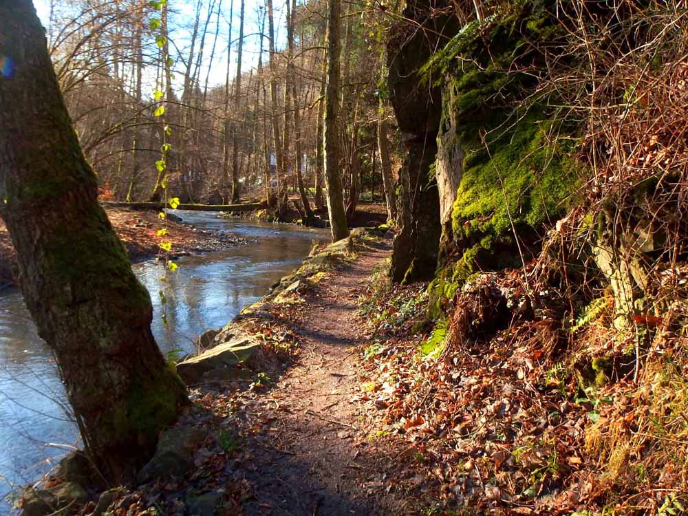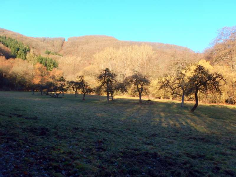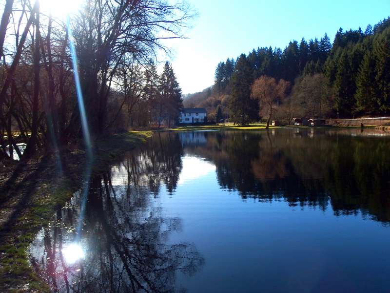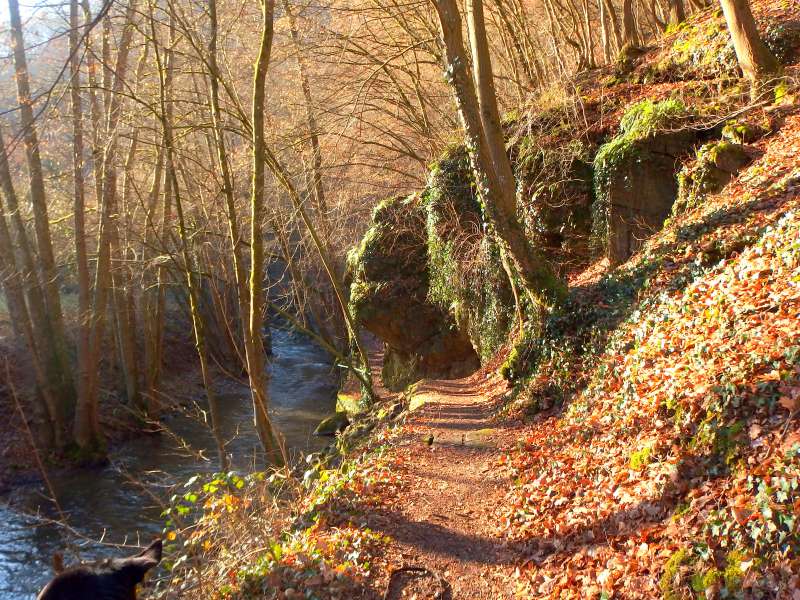 Auf seinem Weg dorthin hat der Baybach eine enge Schlucht in das Schiefergestein gegraben, die man im Volksmund als "Grand-Canyon des Hunsrücks" bezeichnet und in der gleich vier Traumschleifen für uneingeschränkten Wandergenuss sorgen. Bei der Wanderung durch das Baybachtal bricht die Wintersonne immer wieder durch das Geäst und verwöhnt die Wandergruppe mit ihrer noch zaghaften Wärme. Infotafeln entlang der Wegstrecke gewähren Einblicke in die Geschichte des Landstrichs und vermitteln Wissenswertes über Flora und Fauna. An einer großen Wiese mit Obstbäumen entfernt sich das Borjer Ortsbachpädche etwas vom Bach und trifft dann wieder auf die Fahrstraße, die von Burgen herauf kommt. Ein kurzes Stück folgt die Gruppe gefahrlos der Asphaltpiste und gelangt dann zum Forellenhof mit seiner weitläufigen Anlage und den schön angelegten und gepflegten Fischteichen. Hier ist nach etwa drei Kilometern bereits eine Einkehr möglich.