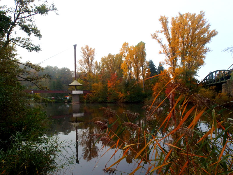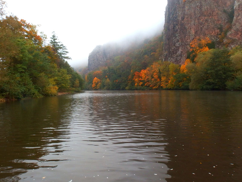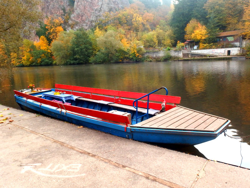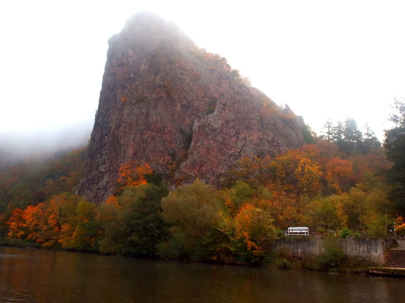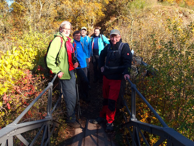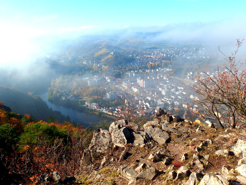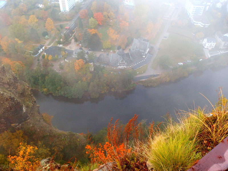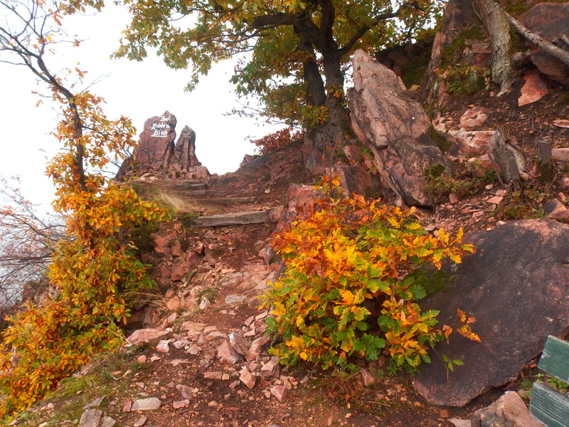 Abweichend von der vorgegebenen Routenführung einschlägiger Wanderportale beginnen wir die Rundtour auf dem gebührenfreien Wanderparkplatz am Naheufer in Bad Münster am Stein-Ebernburg. Naheabwärts geht es ein kurzes Stück direkt am Flussufer entlang. Am Rand des Kurparks von Bad Münster am Stein treffen wir auf eine handgezogene Fähre, mit der wir gegen einen Obolus von 1 € sicher und stressfrei ans gegenüberliegende Naheufer gelangen. Es handelt sich dabei, wie uns der freundliche Fährmann stolz versichert, um die einzige Handseilfähre in Südwestdeutschland. Beim Übersetzen bewundern die Wanderer die schroffen, lotrecht in die Nahe fallenden Felswände des Rheingrafensteins, dessen Gipfel im Herbstnebel noch verborgen ist. Am rechten Naheufer angelandet geht es durch das Huttental und über unzählige Trittstufen stramm bergan zum Rheingrafenstein hinauf. In halber Hanglage treffen wir auf die Routenführung der Vitaltour, der wir ab jetzt unentwegt folgen.