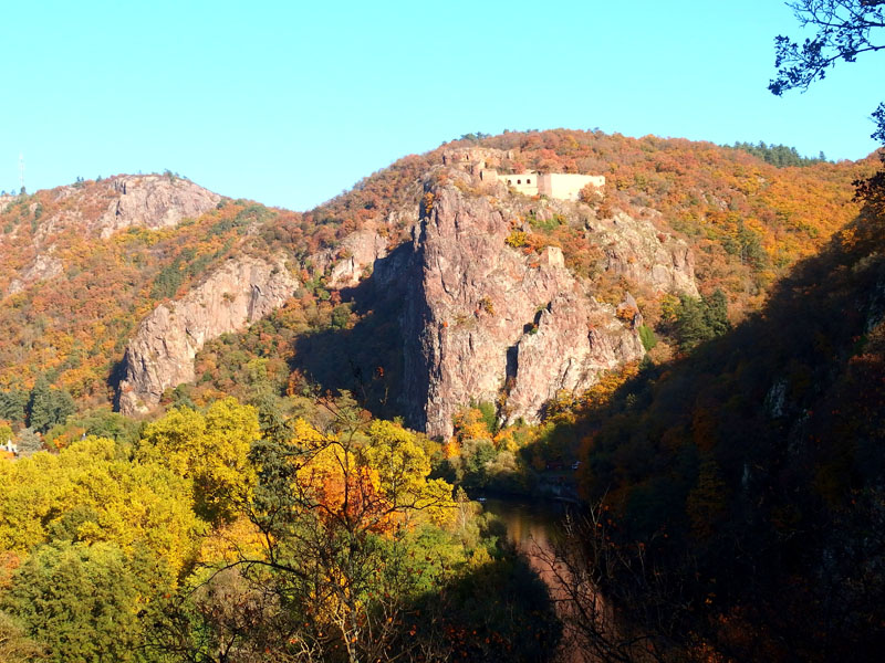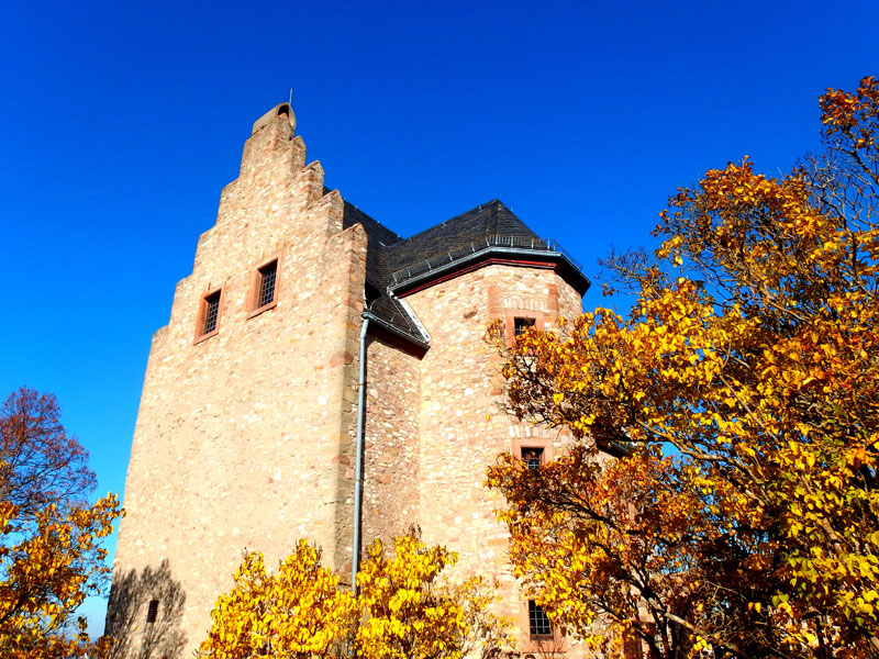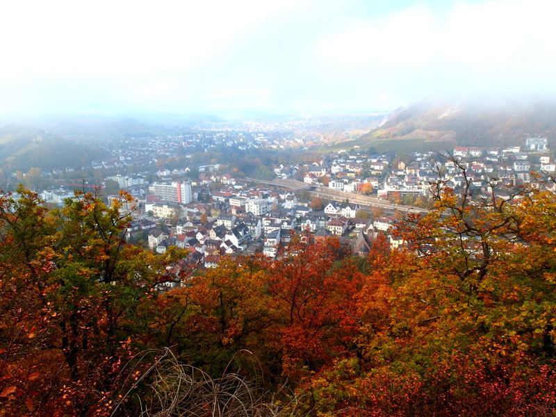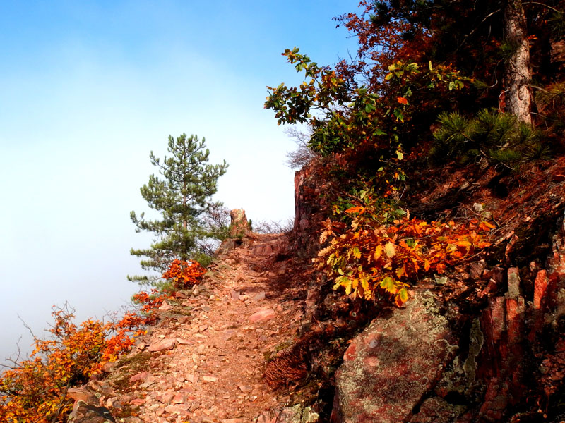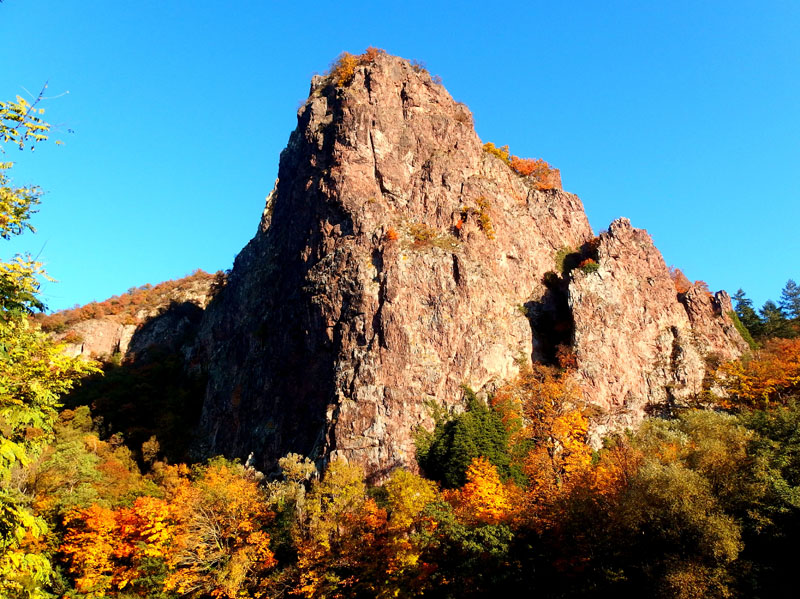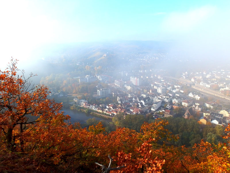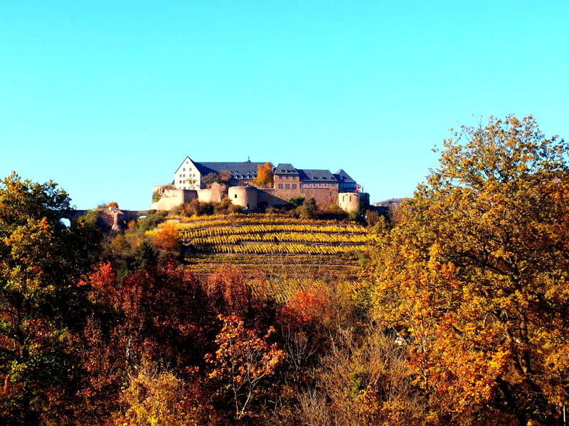 Begleitet von bizarren Gesteinsformationen rechts und links der Route gewinnen die Wanderer mit dem Serpentinenpfad durch das Huttental schnell an Höhe. Die senkrecht aufragenden Mauern der Vorburg, die im steilen Fels kurz zu sehen sind, zeigen an, dass uns nur noch wenige Höhenmeter von der Burgruine Rheingrafenstein trennen. Durch einen "Nebeneingang" betreten wir schließlich das umfangreiche Ruinengelände. Teile des Burgrings, Treppen zum einstigen Wohnturm und ein begehbarer Gewölbekeller sind von dem imposanten mittelalterlichen Gemäuer erhalten geblieben. Im 11. oder 12. Jahrhundert wurde die Burg auf dem 246 Meter hohen Felsen aus Porphyrgestein von den Nahegaugrafen errichtet. Außerdem war sie während des Mittelalters bis zur Französischen Revolution der Stammsitz der Ritter vom Stein, der späteren Wild- und Rheingrafen. Eine durch den Fels getriebene Steintreppe führt uns hoch zu einer Aussichtsplattform, die grandiose Tiefblicke ins herbstbunte, leicht neblige Nahetal möglich macht. Den Kurort Bad Münster am Stein-Ebernburg betrachten wir aus der Vogelperspektive und jenseits des Talkessels fällt der Blick auf die gewaltigen Wände des Rotenfels.