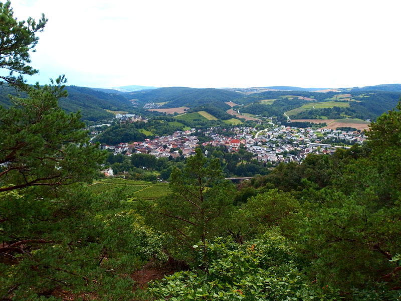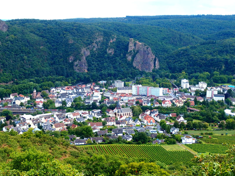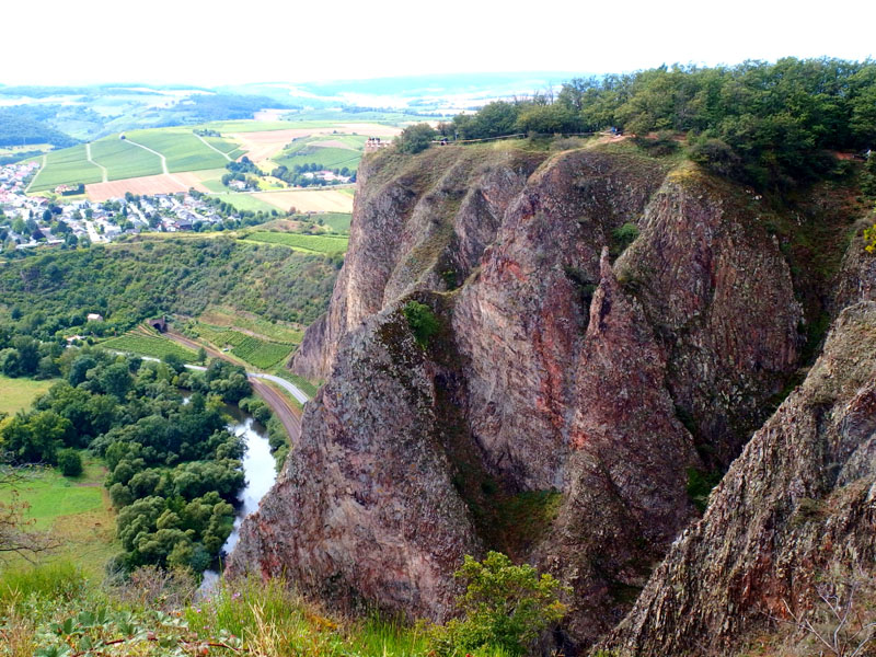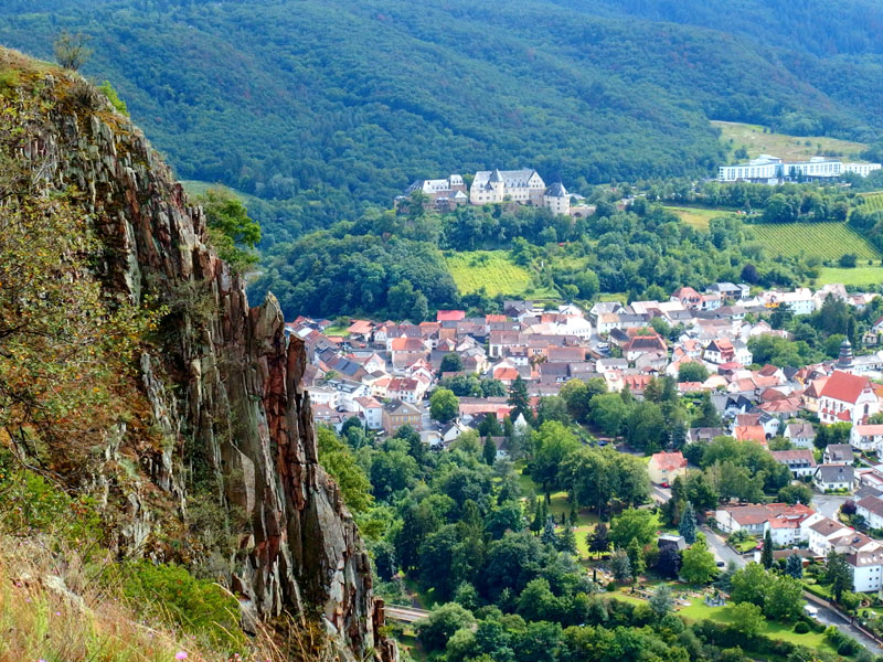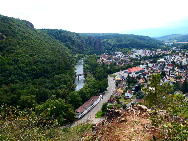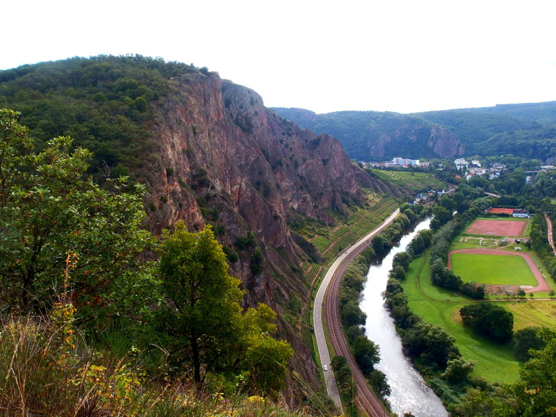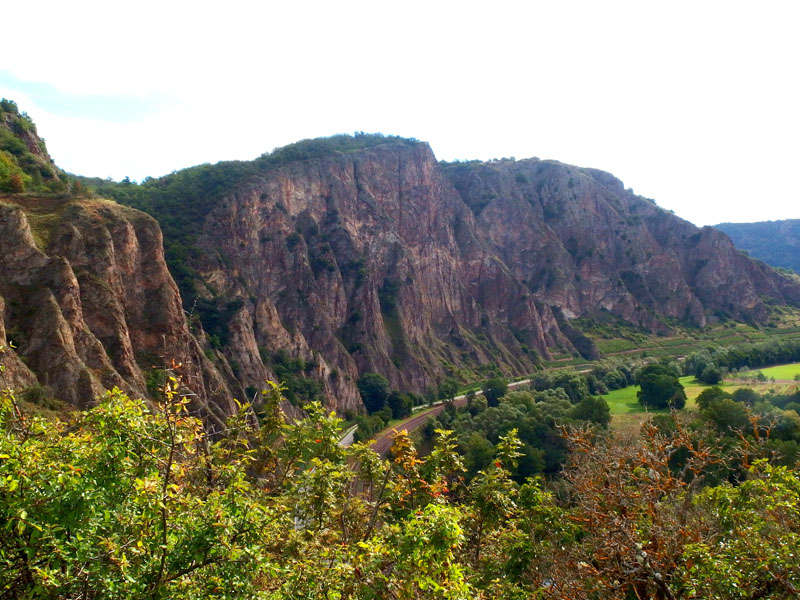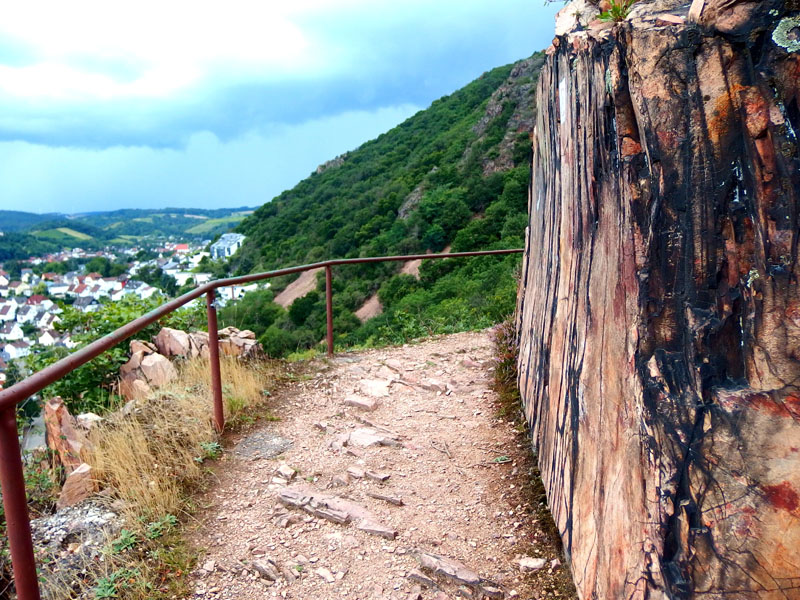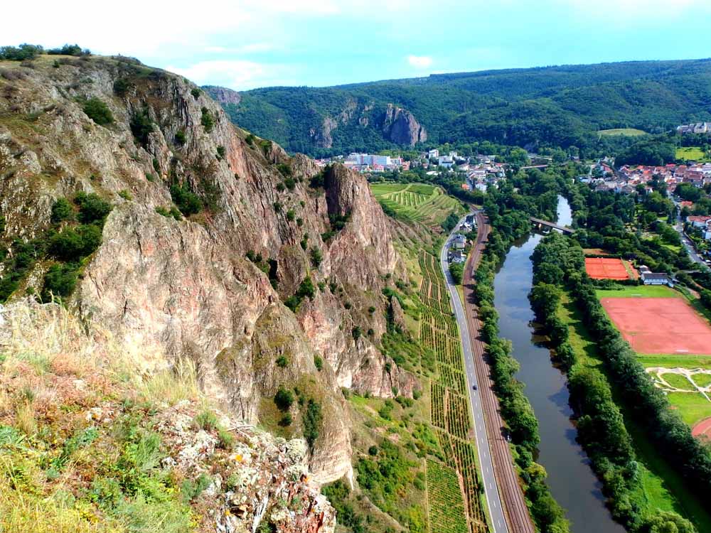 Ein kurzer knackiger Steilabstieg, den man mit hölzernen Trittstufen etwas entschärft hat, führt über den Lerchenberg zum Götzenfelsblick hinunter. Von diesem mit Weinreben bedeckten Höhenzug lohnt ein Blick zurück auf den Götzenfels. Wesentlich beeindruckender sind allerdings die wildzerklüfteten, rotbraunen Rhyolithwände des 327 Meter hohen Rotenfels, die rechts versetzt dahinter aufragen. In Jahrtausenden hat sich die Nahe tief in das vulkanische Gestein geschnitten und dabei diese phänomenale Wand geformt. Am Götzenfelsblick vollzieht die Vitaltour einen scharfen Rechtsknick und steigt auf breiten Weinbergwegen in den Rebenhang. Kurz darauf lassen wir die Weingärten hinter uns, werfen von der Anhöhe einen letzten Blick auf Traisen und tauchen in den Wald ein. Den Gipfel des 321 Meter hohen Schanzenkopfes, mit dem Fernmeldeturm Bad Kreuznach, lässt die Vitaltour rechts liegen und führt stattdessen durch den Kreuznacher Stadtwald über den Dachskopf bergab ins Lohrer Tal. Am Waldrand entlang marschierend sind von hier aus weit in der Ferne die Höhenzüge des Soonwaldes gerade noch zu erkennen.