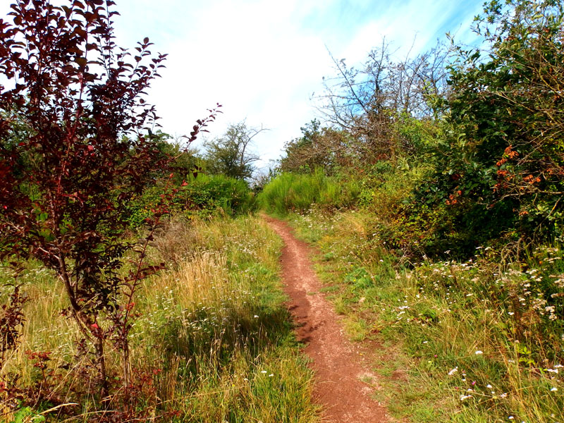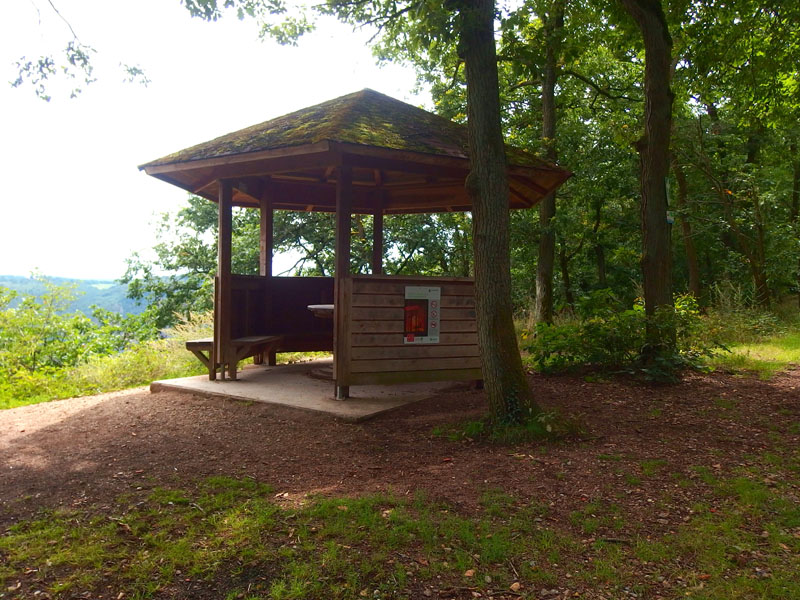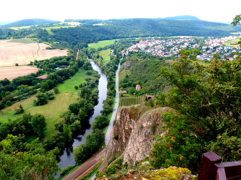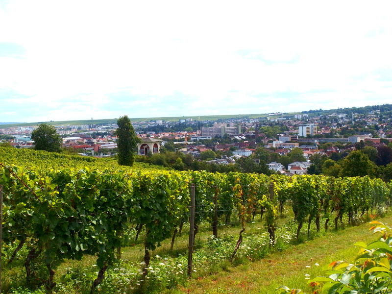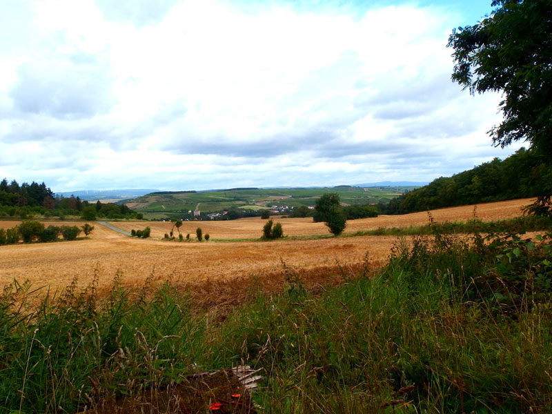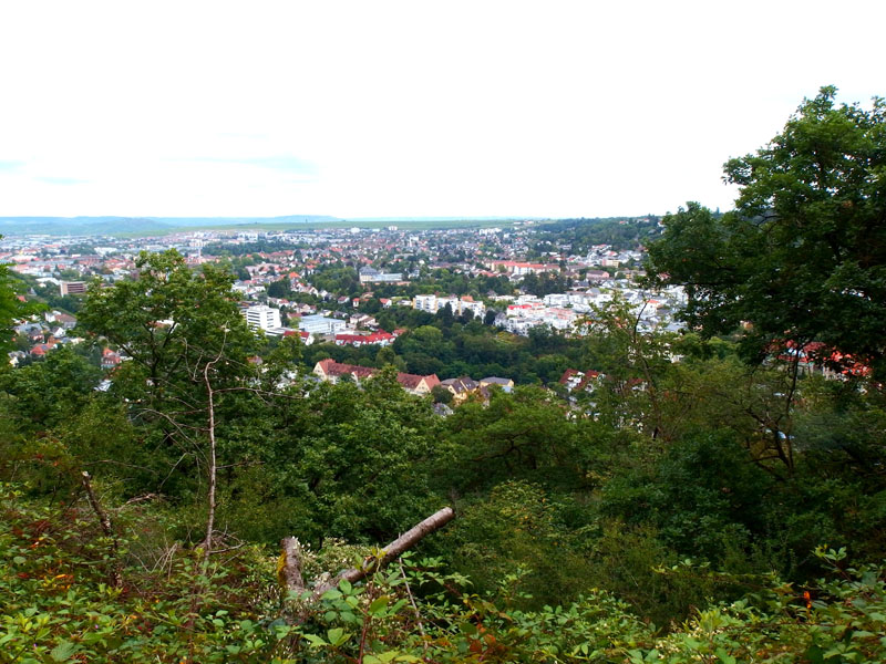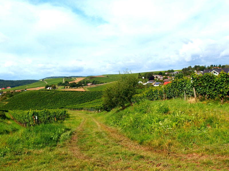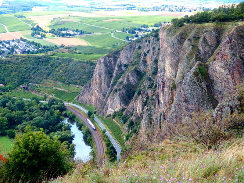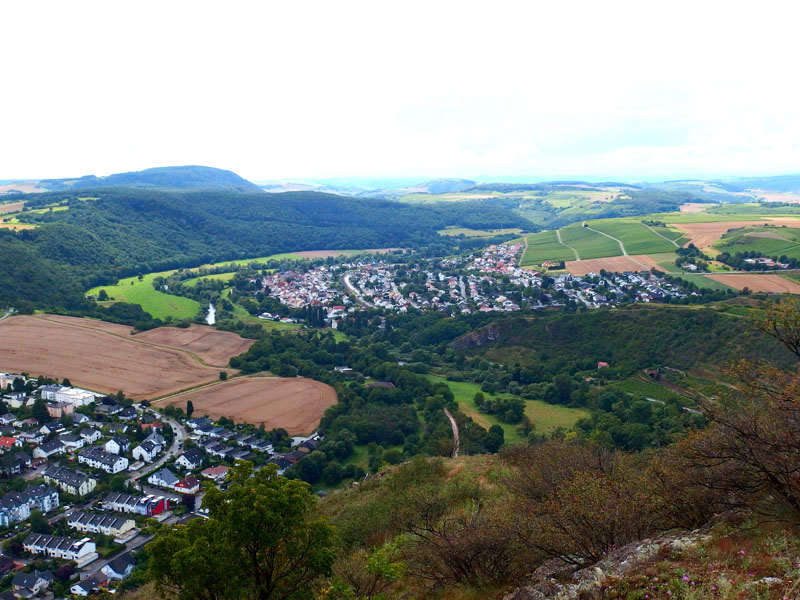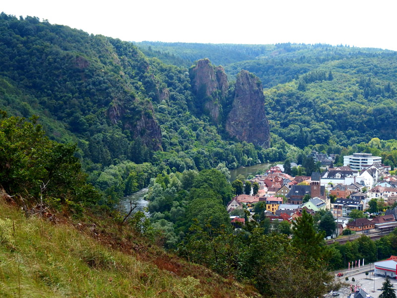 Ein kurzer knackiger Steilabstieg, den man mit hölzernen Trittstufen etwas entschärft hat, führt über den Lerchenberg zum Götzenfelsblick hinunter. Von diesem mit Weinreben bedeckten Höhenzug lohnt ein Blick zurück auf den Götzenfels. Wesentlich beeindruckender sind allerdings die wildzerklüfteten, rotbraunen Rhyolithwände des 327 Meter hohen Rotenfels, die rechts versetzt dahinter aufragen. In Jahrtausenden hat sich die Nahe tief in das vulkanische Gestein geschnitten und dabei diese phänomenale Wand geformt. Am Götzenfelsblick vollzieht die Vitaltour einen scharfen Rechtsknick und steigt auf breiten Weinbergwegen in den Rebenhang. Kurz darauf lassen wir die Weingärten hinter uns, werfen von der Anhöhe einen letzten Blick auf Traisen und tauchen in den Wald ein. Den Gipfel des 321 Meter hohen Schanzenkopfes, mit dem Fernmeldeturm Bad Kreuznach, lässt die Vitaltour rechts liegen und führt stattdessen durch den Kreuznacher Stadtwald über den Dachskopf bergab ins Lohrer Tal. Am Waldrand entlang marschierend sind von hier aus weit in der Ferne die Höhenzüge des Soonwaldes gerade noch zu erkennen.