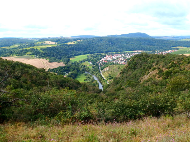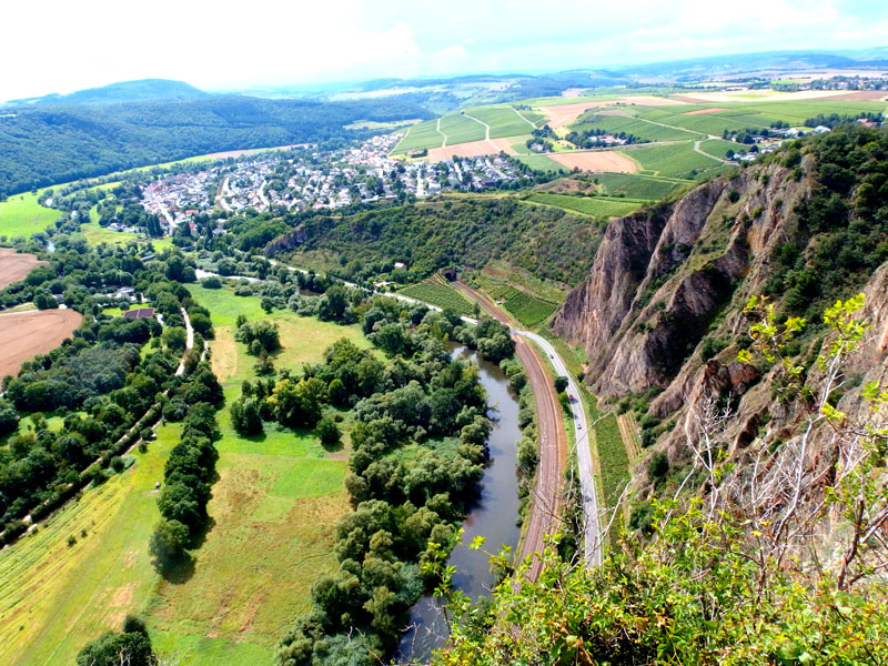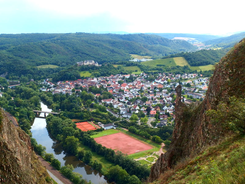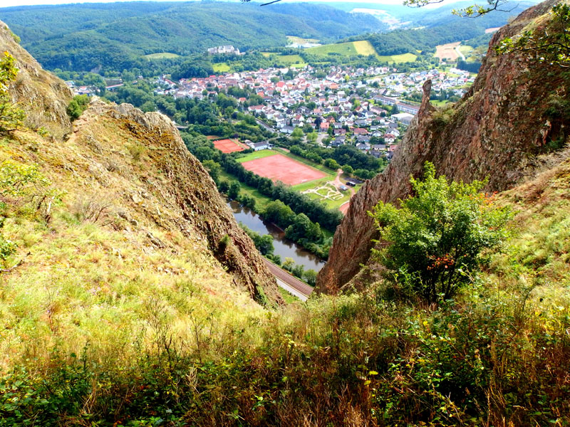 Idealer Startpunkt in die Vitaltour Rotenfels ist das Wanderportal auf dem Rotenfelsplateau, das von der Ortschaft Traisen über eine schmale asphaltierte Straße zu erreichen ist. Hier steht ausreichend kostenloser Parkraum zur Verfügung. Gleich drei Rotenfels-Wanderungen unterschiedlicher Länge kann man vom Wanderportal aus unternehmen. Wir entscheiden uns für die knapp 18 Kilometer lange und wohl schwierigste der drei Strecken, die Vitaltour Rotenfels. Vom Ausgangspunkt folgen wir der lila Beschilderung auf einem schmalen Pfad in Mischwald hinein. Kurz darauf gelangen die Wanderer durch Buschwerk und Heckengelände zum Götzenfels. Von dieser hohen Warte erfreuen wir uns an einem ersten grandiosen Nahetalpanorama, das die Ortschaft Norheim mit einschließt. Überaus spektakulär ist der Blick auch nach links in die mehr als 200 Meter hoch aufragenden Steilwände des Rotenfels, die fast senkrecht ins Nahetal fallen.