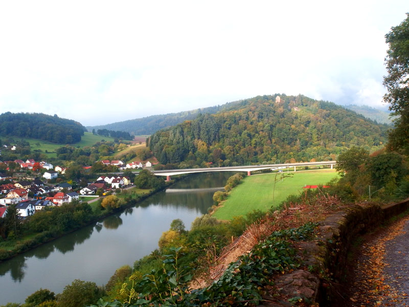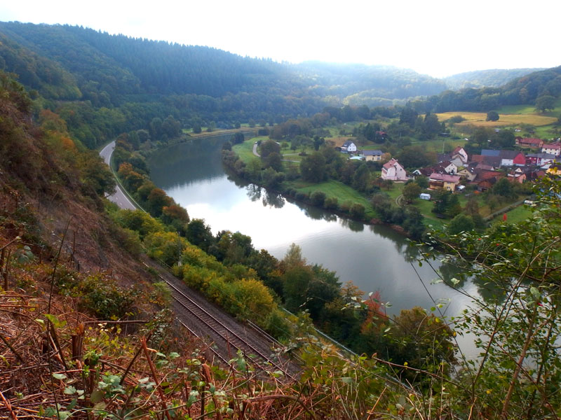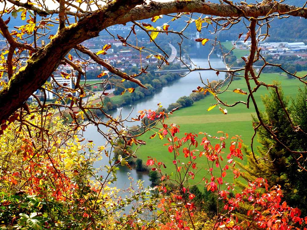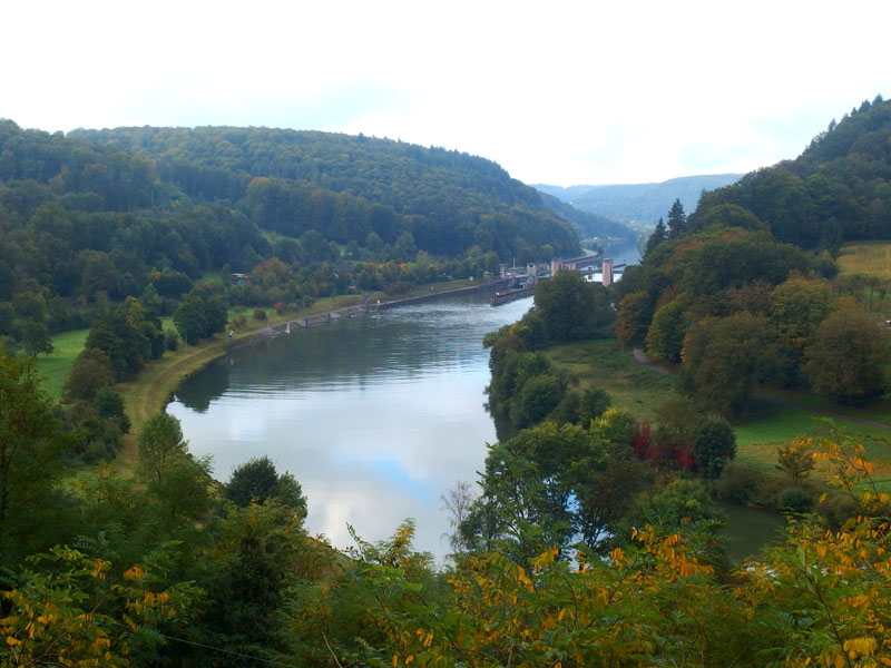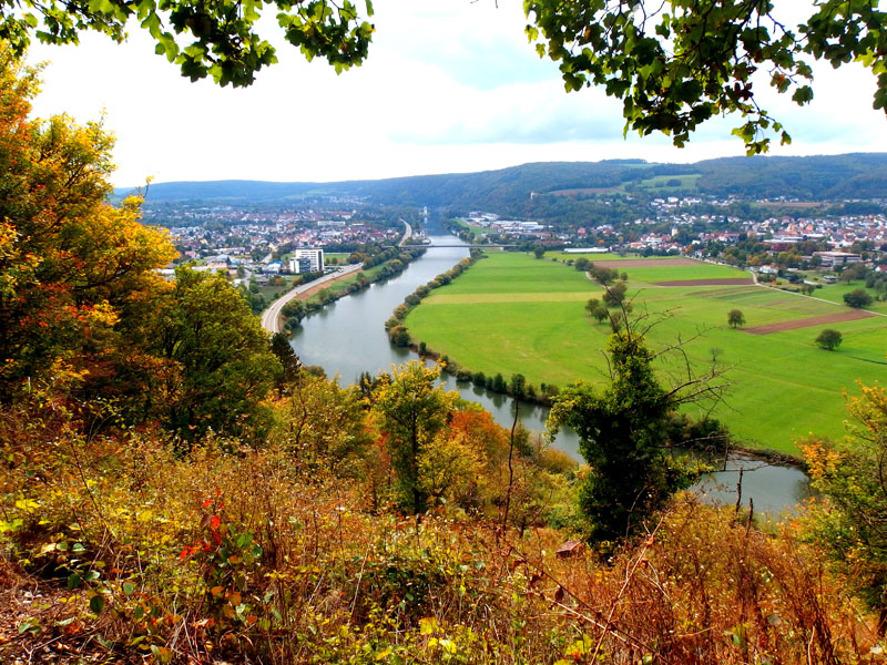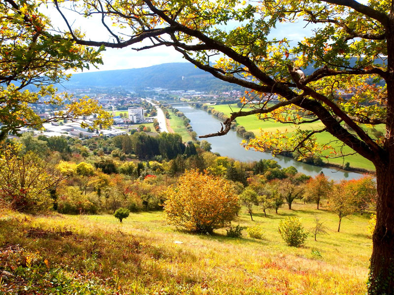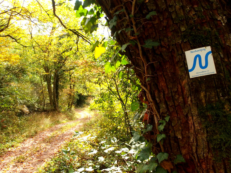 Gleich zu Beginn läuft der Fernwanderweg in halber Hanglage aussichtsreich am Neckar entlang