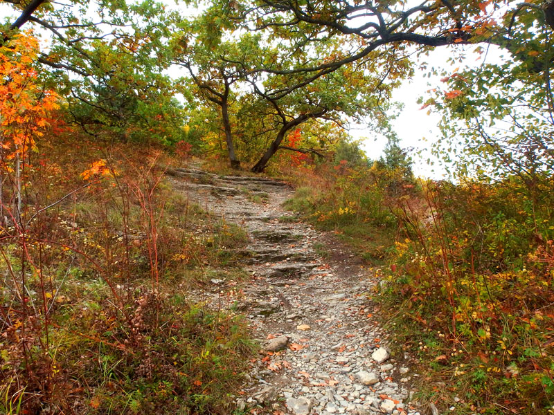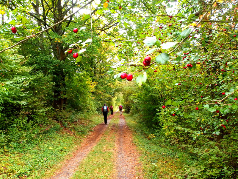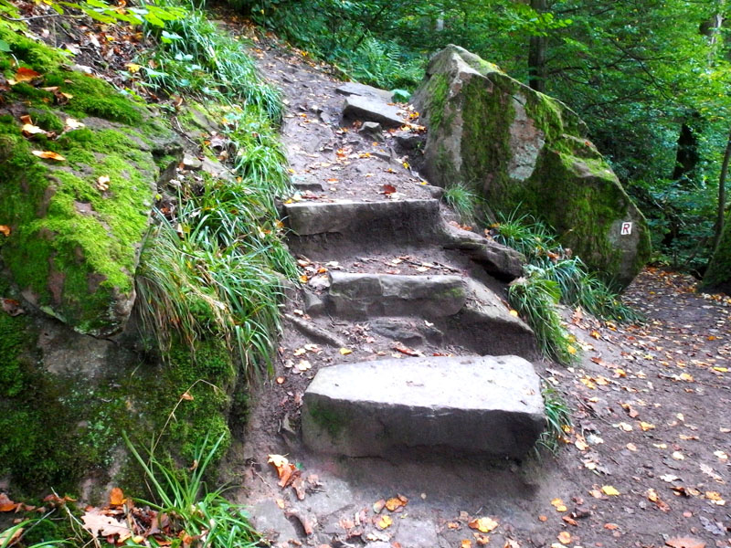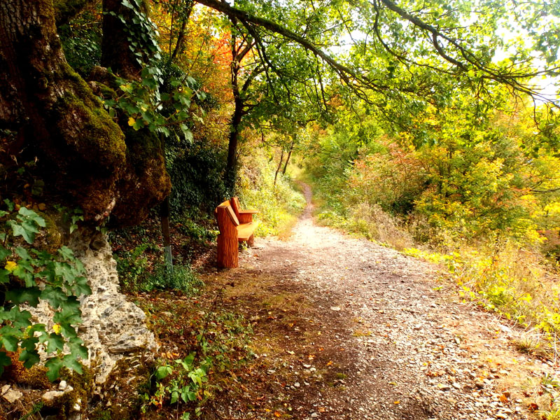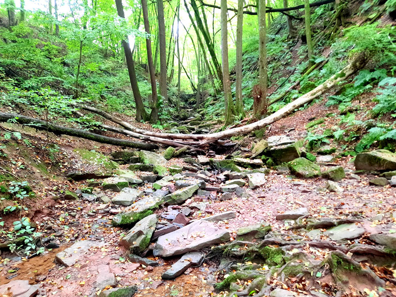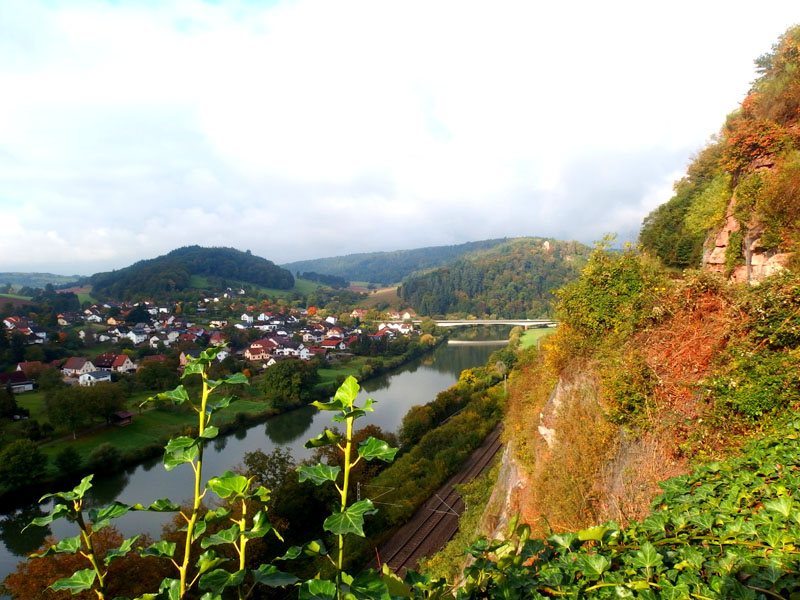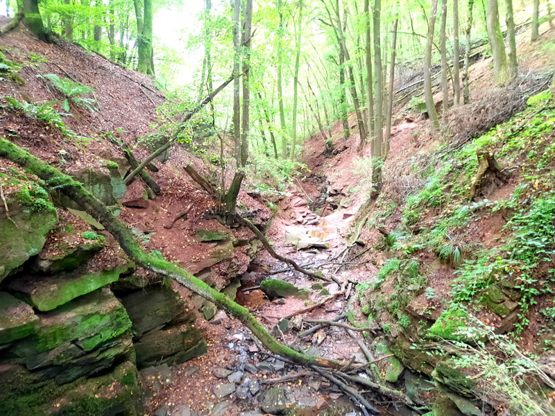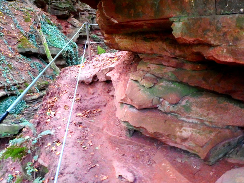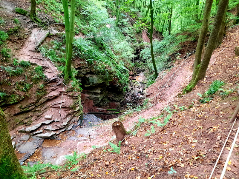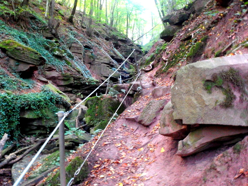 Da der Neckarsteig in fast allen Start- und Zielorten über einen S-Bahn-Haltepunkt verfügt, starten wir auch in die 7. Etappe am Bahnhof in Neckargerach. Hier steht ausreichender Parkraum zur Verfügung. Über eine Wendelbrücke gelangen die Wanderer auf die Bergseite der Eisenbahnlinie. Die Route folgt dem Margarethenschluchtpfad, der kurz darauf in halber Hanglage als Panoramaweg neckaraufwärts verläuft. Tief unten im Neckartal zeigt sich am gegenüber liegenden Flussufer die Ortschaft Guttenbach. Zurückblickend ist hoch über dem Neckar der Pallas der Minneburg auszumachen, während weit voraus hinter einer Flusskehre das Guttenbacher Neckarstauwerk zu sehen ist. Eine ganze Weile wandern wir am Fluss entlang und halten mehrmals inne, um die herrlichen Ausblicke zu genießen. Dann vollzieht der Fernwanderweg einen scharfen Linksschwenk, verlässt den Panoramaweg und steigt in die canonartige Margarethenschlucht hinein. Der Flursbach hat sich über Jahrmillionen in den Buntsandstein des Neckartaler Odenwaldes hinein gesägt und diese einzigartige Schlucht geschaffen.