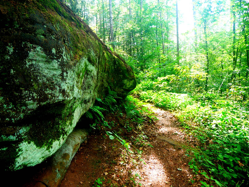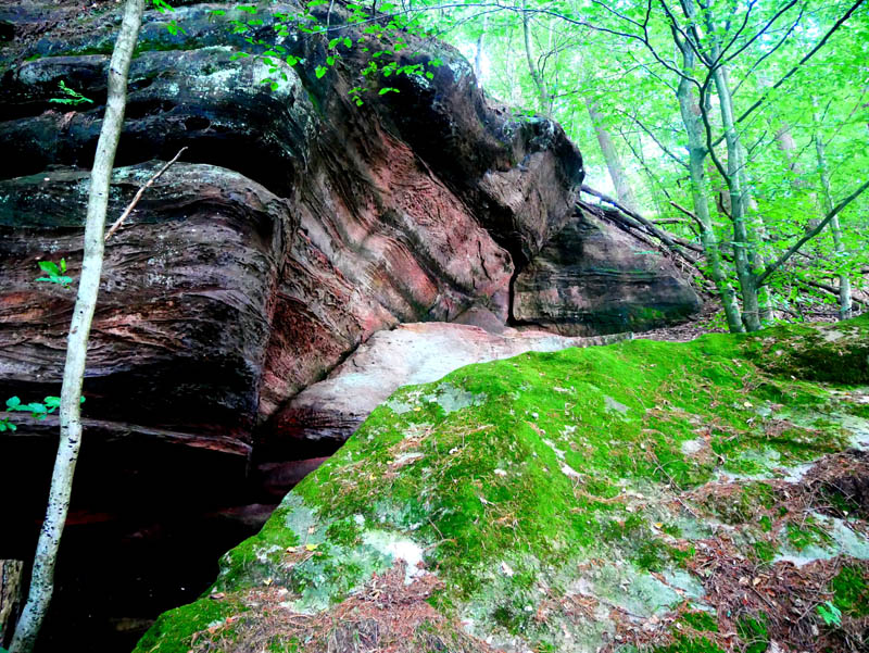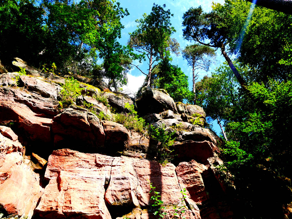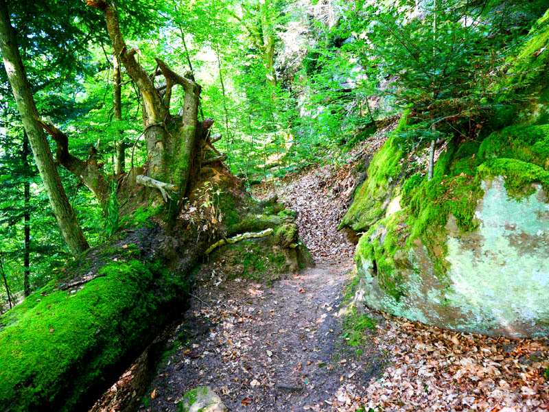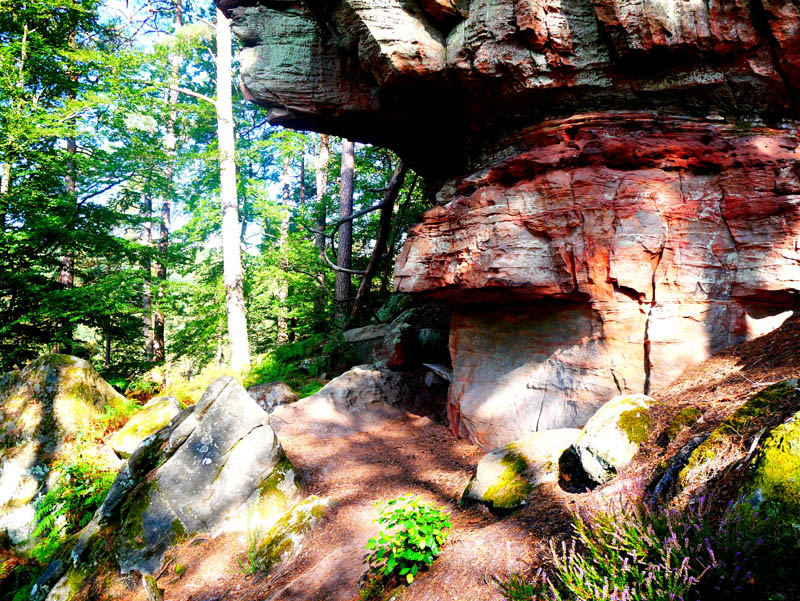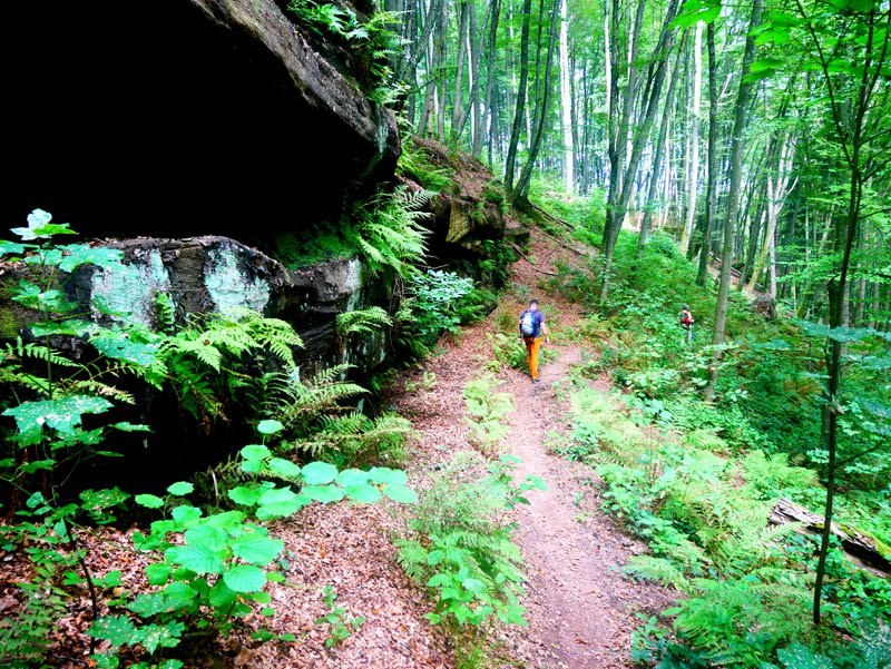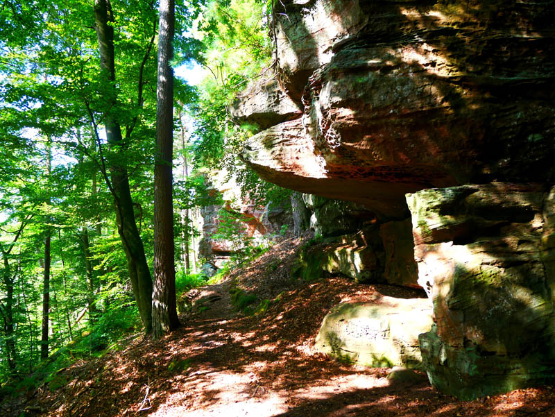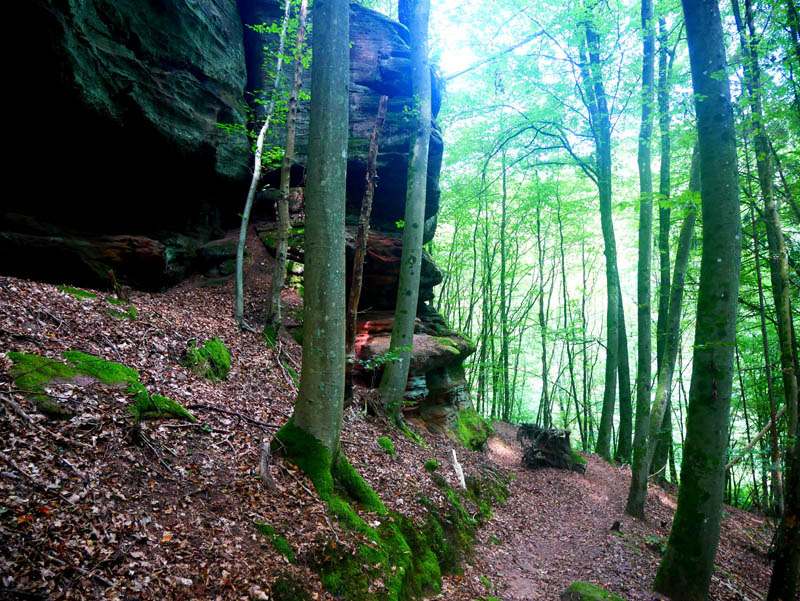 Auf einem holprigen Felsenpfad führt der Pfälzer Waldpfad am gigantischen Seelenfelsen entlang