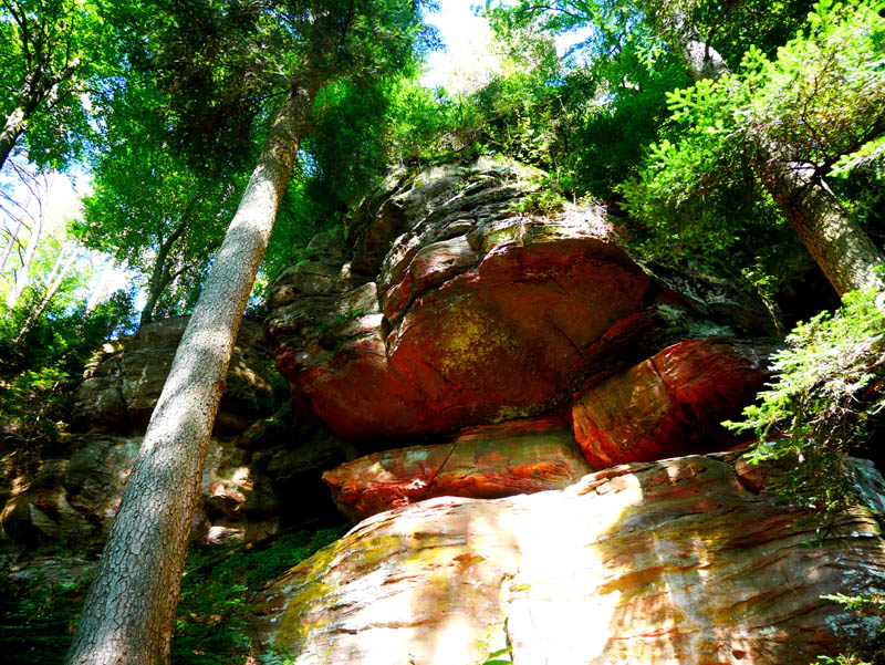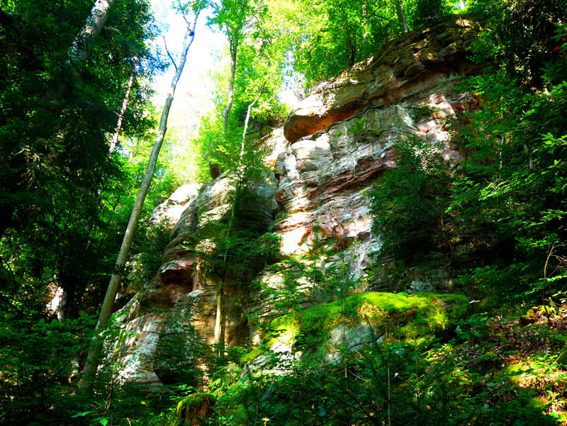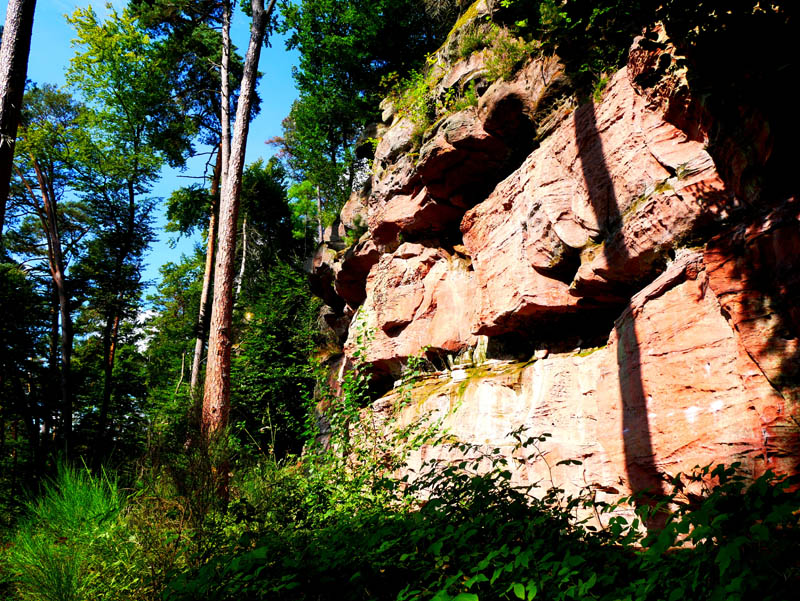 Wir beginnen die Tour in der Schwarzbachstraße von Heltersberg. Auf dem dort anzutreffenden Wanderparkplatz steht ausreichender und kostenloser Parkraum zur Verfügung. Nach der Durchwanderung der Schwarzbachstraße verlassen wir die Ortsbebauung. Die Beschilderung des Pfälzer Waldpfades führt uns am Westrichhof vorbei und mit einem fein geschotterten breiten Forstweg in den Wald hinein. Sanft bergab verlaufend vollzieht die nunmehr pfadige Route nach vier Wanderkilometern einen scharfen Linksschwenk. Wenig später gelangen die Wanderer zu einer Ruhebank, die wir zur ersten Wanderrast nutzen. Eine dort angebrachte Infotafel beschreibt das imposante, 673 Meter lange Felsenband des Seelenfelsens, an dem wir von nun an auf einem felsigen Pfad in ständigem Auf und Ab entlang marschieren. Die gigantische Buntsandsteinformation ist nach dem königlichen Revierförster Jakob Seel benannt, der nächtens im Jahre 1839 von den Felsen stürzte und sich tödliche Verletzungen zuzog.