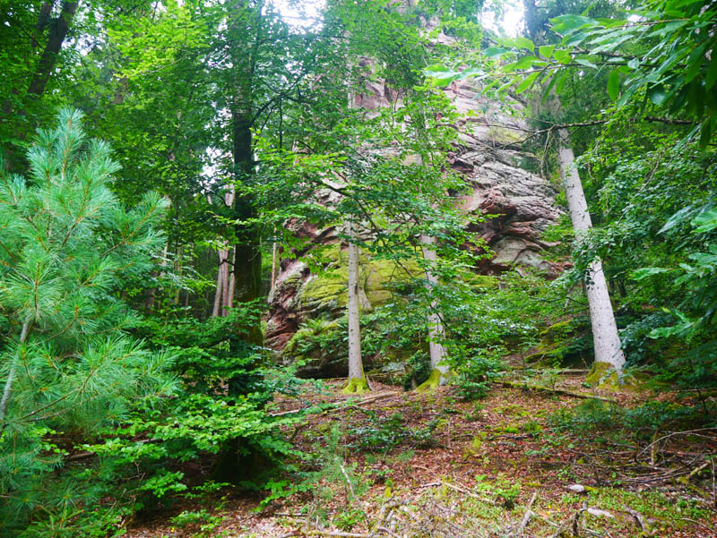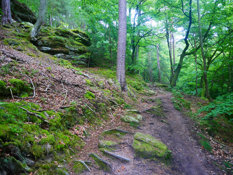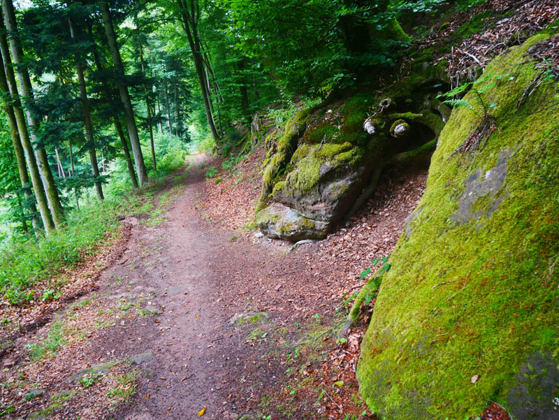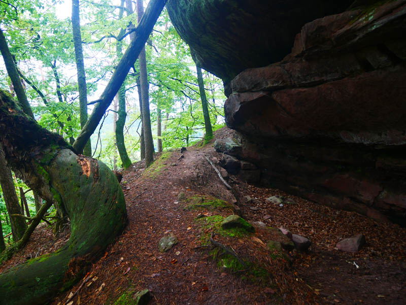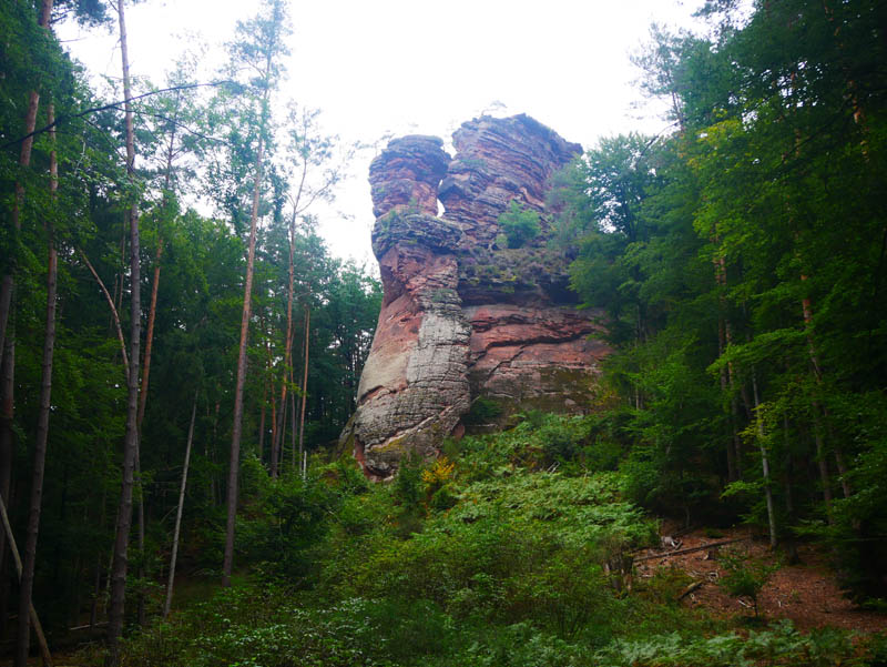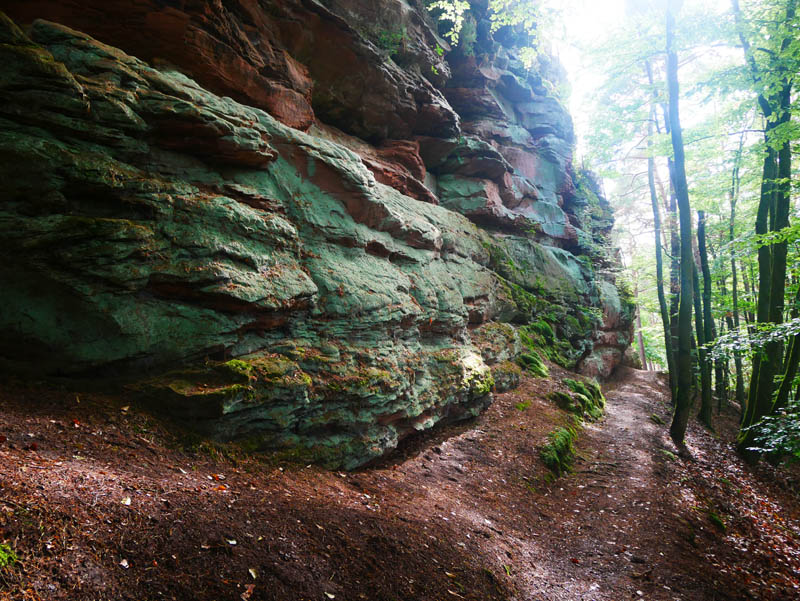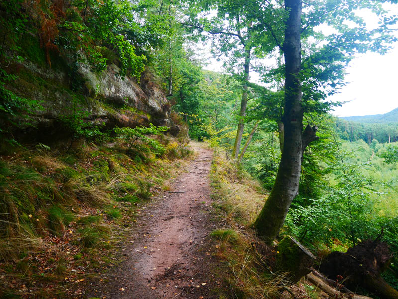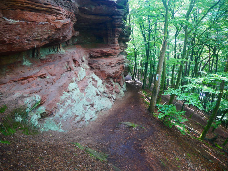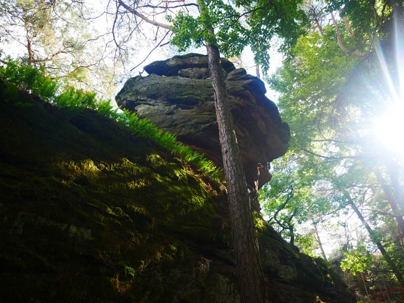 Wir starten in die 7. Etappe des Pfälzer Waldpfades am Bahnhof von Hauenstein. Hinter dem Bahnhofsgebäude am Rand der Alten Bundesstraße finden wir kostenlosen Parkraum vor. Über die Pirmasenser Straße, vorbei an der Deutschen Schuhmeile, verlassen wir die Bebauung von Hauenstein. Nachdem der Parkplatz des Penny-Marktes passiert wurde steigen die Wanderer mit einem schmalen Pfad rechts abzweigend von der Pirmasenser Straße zum Mondfels hinauf. Er ermöglicht einen herrlichen Ausblick auf Hauenstein. Danach führen breite Forstwege und schmale Waldpfade durch den bewaldeten Hang zum Aussichtspunkt „Am Steinbruch“. Erneut zeigt sich die zurückbleibende Schuhmetropole Hauenstein mit der ortsbildprägenden doppeltürmigen Christkönigskirche. Der Pfälzer Waldpfad läuft in der Folge an bizarren Buntsandsteinformationen vorbei und streift die Hauensteiner Ortslage „Im Mittelpferch“. Wenig später wird ein Grillplatz angelaufen, den wir zu einer ersten Wanderpause nutzen.