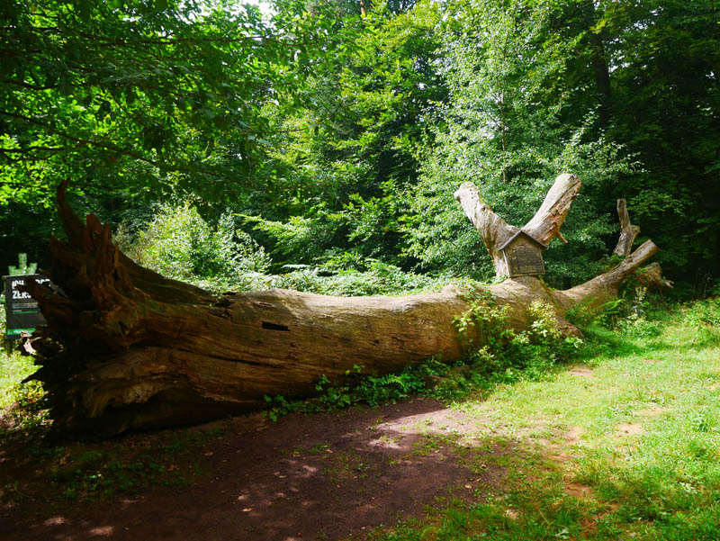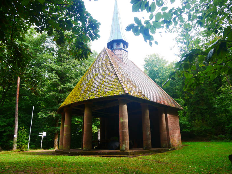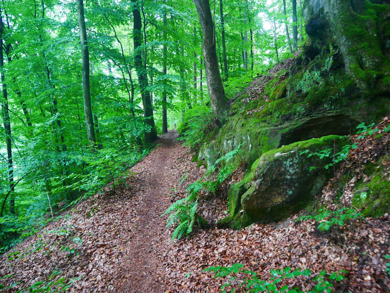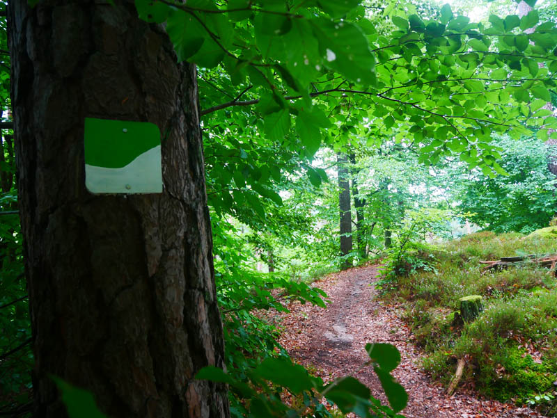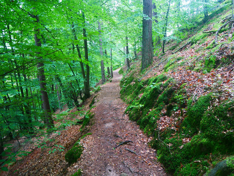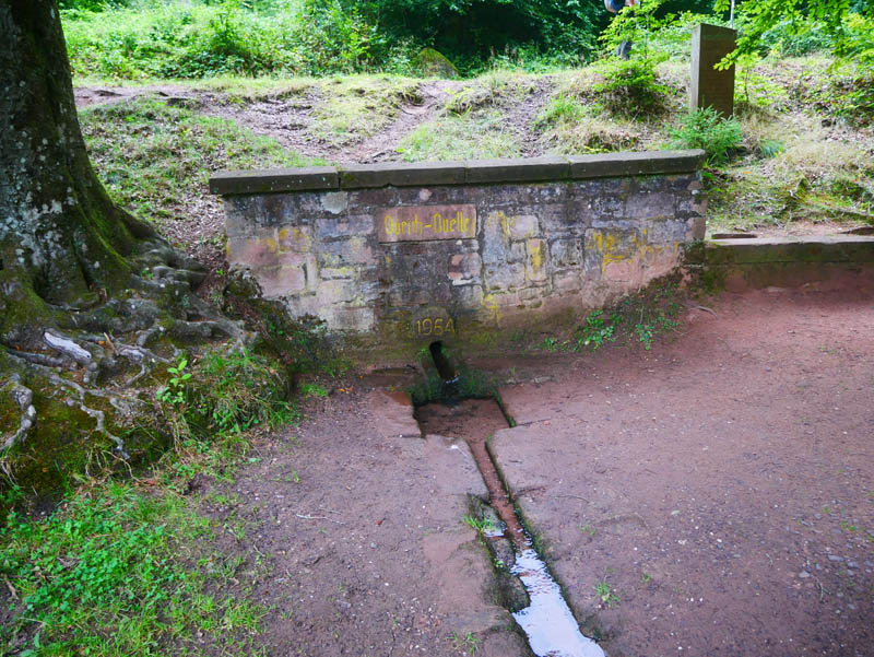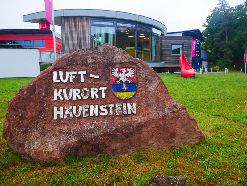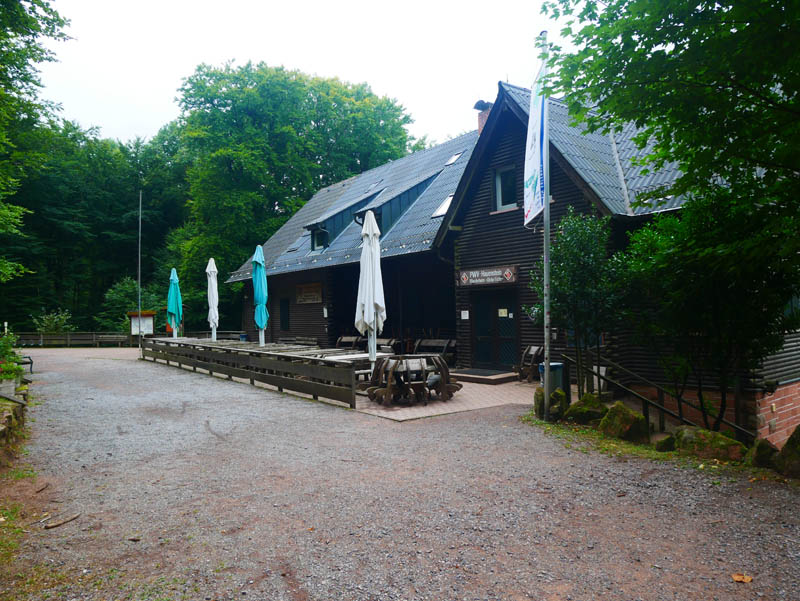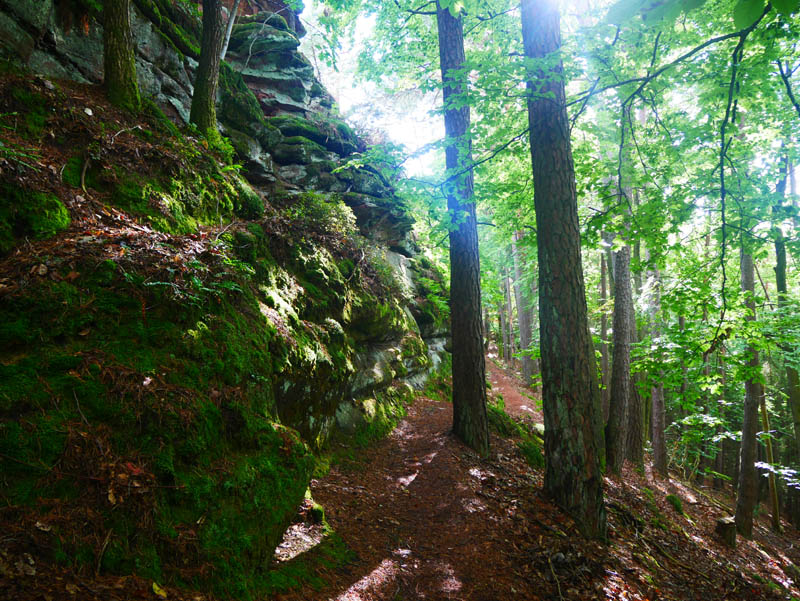 Wir starten in die 7. Etappe des Pfälzer Waldpfades am Bahnhof von Hauenstein. Hinter dem Bahnhofsgebäude am Rand der Alten Bundesstraße finden wir kostenlosen Parkraum vor. Über die Pirmasenser Straße, vorbei an der Deutschen Schuhmeile, verlassen wir die Bebauung von Hauenstein. Nachdem der Parkplatz des Penny-Marktes passiert wurde steigen die Wanderer mit einem schmalen Pfad rechts abzweigend von der Pirmasenser Straße zum Mondfels hinauf. Er ermöglicht einen herrlichen Ausblick auf Hauenstein. Danach führen breite Forstwege und schmale Waldpfade durch den bewaldeten Hang zum Aussichtspunkt „Am Steinbruch“. Erneut zeigt sich die zurückbleibende Schuhmetropole Hauenstein mit der ortsbildprägenden doppeltürmigen Christkönigskirche. Der Pfälzer Waldpfad läuft in der Folge an bizarren Buntsandsteinformationen vorbei und streift die Hauensteiner Ortslage „Im Mittelpferch“. Wenig später wird ein Grillplatz angelaufen, den wir zu einer ersten Wanderpause nutzen.