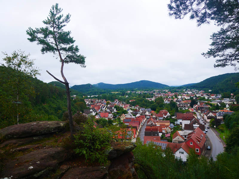 Gleich zu Beginn der Tour fällt vom Mondfelsen ein erregender Blick auf den Startort Hauenstein