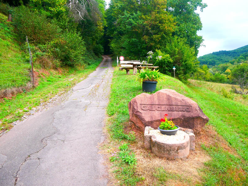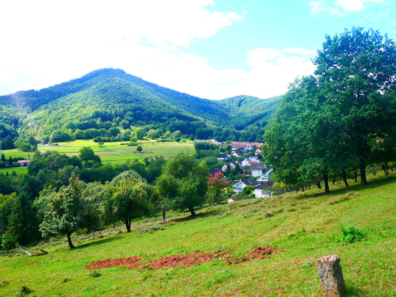 Wir beginnen die Streckenwanderung auf dem Wanderparkplatz an der L506 ausgangs der Ortschaft Dernbach. Hier steht kostenloser Parkraum in ausreichender Zahl zur Verfügung. Am Rand des Parkplatzes steht ein Sühne- oder Gedenkkreuz aus Buntsandstein, dass im Jahre 1593 erstmals urkundlich erwähnt wurde. Es erinnert an eine ungesühnte Bluttat oder an einen in ungeweihter Erde bestatteten Toten. Wir wandern ein kurzes Stück entlang der Landstraße nach Dernbach hinein und folgen dann der rechts abzweigenden Beschilderung des Weinsteigs auf asphaltiertem Grund zum Galgenberg hinauf. Lang anhaltend geht es gleich zu Beginn stramm bergan. Auf der Anhöhe blicken wir auf den Startort Dernbach, der tief unten im Tal zurück bleibt. Einer dort anzutreffenden Infotafel ist zu entnehmen, das die Gewannbezeichnung „Galgenberg“ daran erinnert, dass die Erhebung vor 1506 als Richtplatz für die Ortschaften Ramberg und Dernbach diente. Urteile des Amtes Scharfeneck und der Grafen von Löwenstein wurden hier vollstreckt.