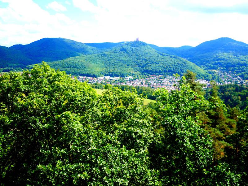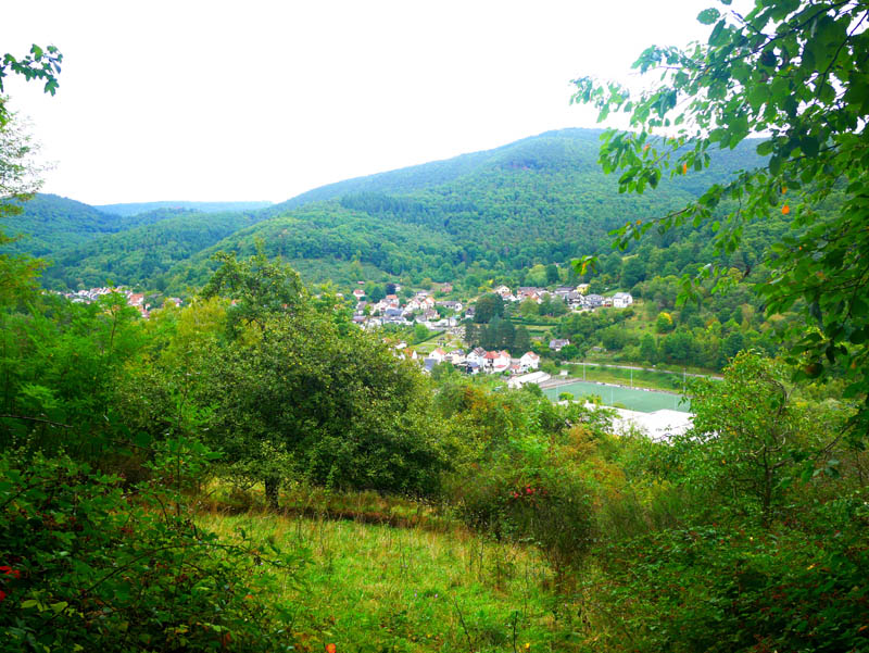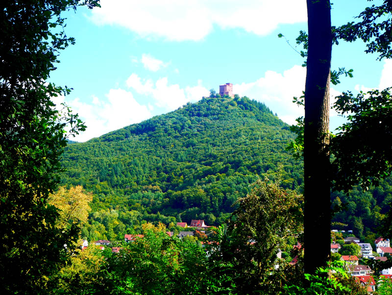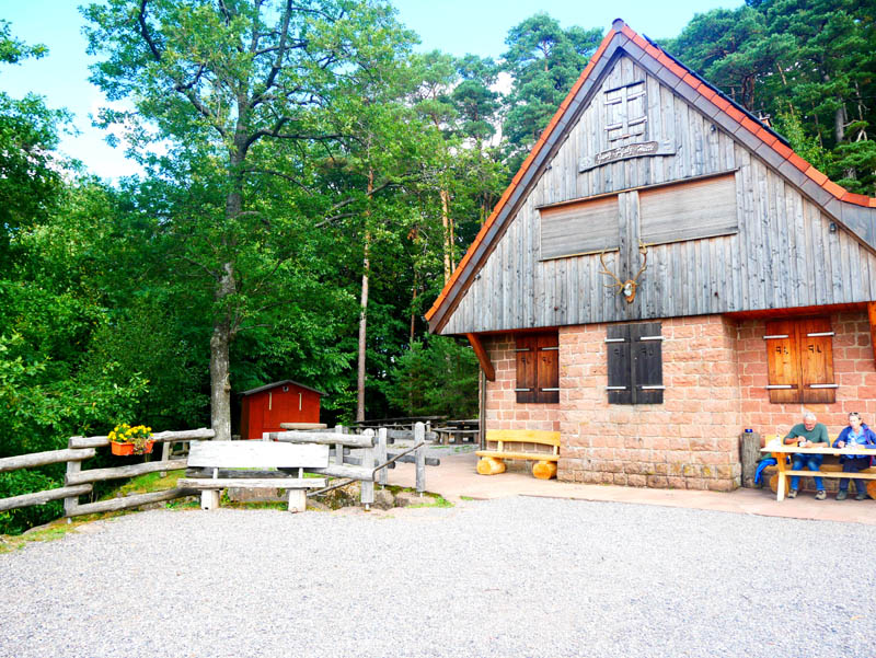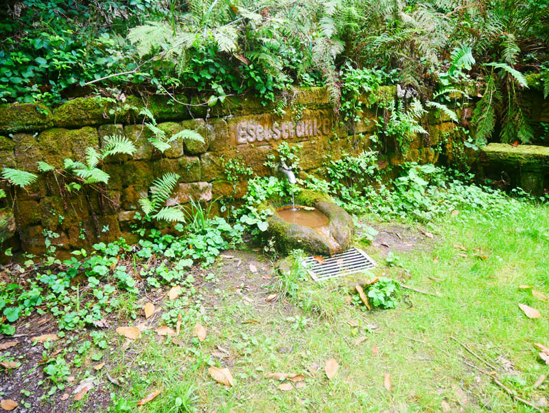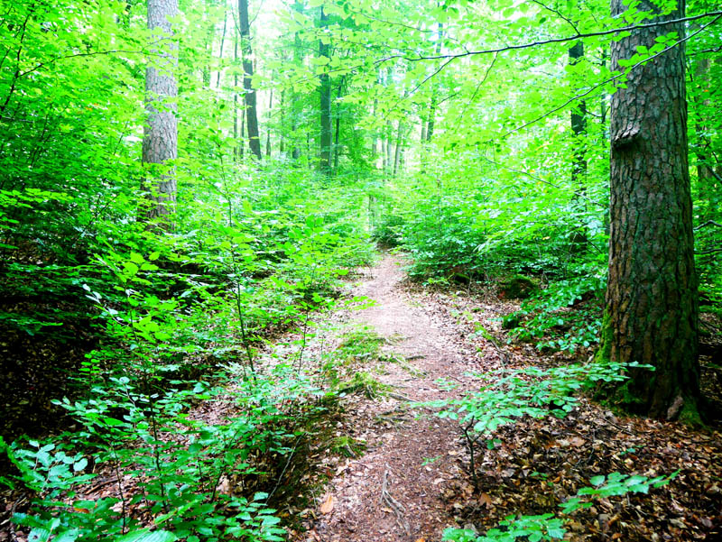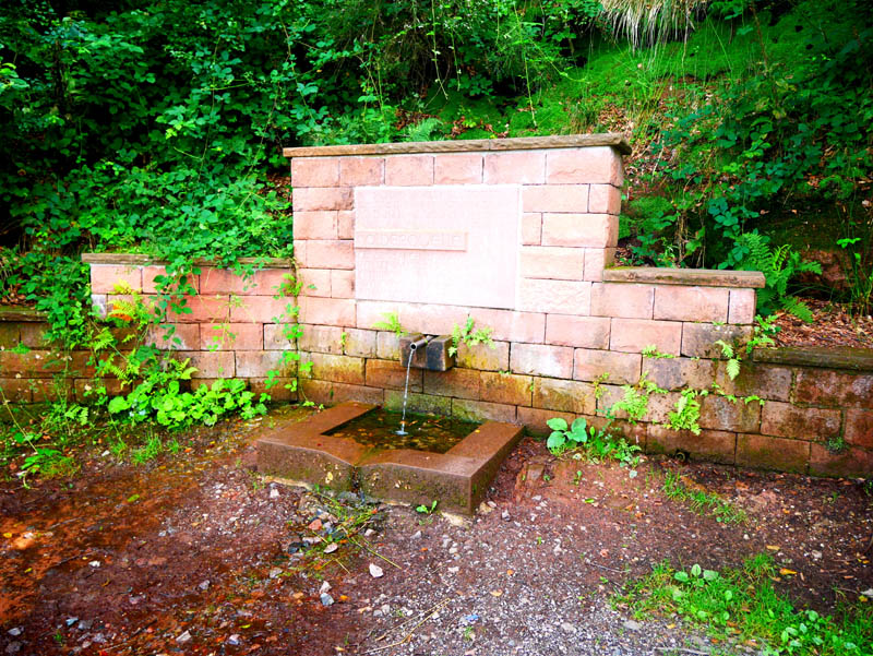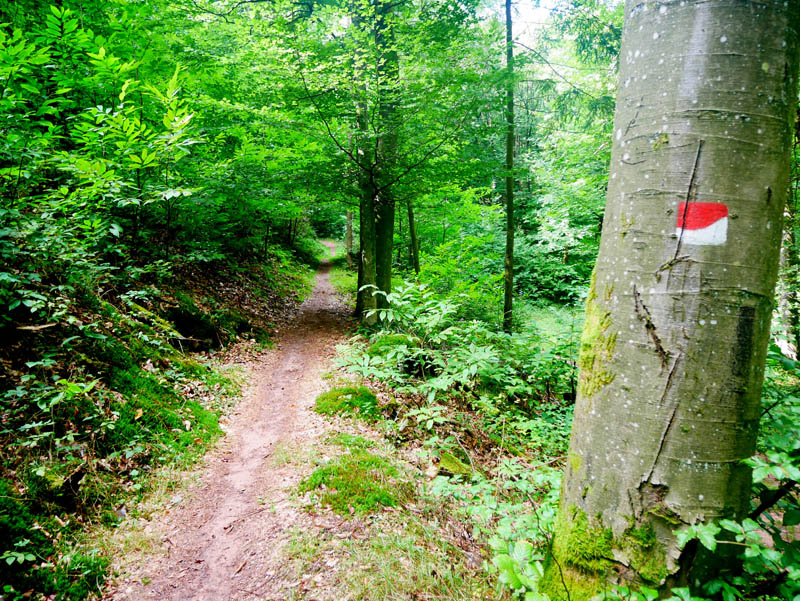 Von dieser schaurigen Stelle geht es weiterhin bergauf und schließlich in den Wald hinein. Der Pfälzer Weinsteig verflacht dann und führt an der Fachklinik Eußerthal vorbei. Die Reha-Einrichtung für Suchtkranke liegt mitten im Wald. Durch die Hänge des Walterkopfes werden in der Folge breite, meist recht langweilige Forstwege beschritten. Sie führen uns bergab in den Pfälzerwaldort Eußerthal. Hier bewundern die Wanderer die aus heimischem Buntsandstein erbaute Kirche der ehemaligen Zisterzienserabtei. Die im Jahre 1262 erbaute sehenswerte Pfeilerbasilika steht unter dem Patrozinium des Hl. Berhard von Clervaux und dient heute als katholische Pfarrkirche des Pfälzerwaldortes. Vorbei am Friedhof verlassen wir Eußerthal, wandern durch Wiesengelände am Waldrand entlang und nutzen eine dort anzutreffende Sitzecke zur Wanderrast. Danach wird ein winziges Gewässer überschritten und auf einem schmalen Waldpfad recht steil zur Eselstränke hinauf gestiegen. Hier tritt frisches Quellwasser aus, das sich zum Auffüllen des Getränkevorrates eignet.