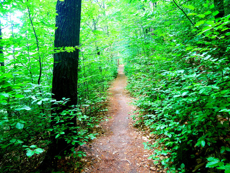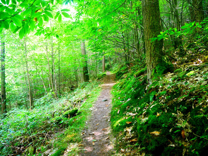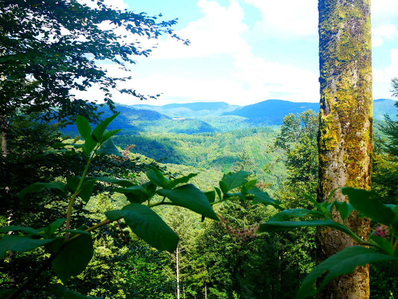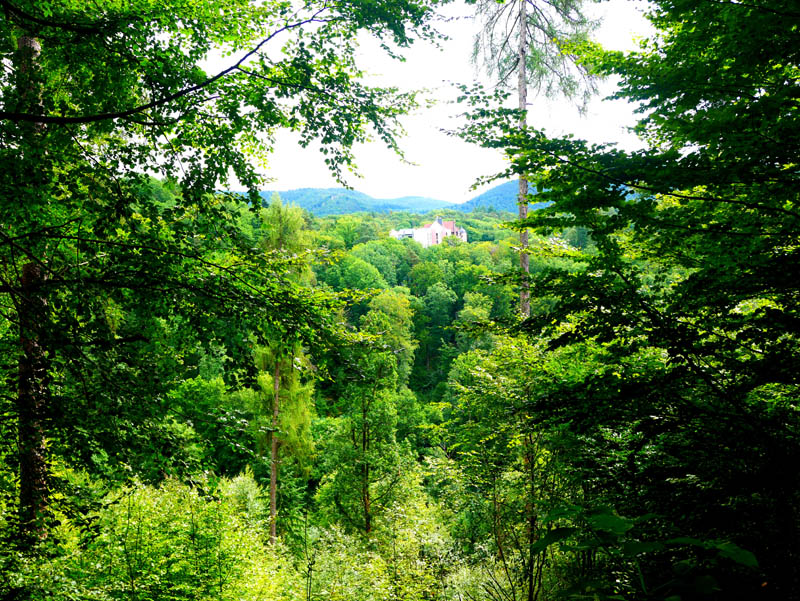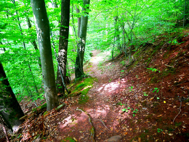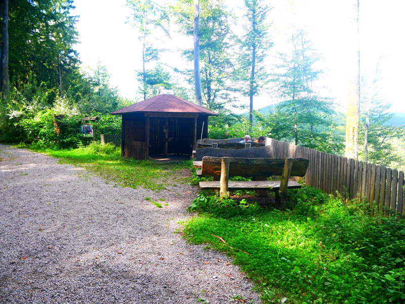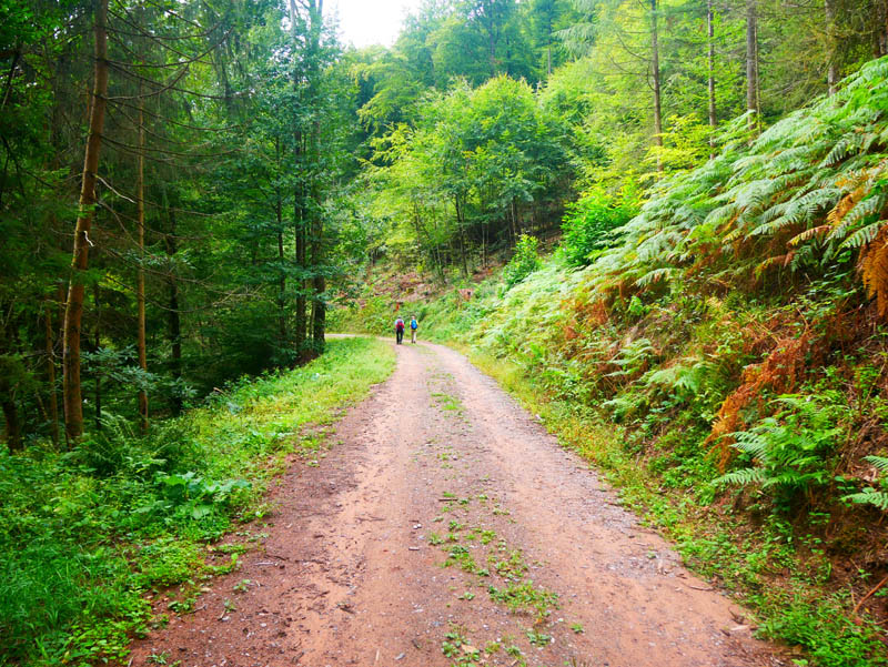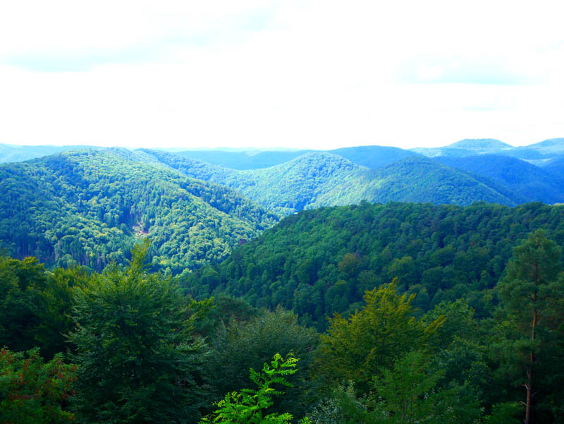 Von dieser schaurigen Stelle geht es weiterhin bergauf und schließlich in den Wald hinein. Der Pfälzer Weinsteig verflacht dann und führt an der Fachklinik Eußerthal vorbei. Die Reha-Einrichtung für Suchtkranke liegt mitten im Wald. Durch die Hänge des Walterkopfes werden in der Folge breite, meist recht langweilige Forstwege beschritten. Sie führen uns bergab in den Pfälzerwaldort Eußerthal. Hier bewundern die Wanderer die aus heimischem Buntsandstein erbaute Kirche der ehemaligen Zisterzienserabtei. Die im Jahre 1262 erbaute sehenswerte Pfeilerbasilika steht unter dem Patrozinium des Hl. Berhard von Clervaux und dient heute als katholische Pfarrkirche des Pfälzerwaldortes. Vorbei am Friedhof verlassen wir Eußerthal, wandern durch Wiesengelände am Waldrand entlang und nutzen eine dort anzutreffende Sitzecke zur Wanderrast. Danach wird ein winziges Gewässer überschritten und auf einem schmalen Waldpfad recht steil zur Eselstränke hinauf gestiegen. Hier tritt frisches Quellwasser aus, das sich zum Auffüllen des Getränkevorrates eignet.