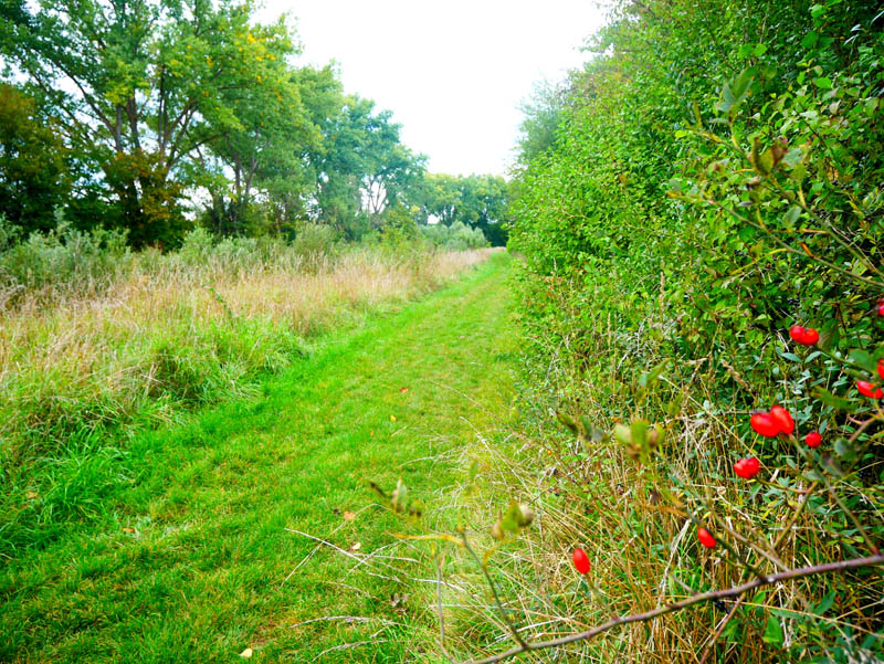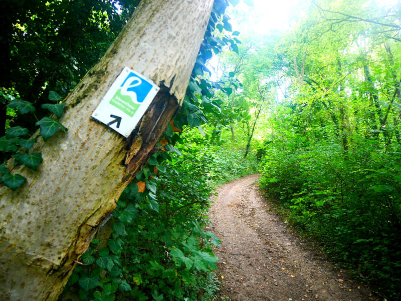 Die Zuwegung der Hiwweltour Stadeker Warte führt durch das Naturschutzgebiet Woogwiesen