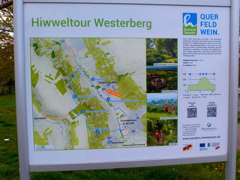 Mit ihrem ausgesprochen kurzweiligen und überraschend aussichtsreichen Streckenverlauf punktet die Hiwweltour Westerberg im Reigen der rheinhessischen Rundwanderwege in besonderem Maße. So kann man, neben der Wanderung durch das idyllische Selzbachtal gleich zu Beginn und zum Schluss der Tour, im Mittelteil vom lang gestreckten Höhenzug des Westerberges herrliche Weitblicke in das Land der tausend Hügel genießen. Bei guter Fernsicht schweift von hier aus auch der Blick über das Rheintal hinweg bis weit in den Taunus hinein. Das Streckenprofil der rund zwölf Kilometer langen Runde umfasst ausschließlich breite Wiesen-, Wald-, und Weinbergwege. Schmale Pfade werden nicht begangen.