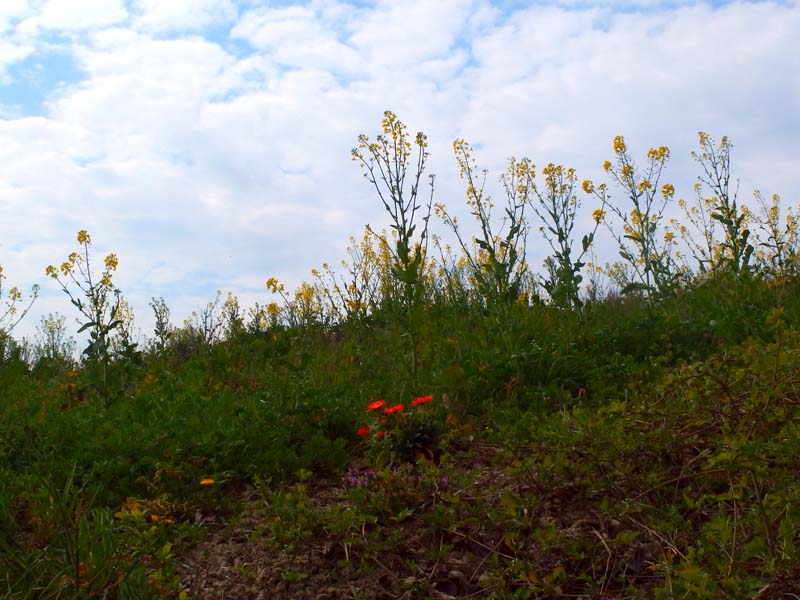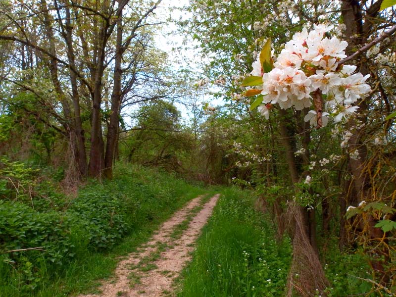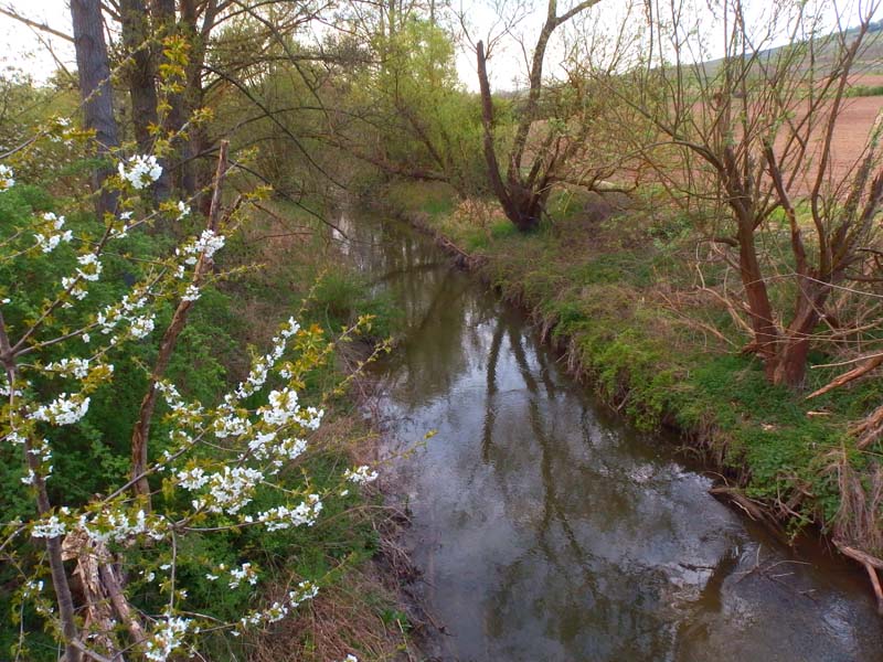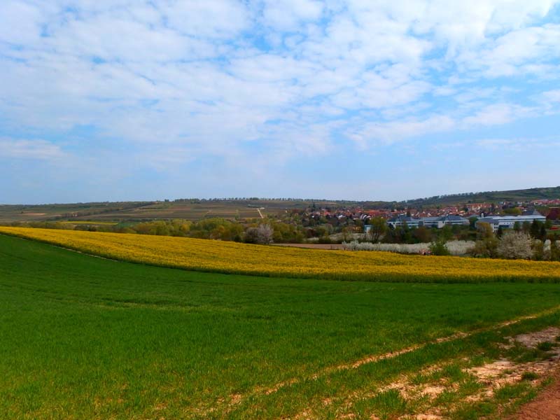 Am Wanderparkplatz der Sportanlage von Großwinternheim, einem Stadtteil von Ingelheim, starten wir von der Schlossbergstraße aus in die Hiwweltour Westerberg und folgen der kurzen Zuwegung zur Selzbrücke hinunter. Wir überschreiten das kleine, träge dahin fließende Gewässer und folgen der Beschilderung scharf links schwenkend in die Selztalauen hinein. Hier zeigt sich eine typische Ufervegetation, die jetzt im zeitigen Frühjahr zu grünen beginnt. Auch an den mächtigen Weidengehölzen zeigt sich erstes zartes Blattgrün. Die Route läuft ständig an der Selz entlang in das Naturschutzgebiet Gartenwiese hinein. Niedergehölz, Hecken, heimische Wiesenblumen, gelb blühende Rapsfelder und die aufgebrochene Kirschblüte in den Obstplantagen gestalten das Landschaftsbild. Besondere Aufmerksamkeit erregen dann großflächige Riedbestände am Ortsrand von Schwabenheim. Allerdings zeigen sich die Schilfpflanzen noch in winterlichen Brauntönen.