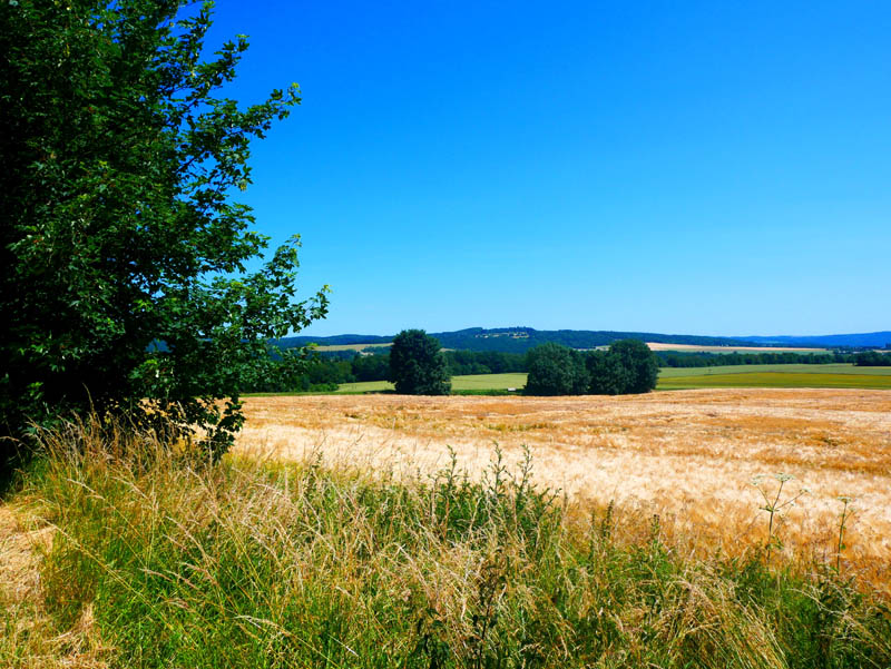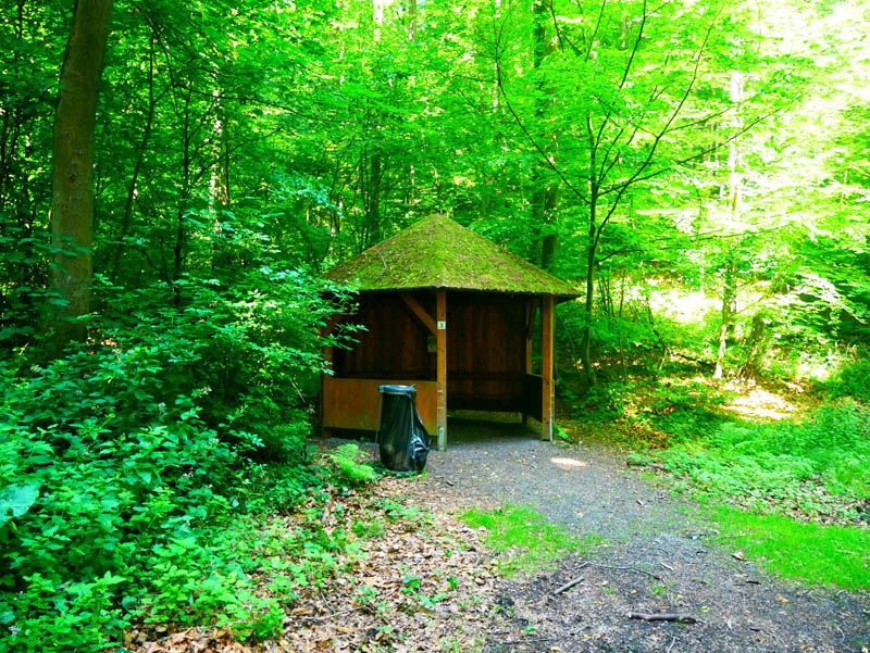 Wir folgen der Beschilderung des Traumpfädchens und gelangen kurz darauf zum Panoramapunkt "Schönste Weinsicht Mittelrhein 2016". 5.000 Personen nahmen an einer Onlinebefragung teil, um die schönste Weinsicht des Jahres 2016 im Welterbe Mittelrheintal zu bestimmen. Von einer Ruhebank fällt hier ein fantastischer Blick rheinabwärts ins breite Stromtal und auf die Leutesdorfer Weinlagen am rechten Rheinufer. Der markante, lotrecht ins Rheintal abbrechende Burgfelsen der Burg Hammerstein und die Ortschaften Brohl und Rheinbrohl sind von diesem hervorragenden Aussichtspunkt ebenfalls gut zu sehen. Mit dem altehrwürdigen Rheinhöhenweg und dem Europäischen Fernwanderweg E8 führt das Traumpfädchen ständig an der Hangkante der Rheinberge entlang. Mehrmals zeigt sich durch das sommerliche Geäst tief untern im breiten Flusstal Vater Rhein. Die kurz darauf anzulaufende Schutzhütte Kleiner Stern nutzen wir für eine kurze Trinkpause.