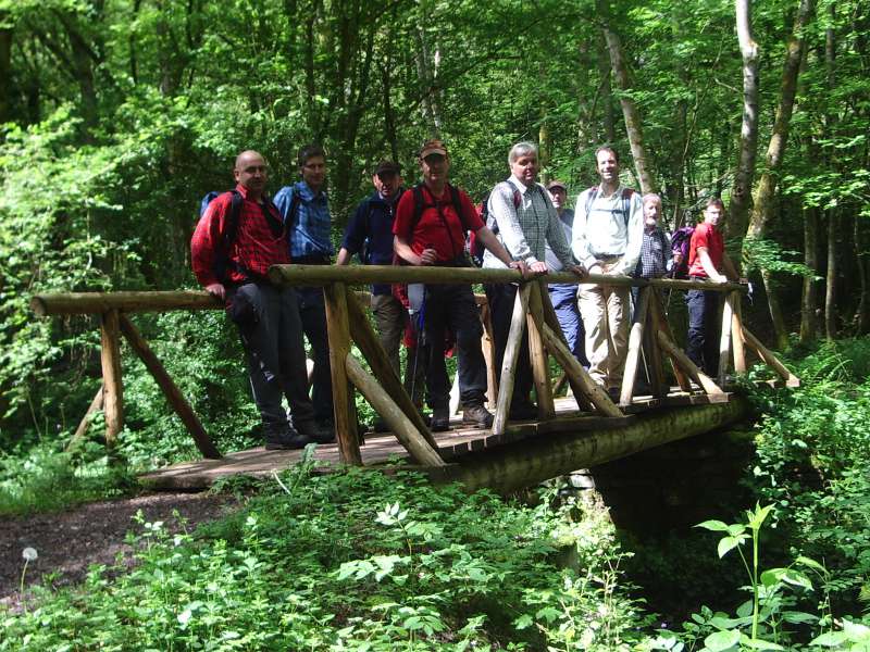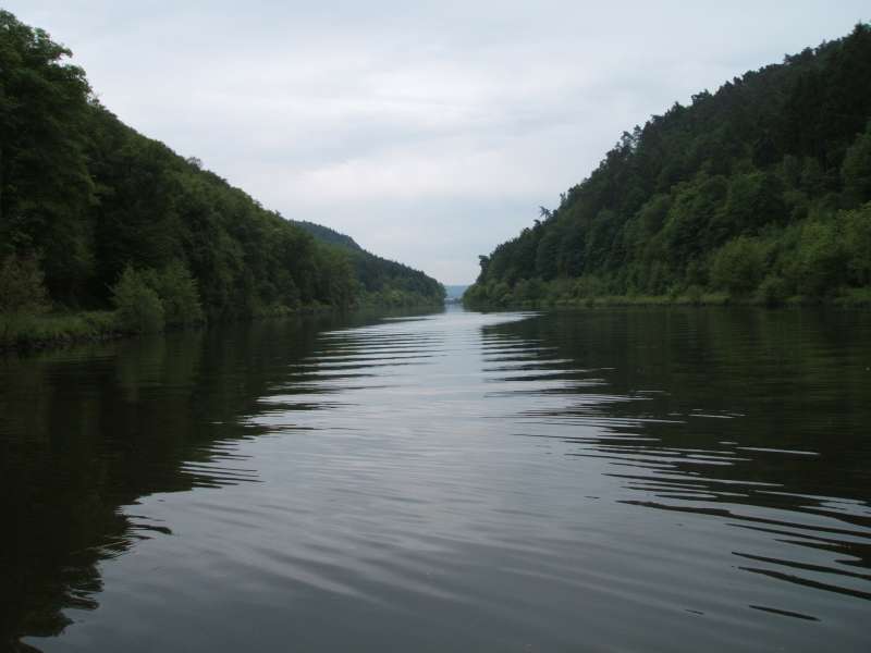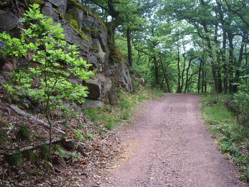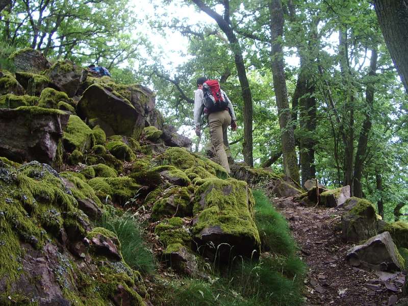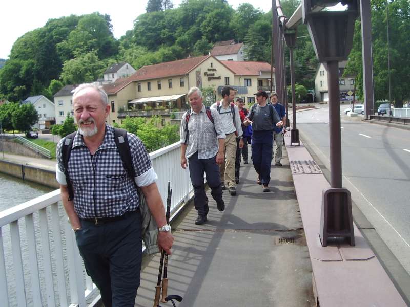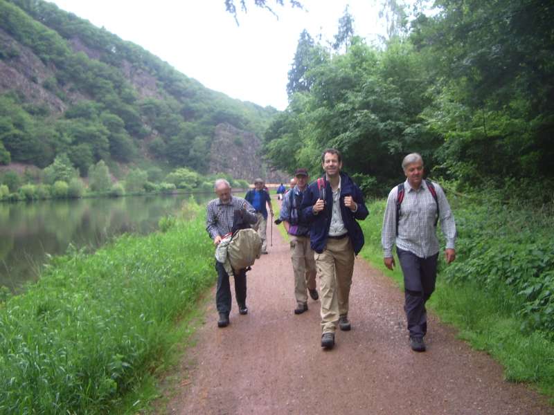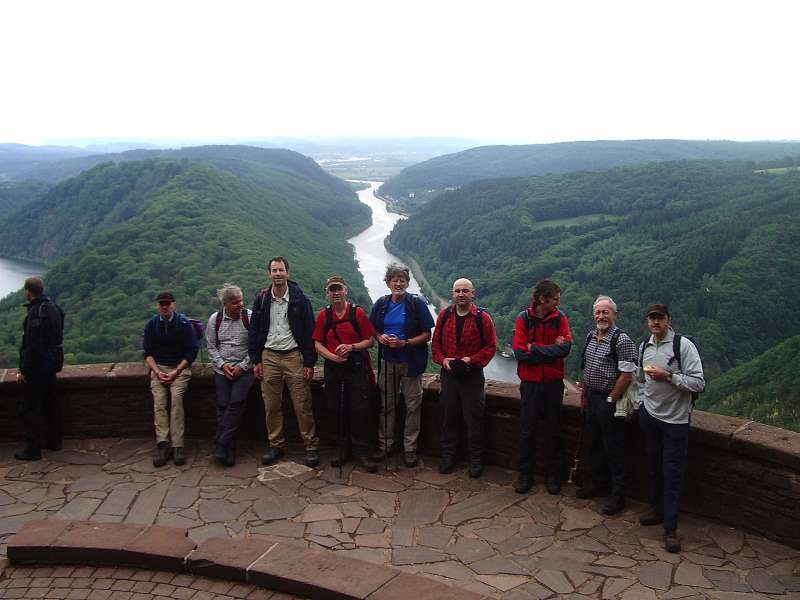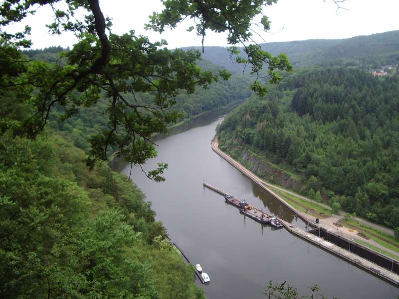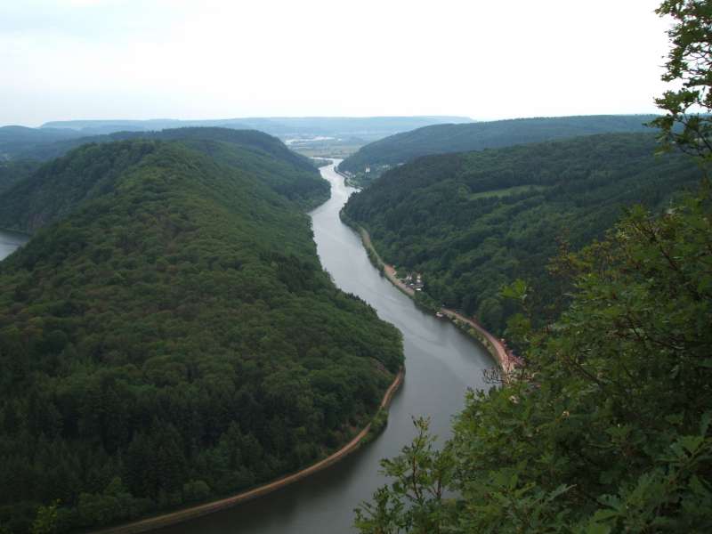 Von Mettlach steigen wir ausgangs der Bebauung in den Burgberg hinein und durch lichten Hochwald zu einem ersten Aussichtspunkt hinauf. Von dem bewaldeten Höhenzug fällt der Blick auf die Saarschleuse tief unten im Flusstal.