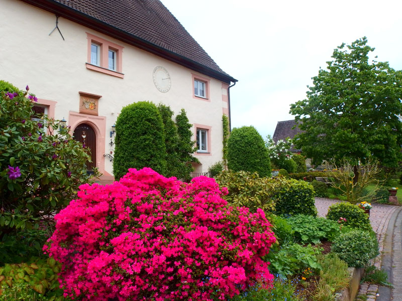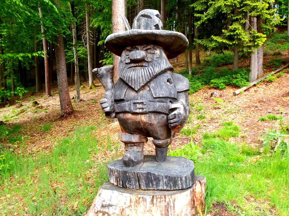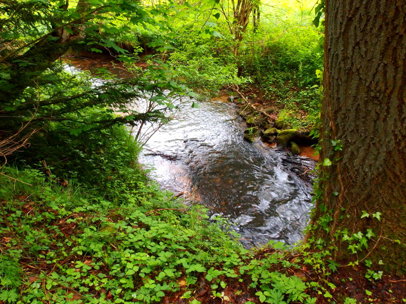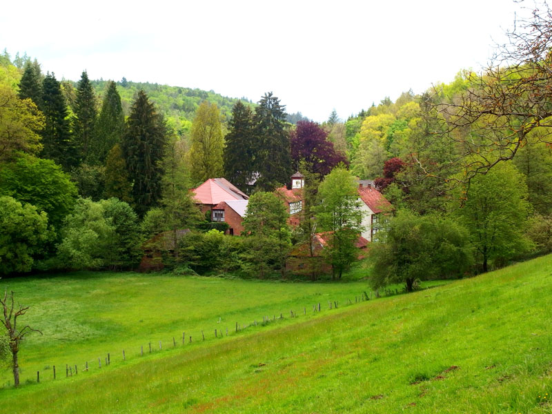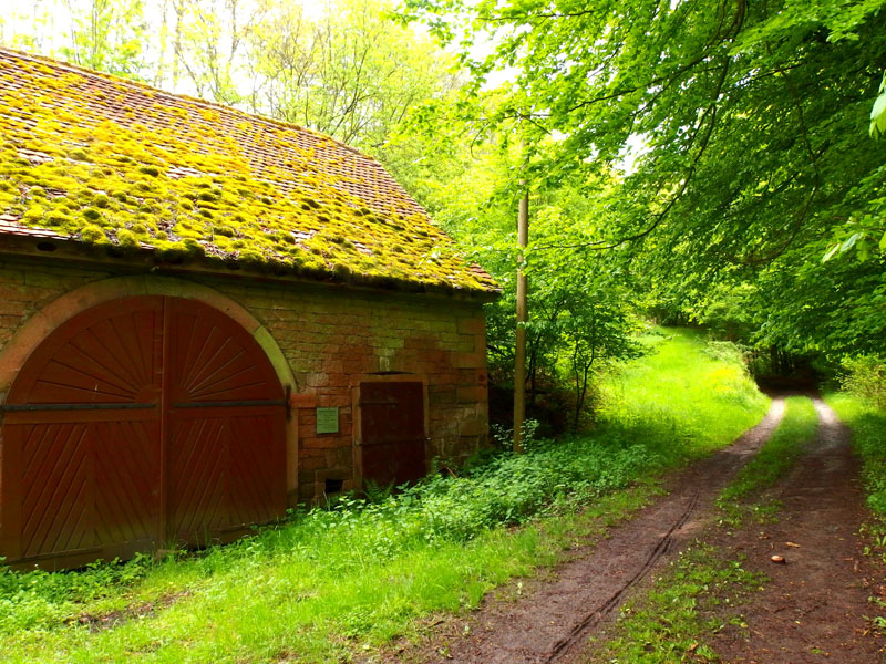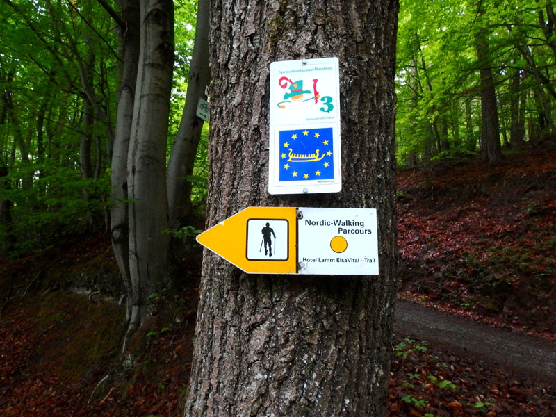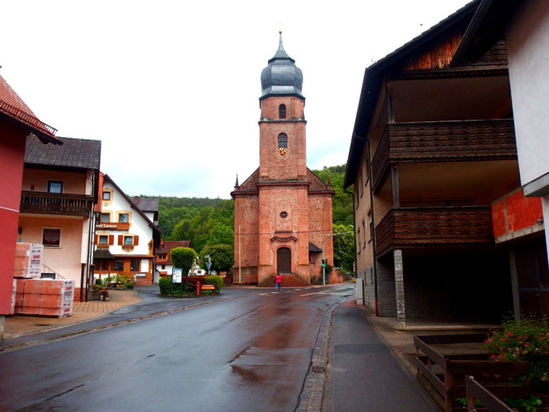 Ein idealer Startpunkt in den Räuberland-Pfad befindet sich auf dem Parkplatz an der Martinuskirche in Heimbuchenthal. Hier steht kostenloser Parkraum zur Verfügung. Schon nach wenigen Metern führt uns die Beschilderung "Räuberland-Rundweg 3" am Hotel Lamm vorbei zu einem mächtigen Wasserrad hinüber, das vom Elsavabach angetrieben wird. Es handelt sich dabei um das heute noch intakte Mühlrad der ehemaligen Walzenmühle. Hinter dem Wasserrad steigt der Räuberland-Pfad steil in den Wald hinein. Geländerbewehrt geht es auf einem schmalen Waldpfad stetig stramm bergan. Weiter oben tritt die Route aus dem Wald heraus und ermöglicht einen schönen Ausblick auf den Start- und Zielort Heimbuchenthal im Elsavatal.